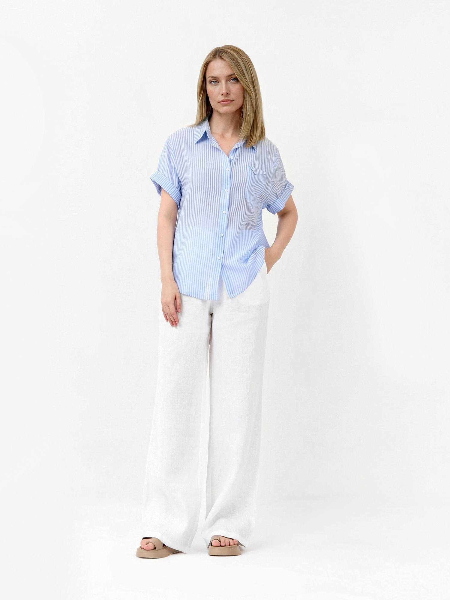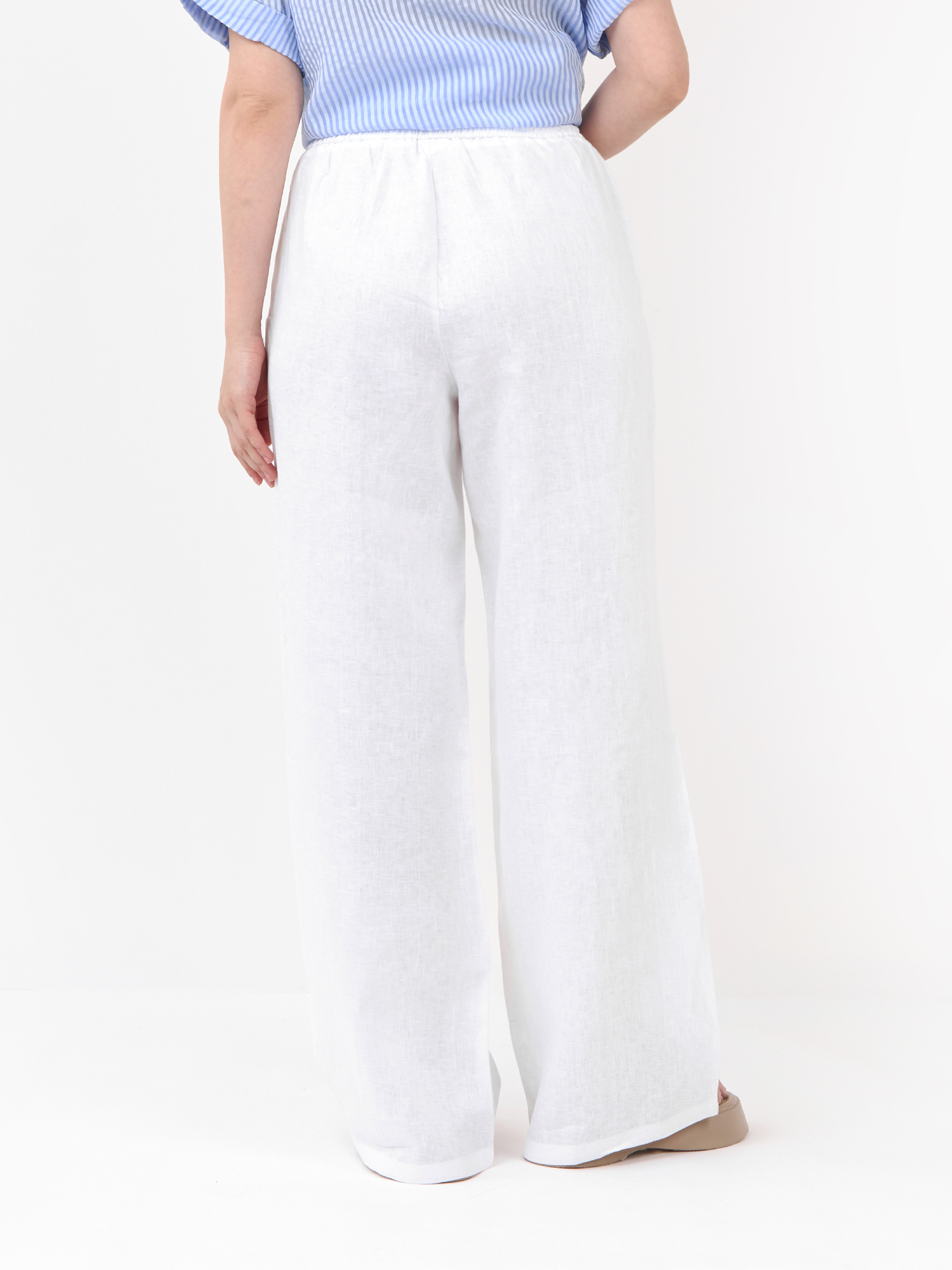Элегантные летние женские брюки итальянского бренда FABRETTI белого цвета.Свободный прямой крой брюк отлично подходит для жаркой летней погоды. На поясе брюки собраны на широкую резинку с кулиской. По бокам сделаны втачные карманы.Брюки выполнены из натурального льна с узнаваемой фактурой. Легкий дышащий материал хорошо подходит для жаркой погоды и роскошно смотрится в образе, добавляя ему благородства.Эта модель прекрасно подходит не только для пляжного отдыха, но и для летнего городского образа.