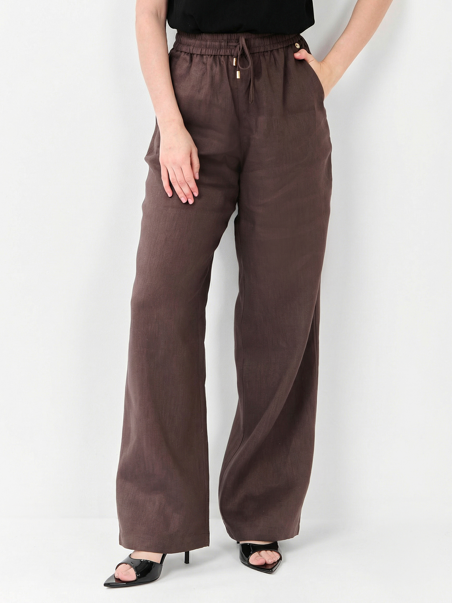 Элегантные летние женские брюки итальянского бренда FABRETTI коричневого цвета.Свободный прямой крой брюк отлично подходит для жаркой летней погоды. На поясе брюки собраны на широкую резинку с кулиской. По бокам сделаны втачные карманы.Брюки выполнены из натурального льна с узнаваемой фактурой. Легкий дышащий материал хорошо подходит для жаркой погоды и роскошно смотрится в образе, добавляя ему благородства.Эта модель прекрасно подходит не только для пляжного отдыха, но и для летнего городского образа.