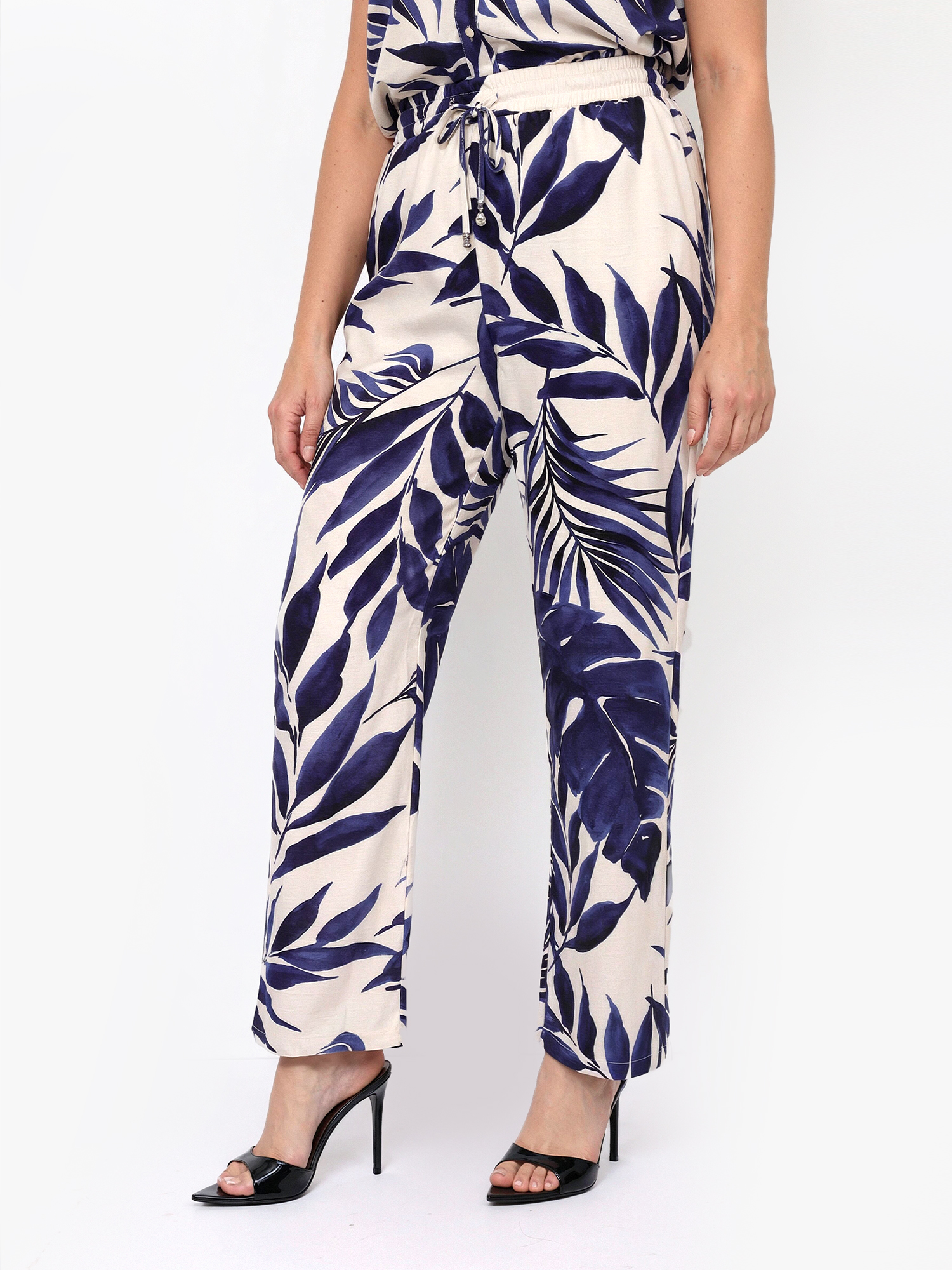 Элегантные летние женские брюки итальянского бренда FABRETTI светло-бежевого цвета с растительным узором, имитирующим рисунок тушью глубокого синего цвета.Прямой крой брюк отлично подходит для жаркой летней погоды. На поясе брюки собраны на широкую резинку с кулиской. По бокам сделаны врезные карманы.Брюки выполнены из вискозы с добавлением льна – легких летних материалов, которые хорошо подходят для жаркой погоды.Эта модель прекрасно подходит не только для пляжного отдыха, но и для летнего городского образа. Она хорошо сочетается с однотонными блузами, футболками или топами, а также аксессуарами натурального бежевого или глубокого синего цветов.