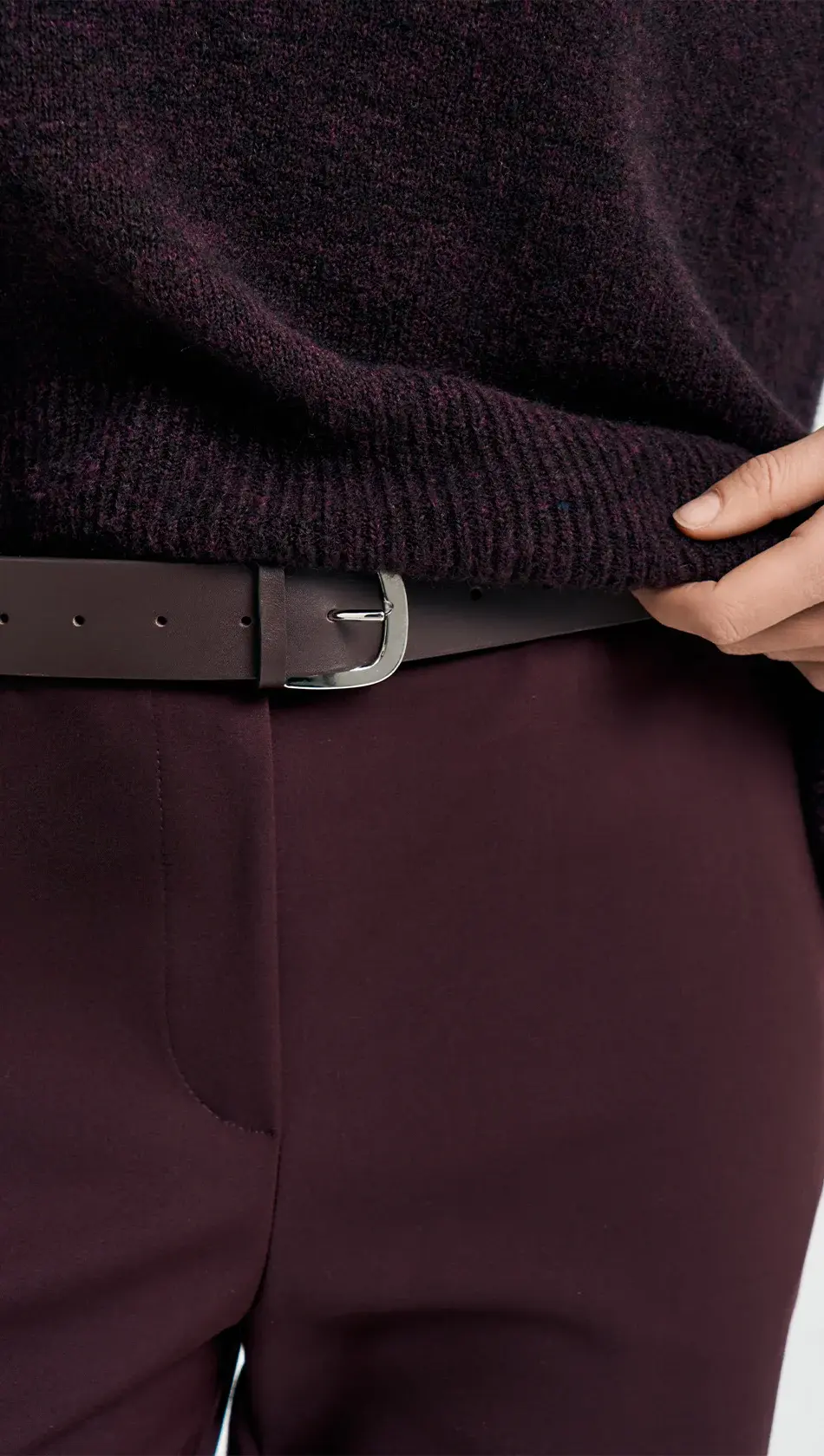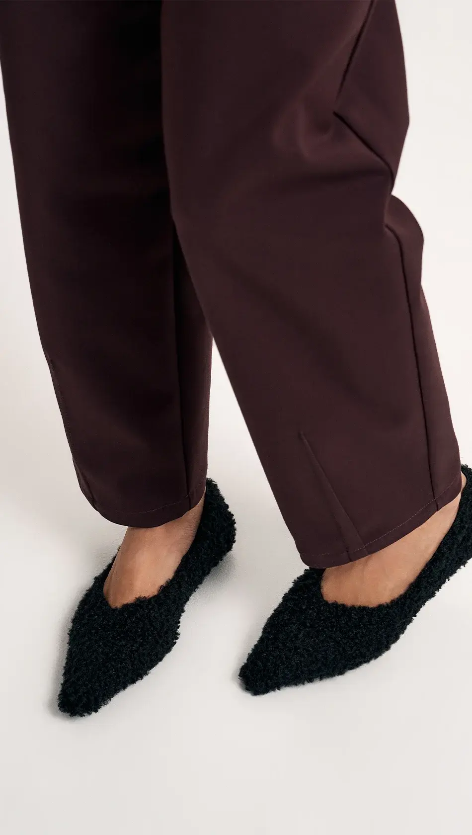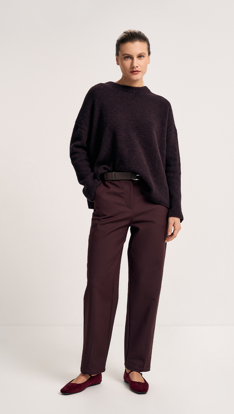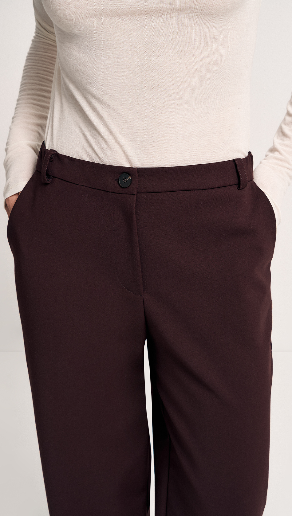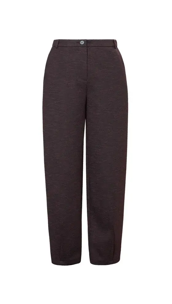 Брюки О-образного силуэта из плотной хлопковой костюмной ткани. Пояс - частично собран на резинку. По низу формообразующие вытачки. На задних половинках прорезные карманы с листочкой фантазийной формы.