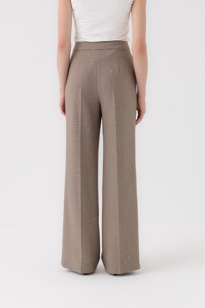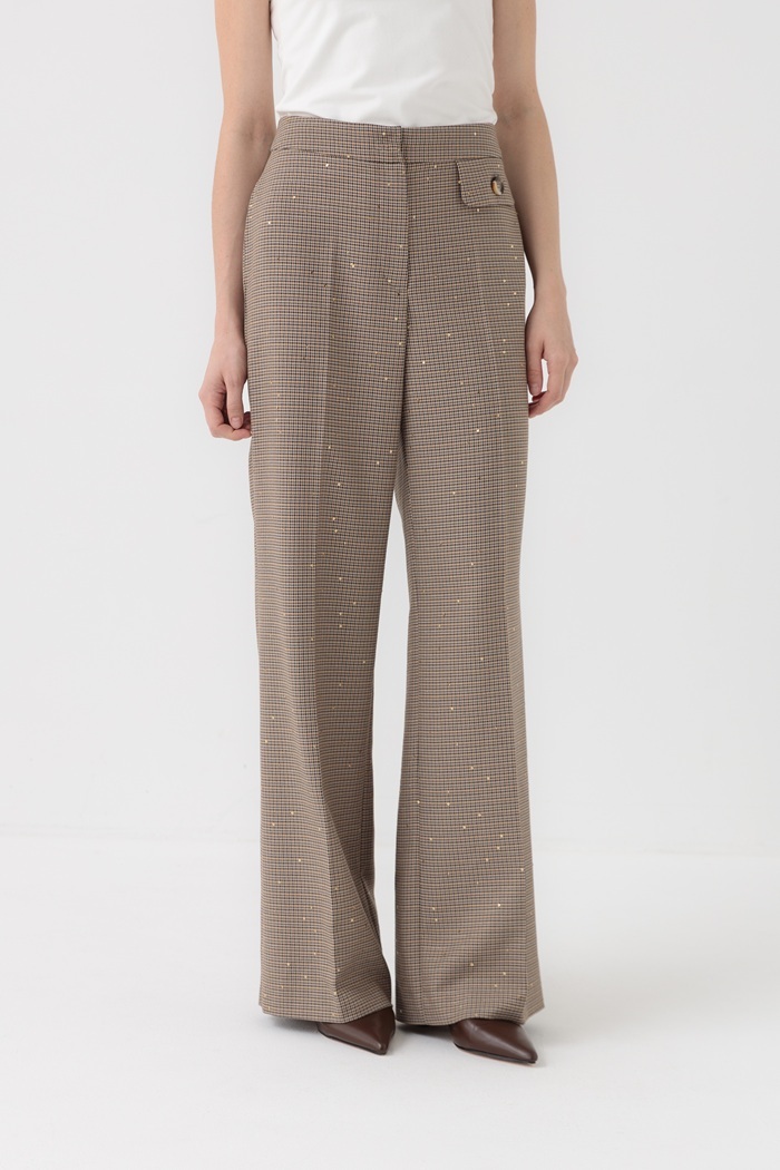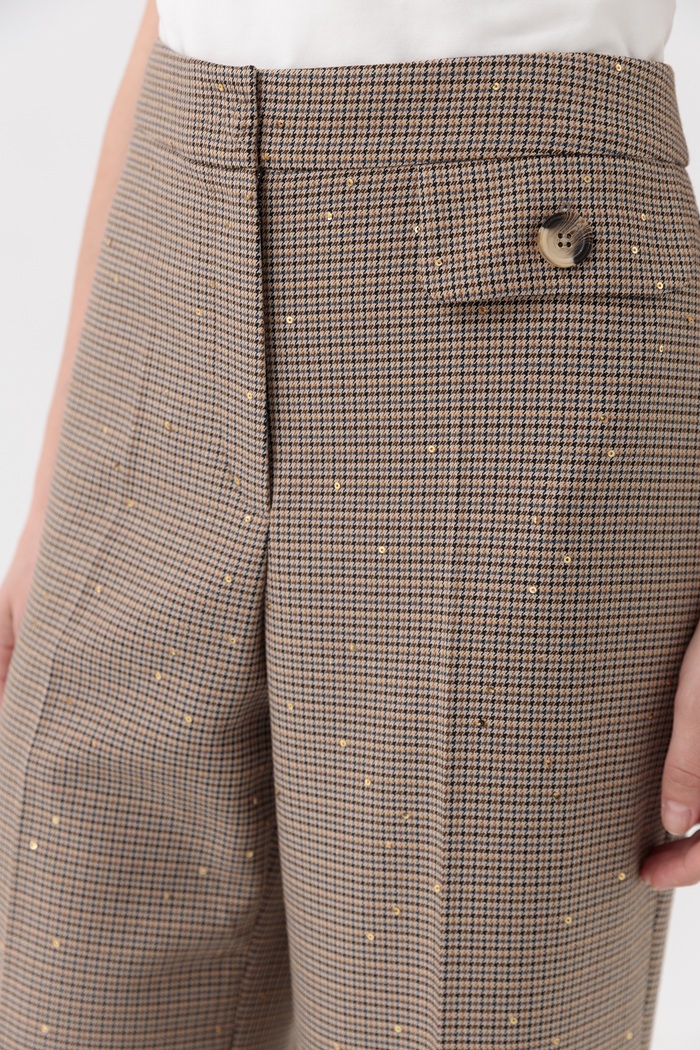 Брюки «ТЕЛЬВИО» — элегантная классика в клетку! Высокая посадка, расклёшенный крой, практичный карман с пуговицей. Тёплые бежево-коричневые тона с золотистыми акцентами — стильно и утончённо. Идеальны для офиса и повседневных образов.