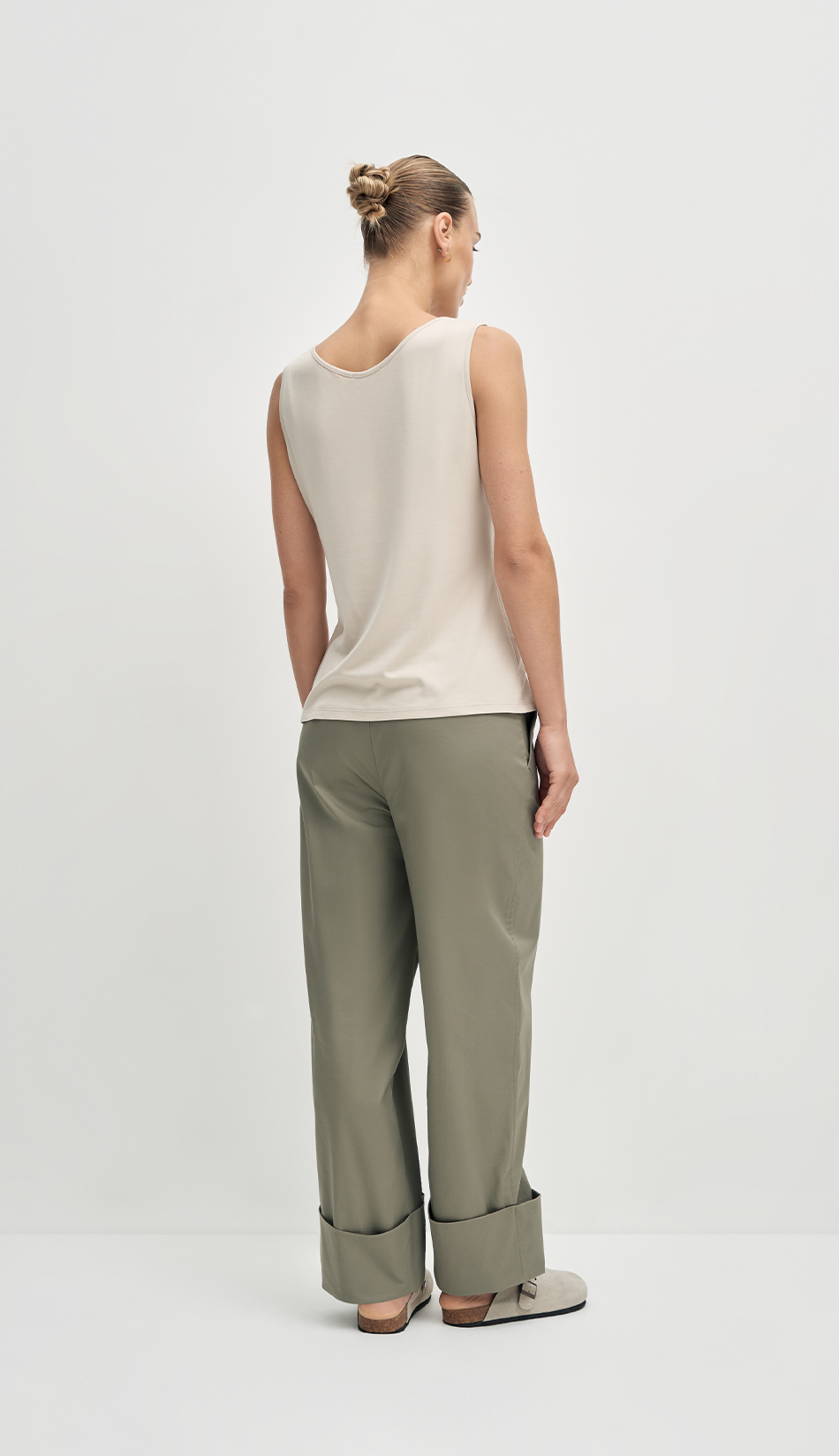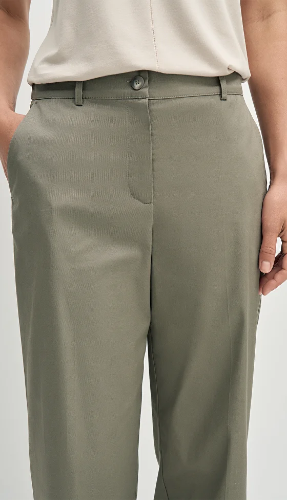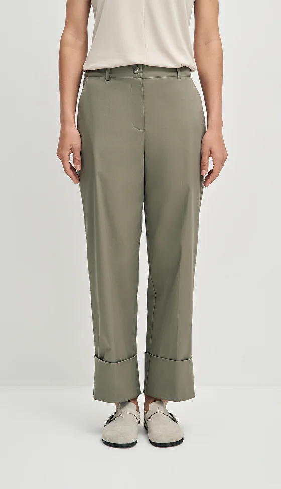 Объемные брюки прямого силуэта из смесового хлопка в оттенке 'оливин'. На поясе сзади резинка, фиксируется на пуговицу, спереди – застежка на молнию. Брюки имеют вертикальные заутюженные стрелки, по низу - широкие отвороты, карманы по бокам.
