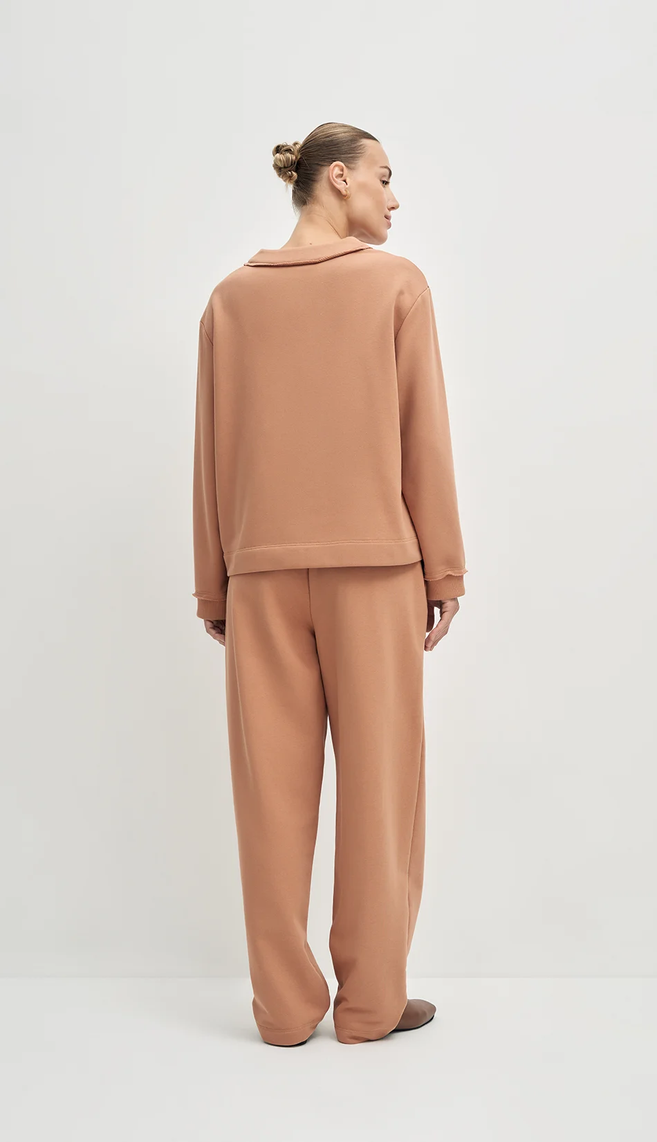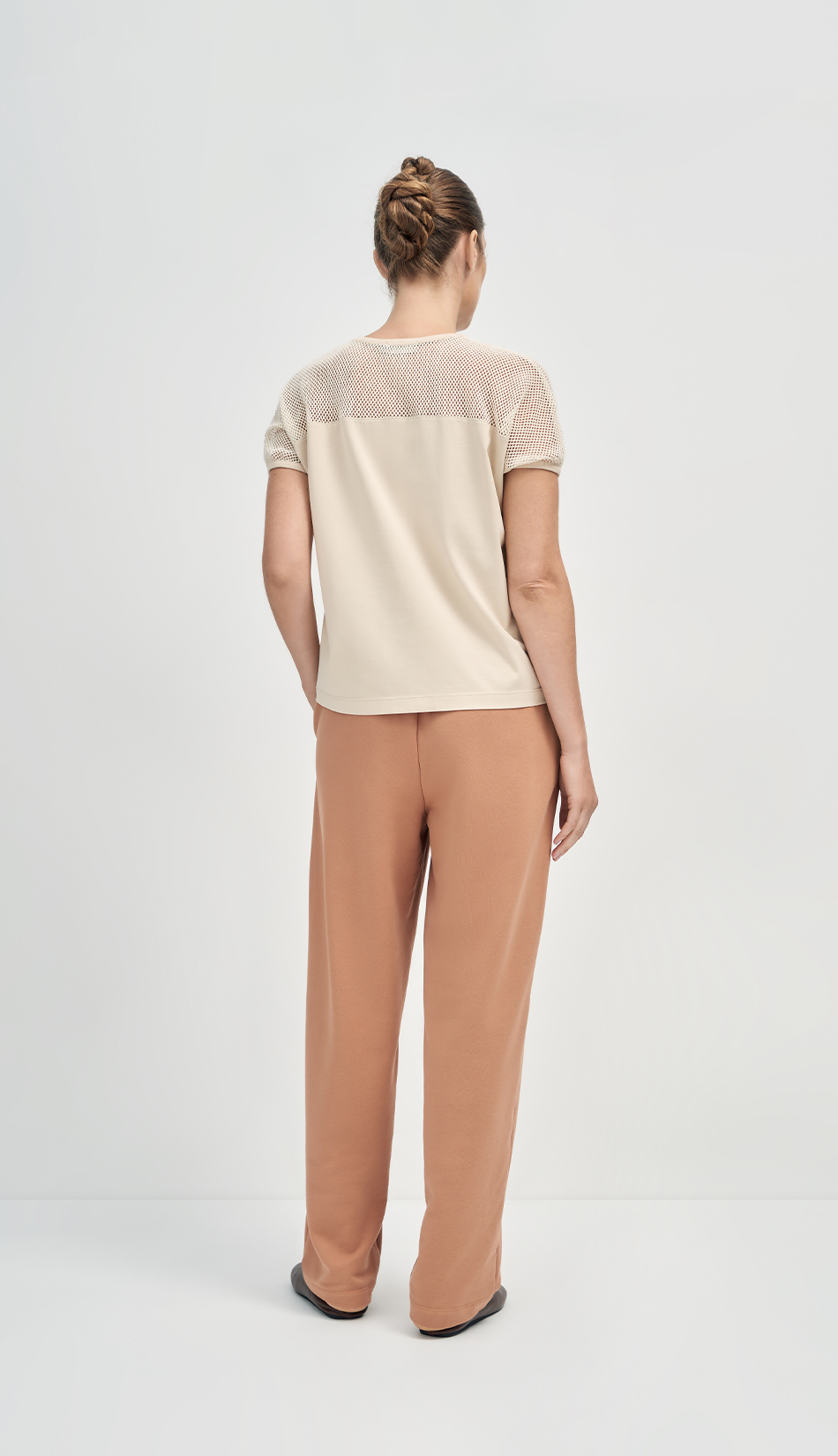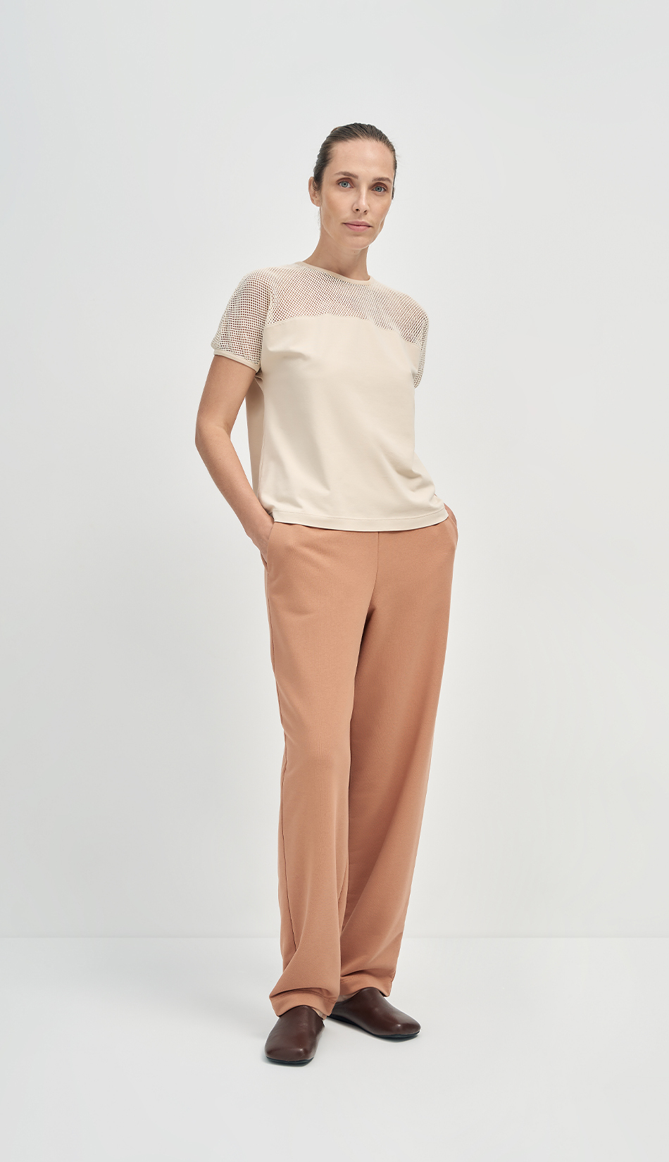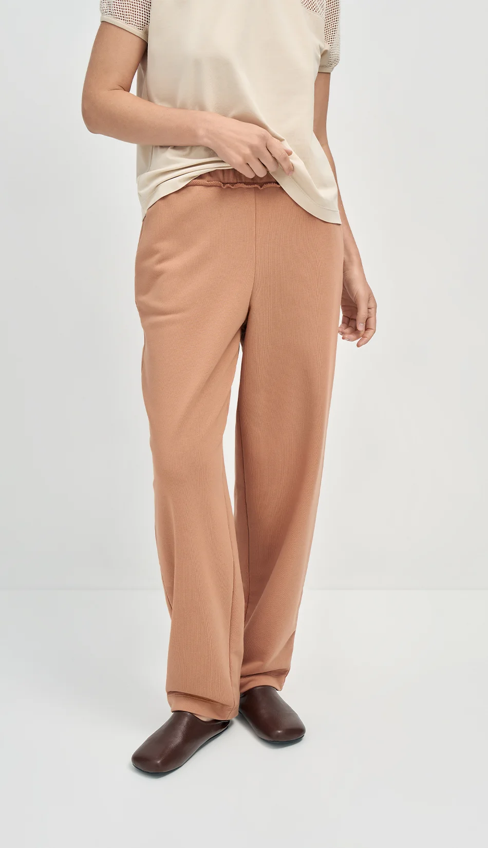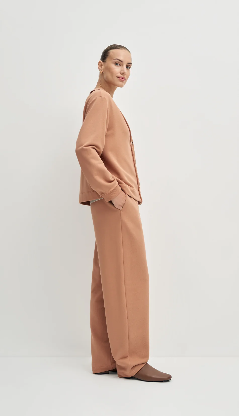 Брюки умеренного объема из итальянского трикотажа, мягко сужающиеся к низу. Движение ткани здесь — продолжение движения тела. Создают цельный образ с жакетом из комплекта В26.Ш04.056 'мягкая умбра' или поддерживают другие расслабленные верха коллекции.