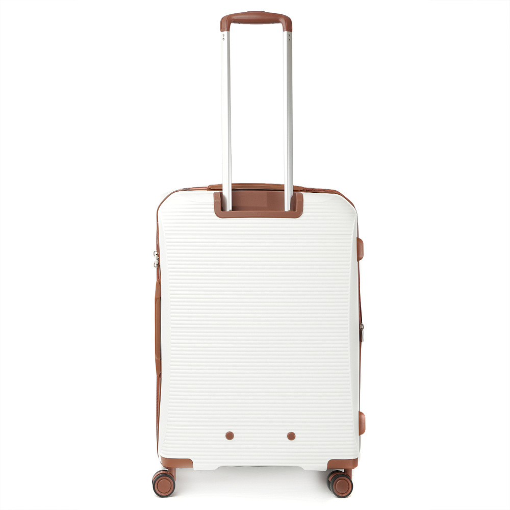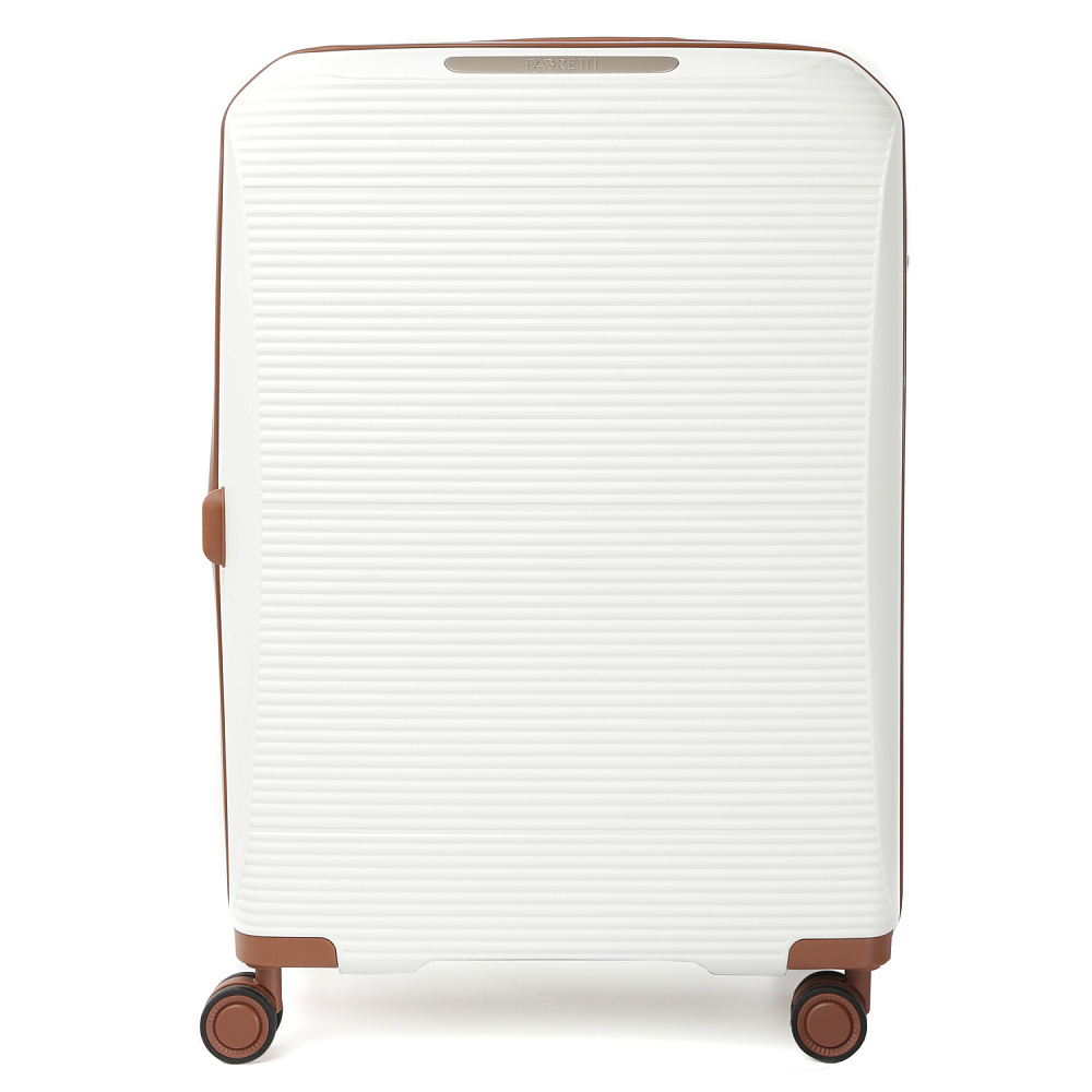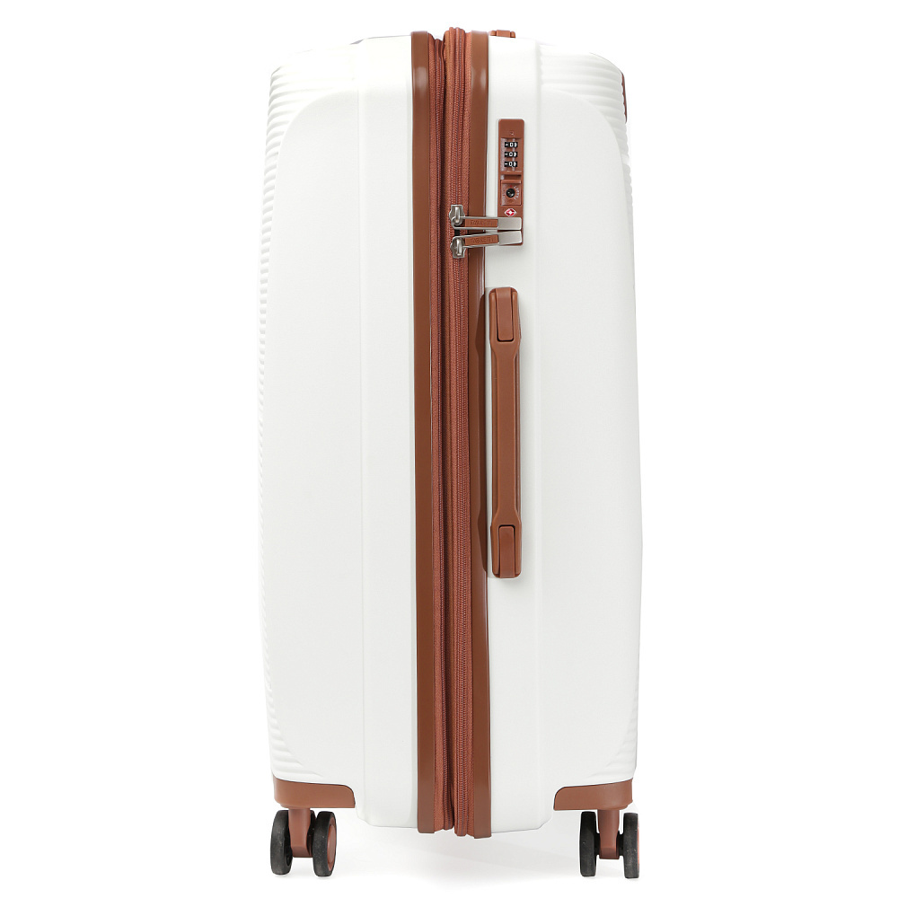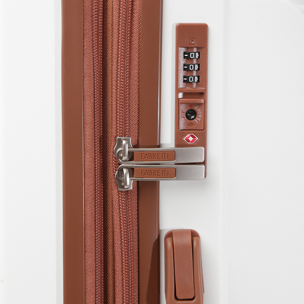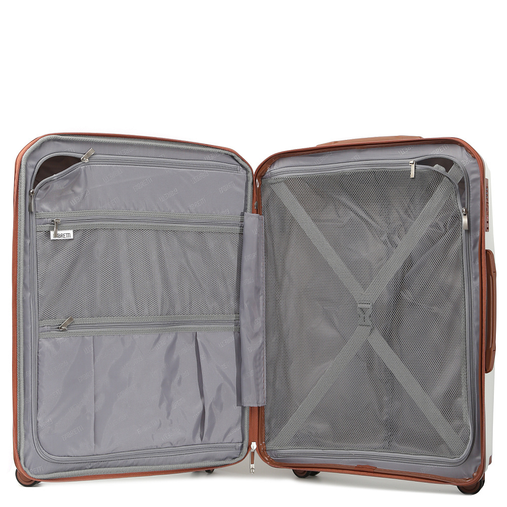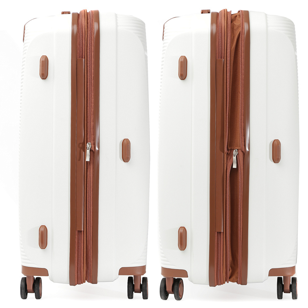 Вместительный чемодан FABRETTI размера L с возможностью увеличения объема, размер: 78*57*35 (40 с расширением). Модель выполнена из полипропилена – современного материала, для которого характерны высокая ударопрочность, стойкость к перепадам температур, отличная износостойкость. Основной белый цвет подчеркнут коричневым оттенком в деталях аксессуара.Внутри два отделения: одно - с эластичными ремнями-фиксаторами и с прозрачной перегородкой-сеткой на молнии; другое - с тканевой перегородкой на молнии и двумя карманами-сетками на молнии. Выдвижная ручка фиксируется в 3-х положениях. Сверху и сбоку есть ручки для удобства переноски. 4 двойных колеса вращаются на 360°, позволяя чемодану двигаться легко и плавно.
