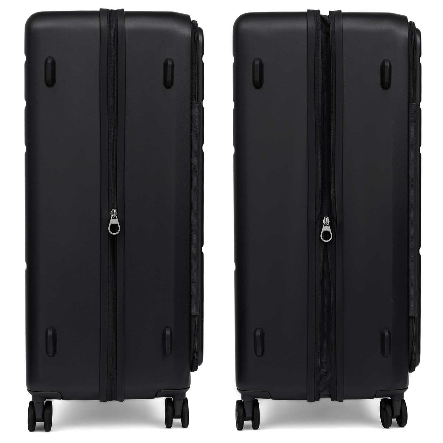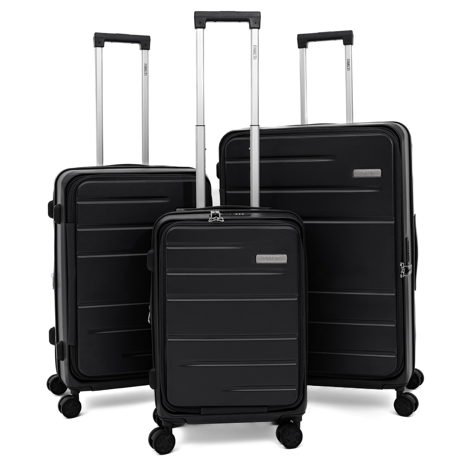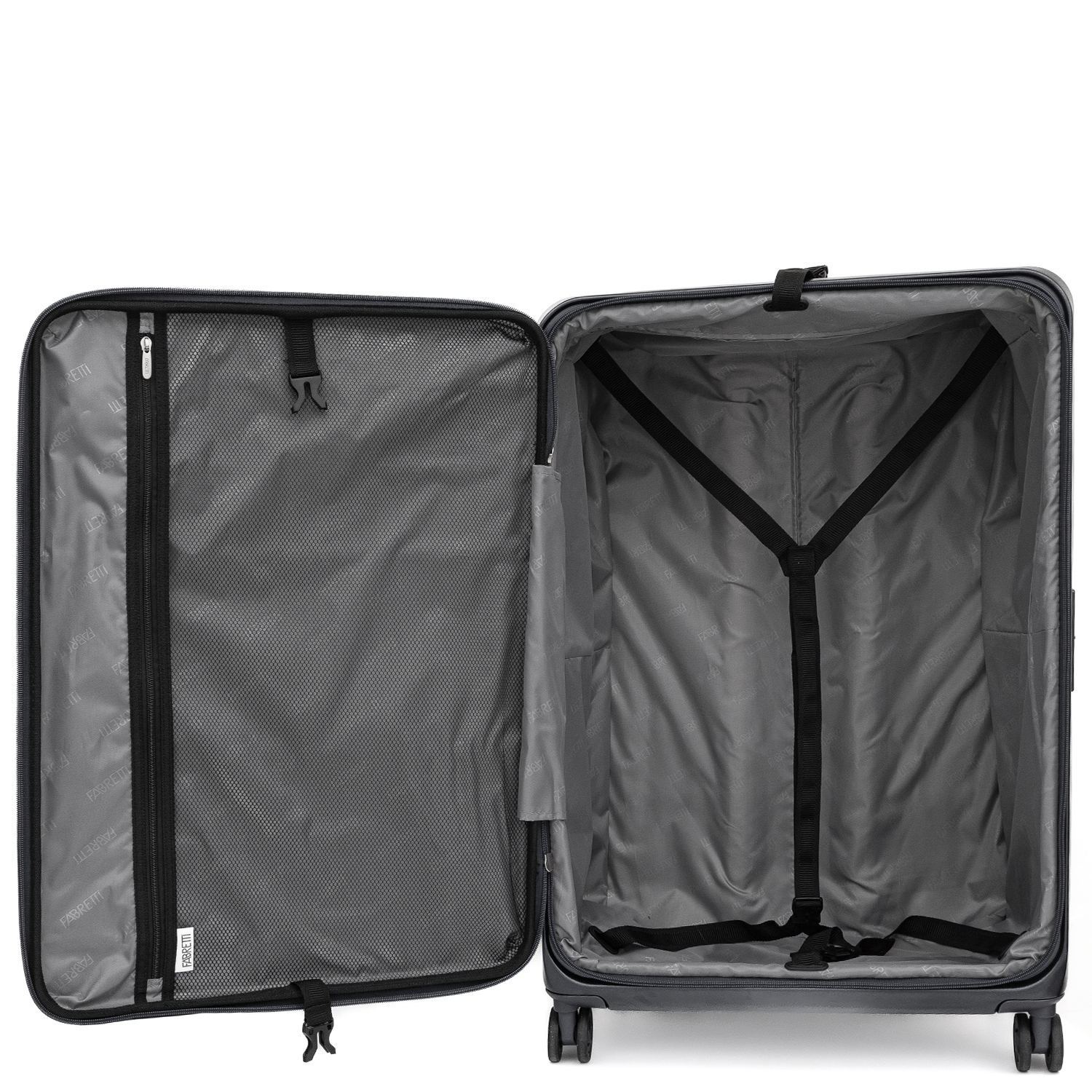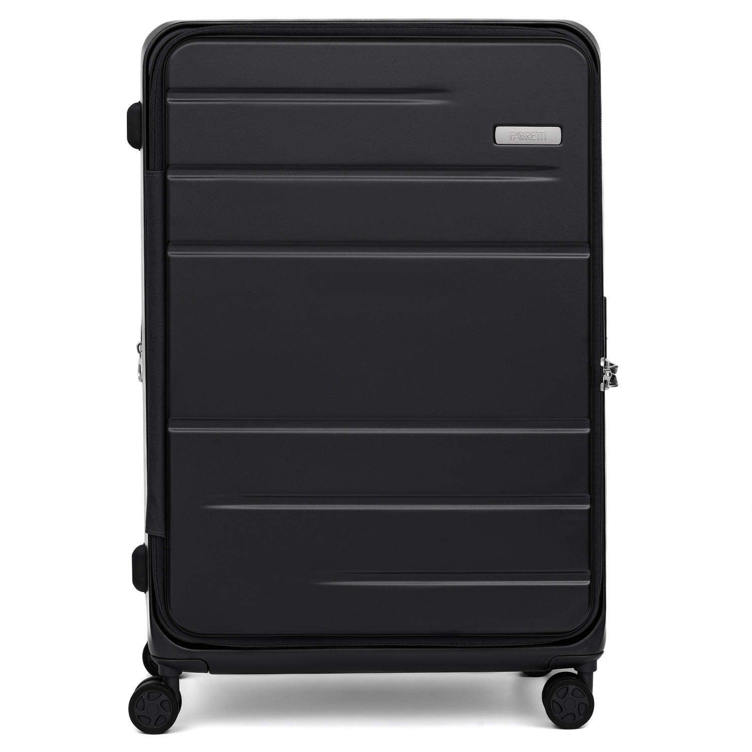 Вместительный чемодан с вертикальной загрузкой FABRETTI размера L с возможностью увеличения объема, размер: 78*53*31 (36 с расширением). Модель в оттенке черный металлик выполнена из литого 100% поликарбоната - современного материала, который с равным успехом переносит морозы и жару. Ударопрочная формула защищает аксессуар от механических повреждений. Просторное отделение закрывается на молнию со стильными брендированными поводками и оснащено эластичными ремнями-фиксаторами. Внутри предусмотрен вместительный карман-сетка на молнии. Ремни, регулирующиеся по длине, позволяют фиксировать крышку чемодана в открытом виде. Швы спрятаны под гибкие пластиковые канты. Выдвижная ручка из авиационного алюминия фиксируется в 3-х положениях. Надежные встроенные верхняя и боковая ручки позволяют комфортно переносить чемодан. Боковые ножки обеспечивают устойчивое положение чемодана при постановке на бок. 4 двойных колеса из износостойкого каучука бесшумно вращаются на 360°, позволяя чемодану двигаться легко и плавно.