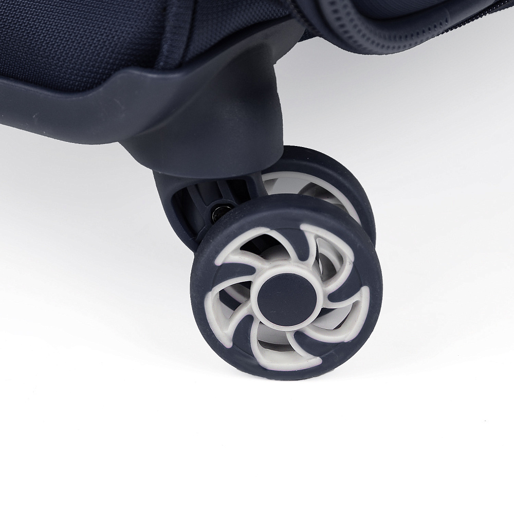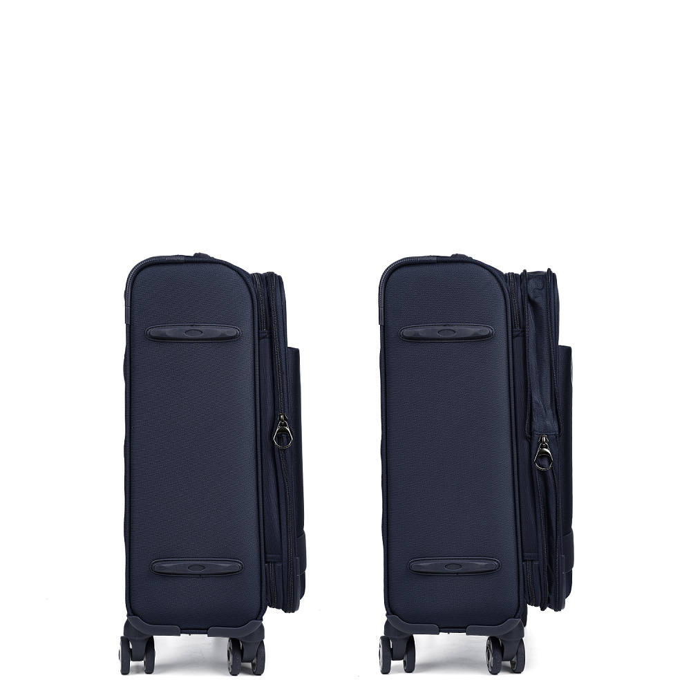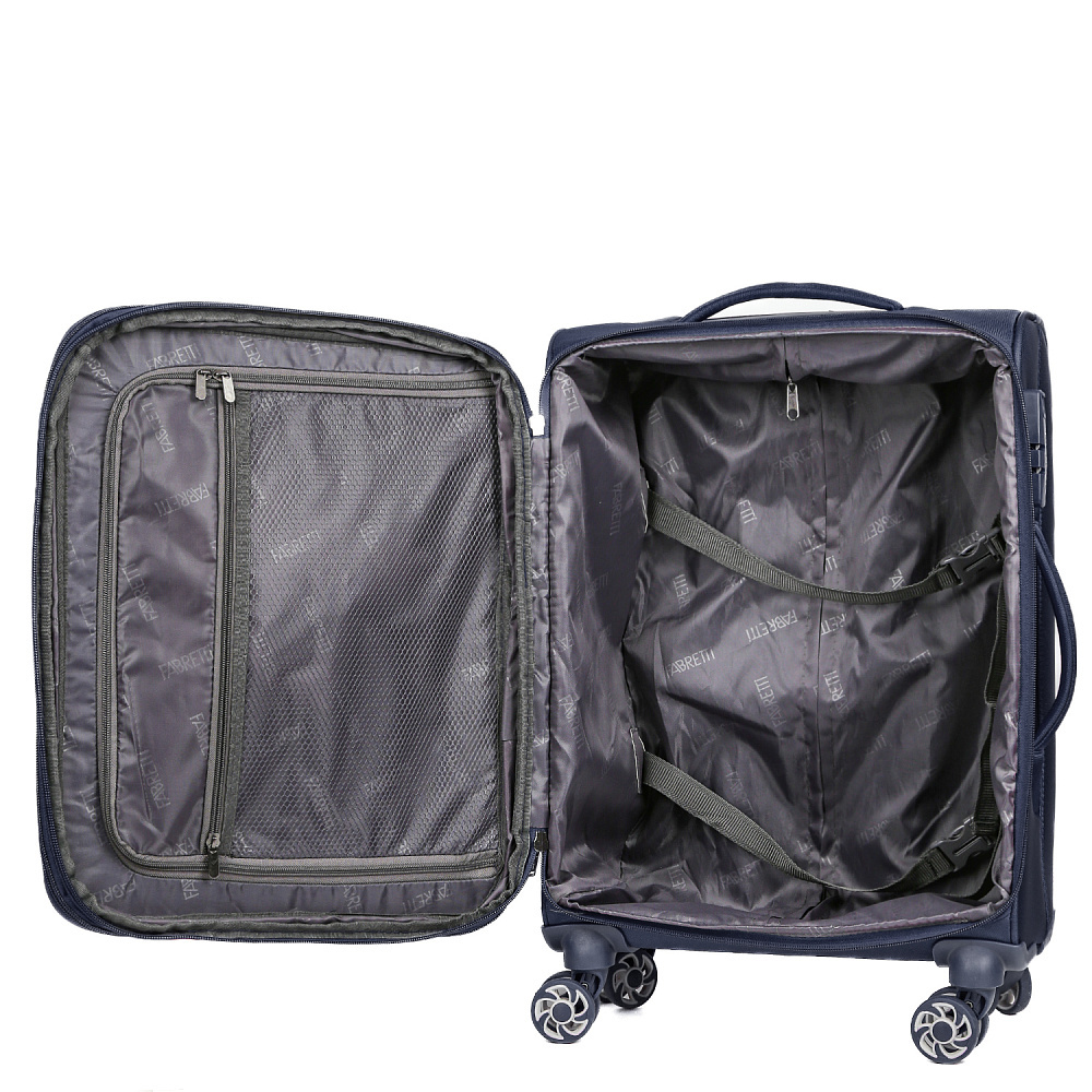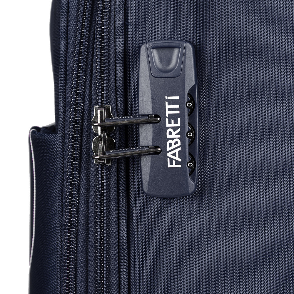 Универсальный чемодан FABRETTI среднего размера (M) с возможностью увеличения объема, размер: 66*42*25 (30 с расширением). Модель в синем оттенке выполнена из высокотехнологичного полиэстера - современного прочного материала, для которого характерны прочность и влагостойкость. Основное отделение закрывается на молнию с 2 бегунками. Внутри 2 отделения: одно - с эластичными ремнями-фиксаторами, другое - с тканевой перегородкой на молнии и вместительным карманом-сеткой на молнии. На лицевой стороне предусмотрен карман на молнии. Выдвижная ручка фиксируется в 3-х положениях. Сверху и сбоку предусмотрены дополнительные ручки для удобства переноски. 4 двойных колеса вращаются на 360°, позволяя чемодану двигаться легко и плавно. Чемодан оснащен кодовым замком.
