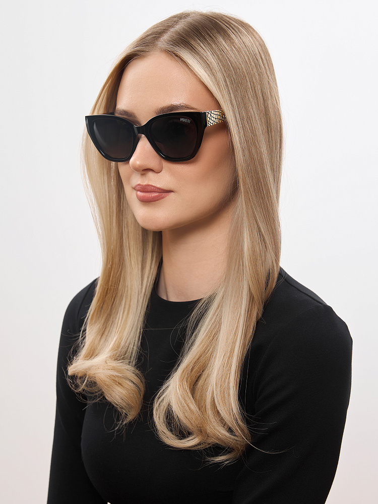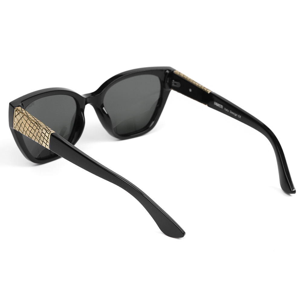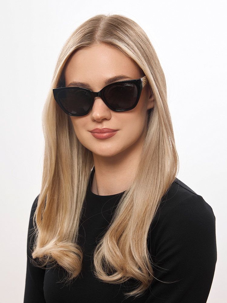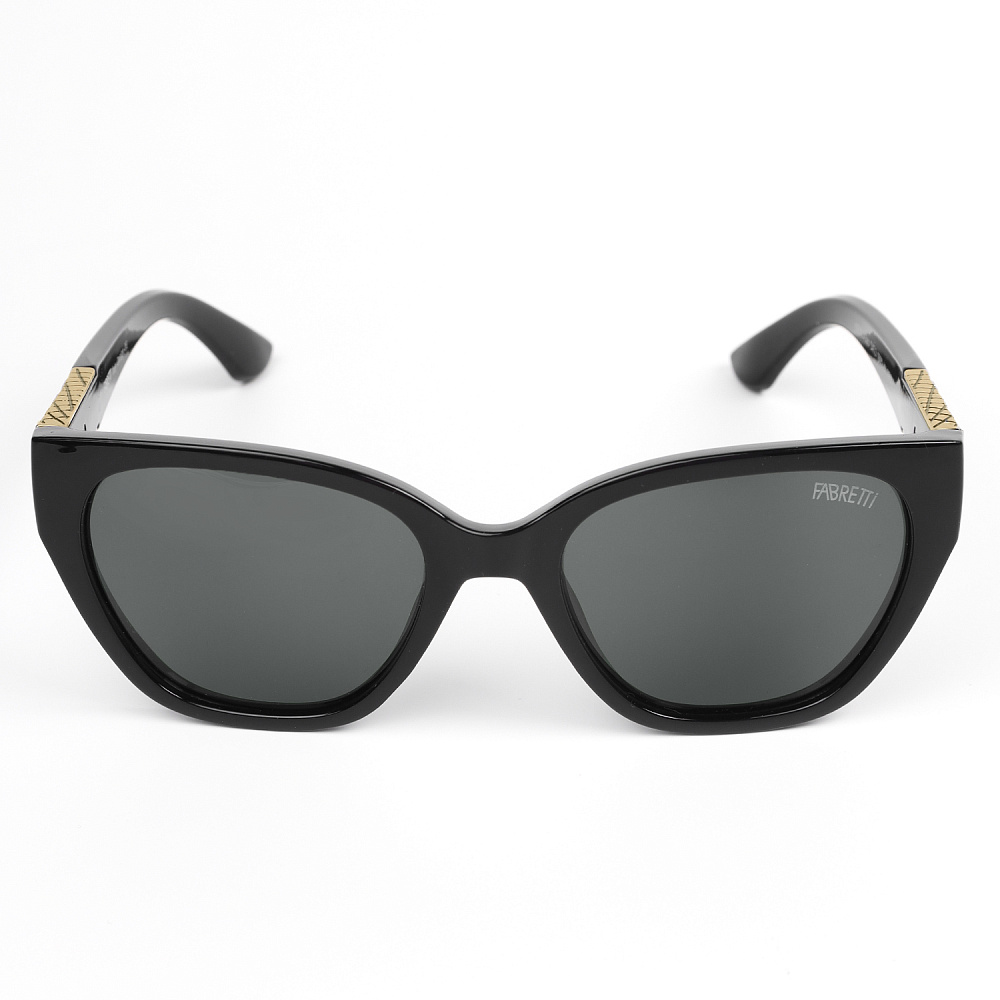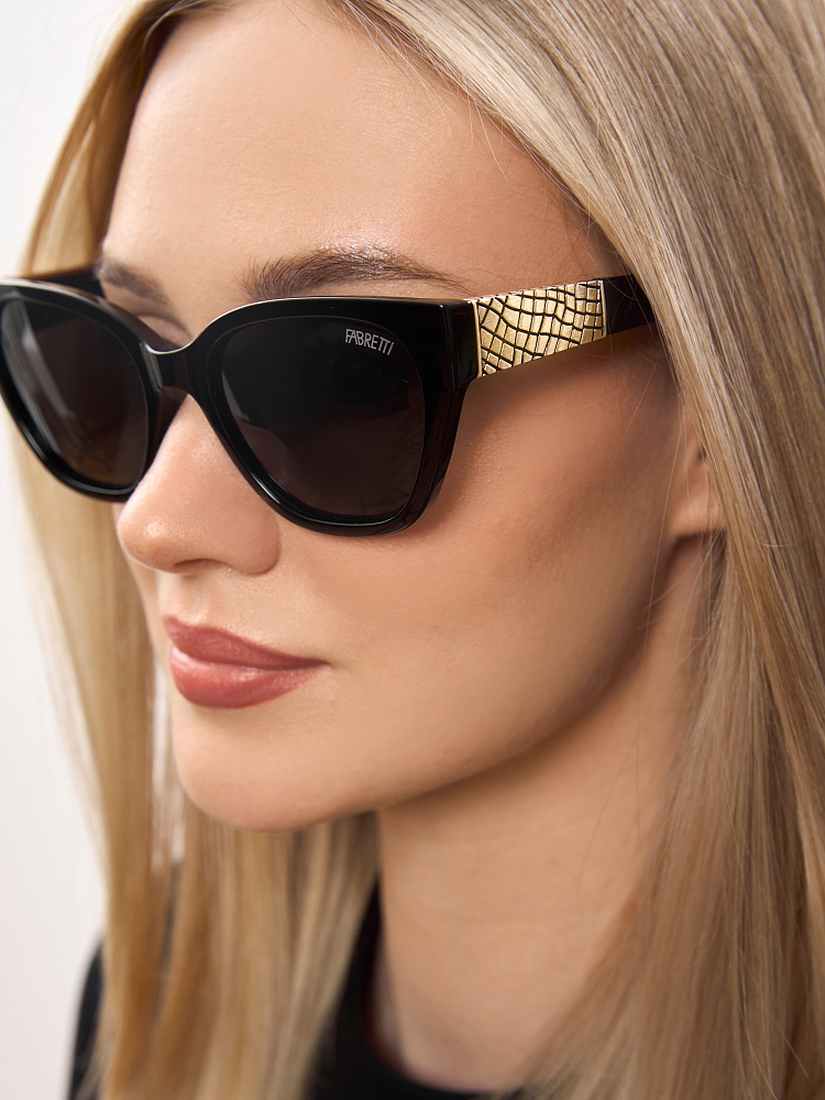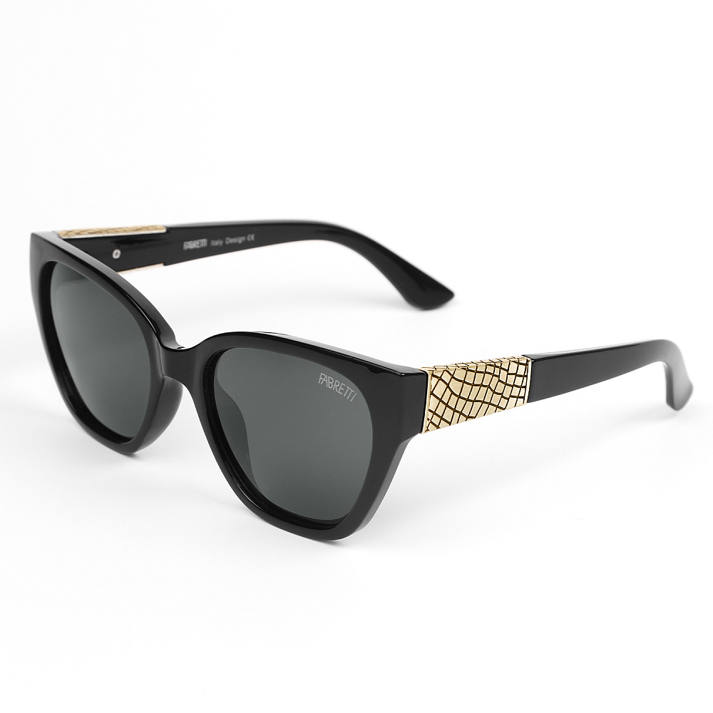 Поляризационные женские солнцезащитные очки итальянского бренда FABRETTI в глянцевой черной оправе "кошачий глаз" с золотистыми вставками на дужках. Однотонные серые линзы позволяют видеть одинаково хорошо как в помещении, так и на солнечной улице.У этой модели классическая форма «кошачий глаз» - слегка вытянутые верхние уголки оправы. Они зрительно увеличивают глаза и скулы, делая акцент на лице. Такая форма хорошо подходит для круглых и квадратных форм лица. Изящный женственный вариант для повседневного гардероба и офисного стиля.Категория затемнения линз - 3 (комфортно использовать в городе, для вождения, для отдыха на море и спортивных занятий в солнечную погоду). 100% защита от ультрафиолетовых лучей.