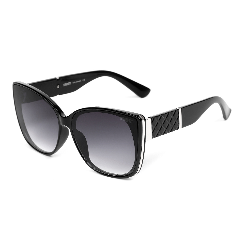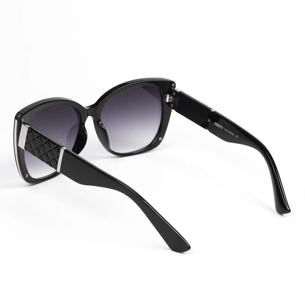 Стильные женские солнцезащитные очки итальянского бренда FABRETTI в увеличенной оправе "кошачий глаз" черного цвета. Градиентные серые линзы позволяют видеть одинаково хорошо как в помещении, так и на солнечной улице.«Кошачий глаз» - элегантная женственная оправа с вытянутыми вверх уголками, которая хорошо подходит для круглых и квадратных форм лица. Модель создает визуальный эффект «лифтинга», увеличивая глаза и скулы. Подходит для любого женского гардероба, от повседневного до офисного. Дужки и боковая часть оправы украшены серебристыми вставками.Категория затемнения линз - 3 (комфортно использовать в городе, для вождения, для отдыха на море и спортивных занятий в солнечную погоду). 100% защита от ультрафиолетовых лучей.