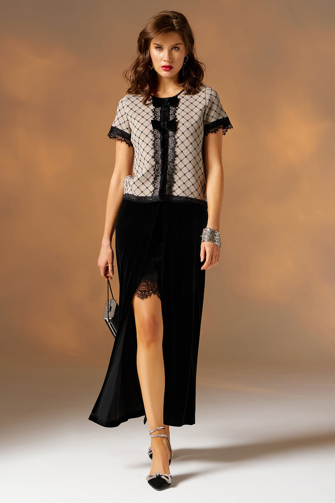 Джемпер женский, прямого силуэта .Рукав втачной, длиной до локтя.Горловина круглая.По низу рукава и по центру переда настрочено кружево и отделочные элементы-бантики.