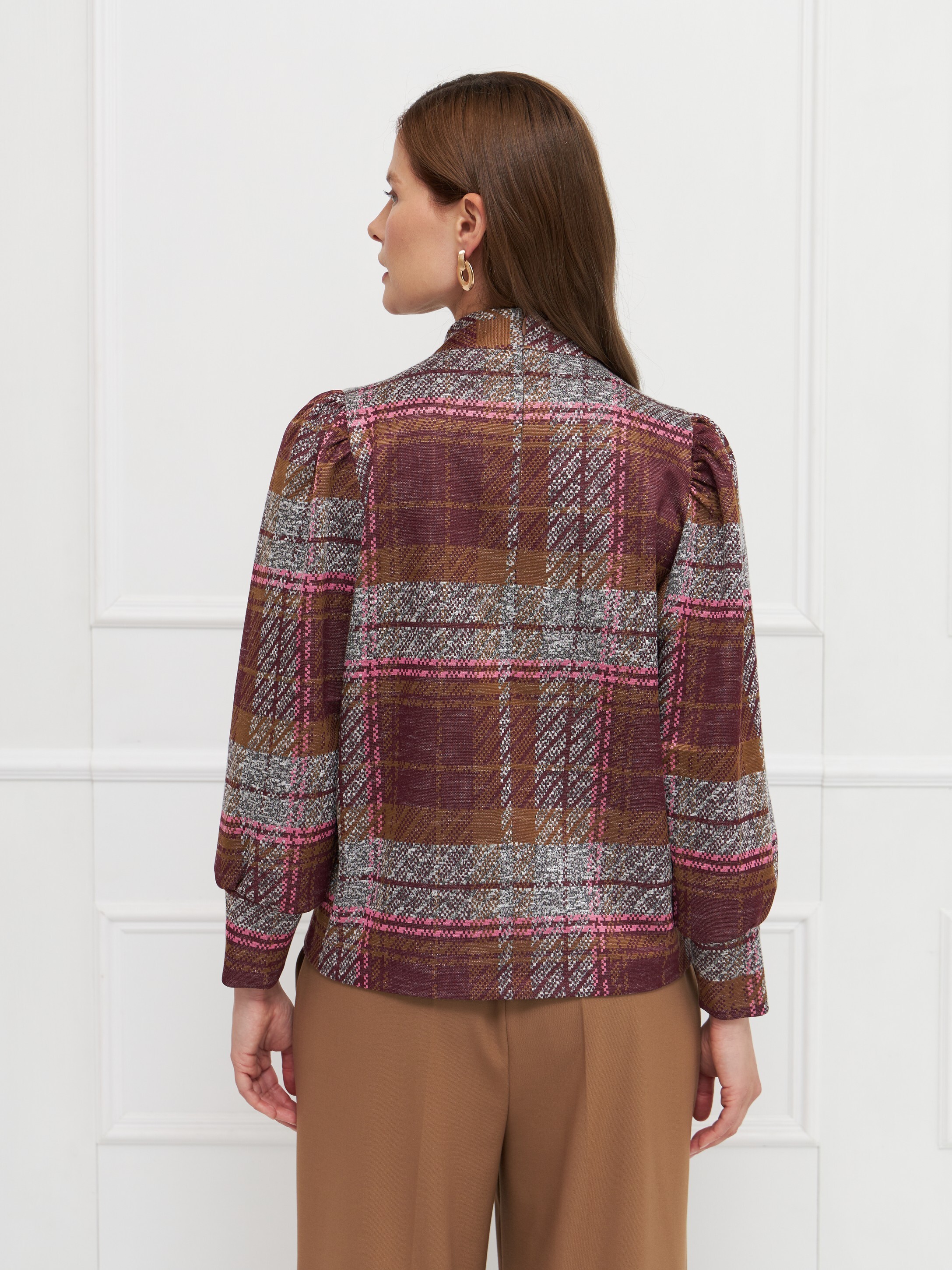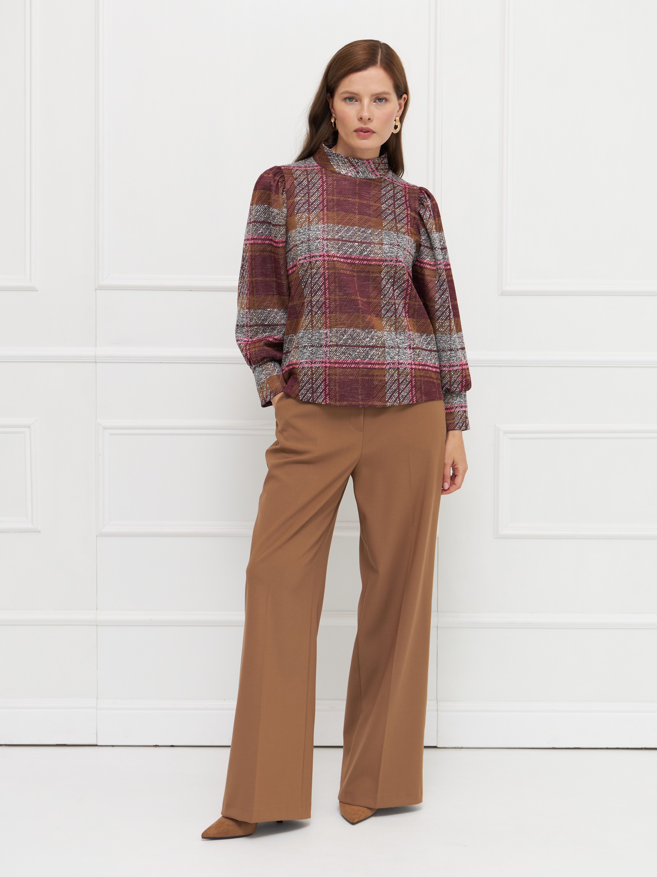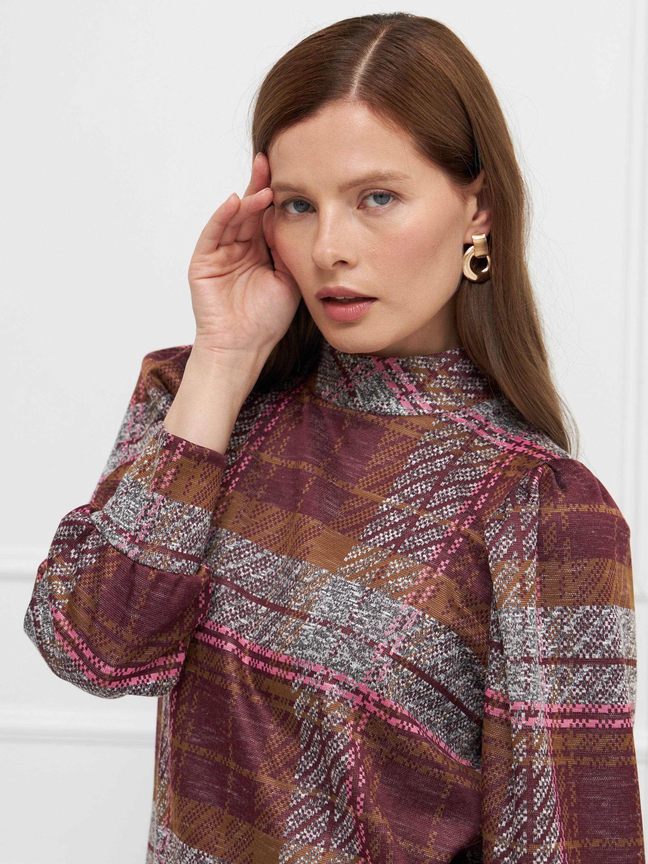 Блузка выполнена из мягкого трикотажа в крупную клетку в осенней палитре — тёплой и выразительной. Прямой силуэт создает комфортную посадку, а рукава длиной 7/8 с мягкой сборкой по окату и у манжет добавляют объема в верхней части. Воротник-стойка подчёркивает вертикаль образа, делая линию шеи более изящной. Застежка сзади на скрытую молнию сохраняет лаконичность фасона. Удобная и эффектная модель для прохладного сезона.