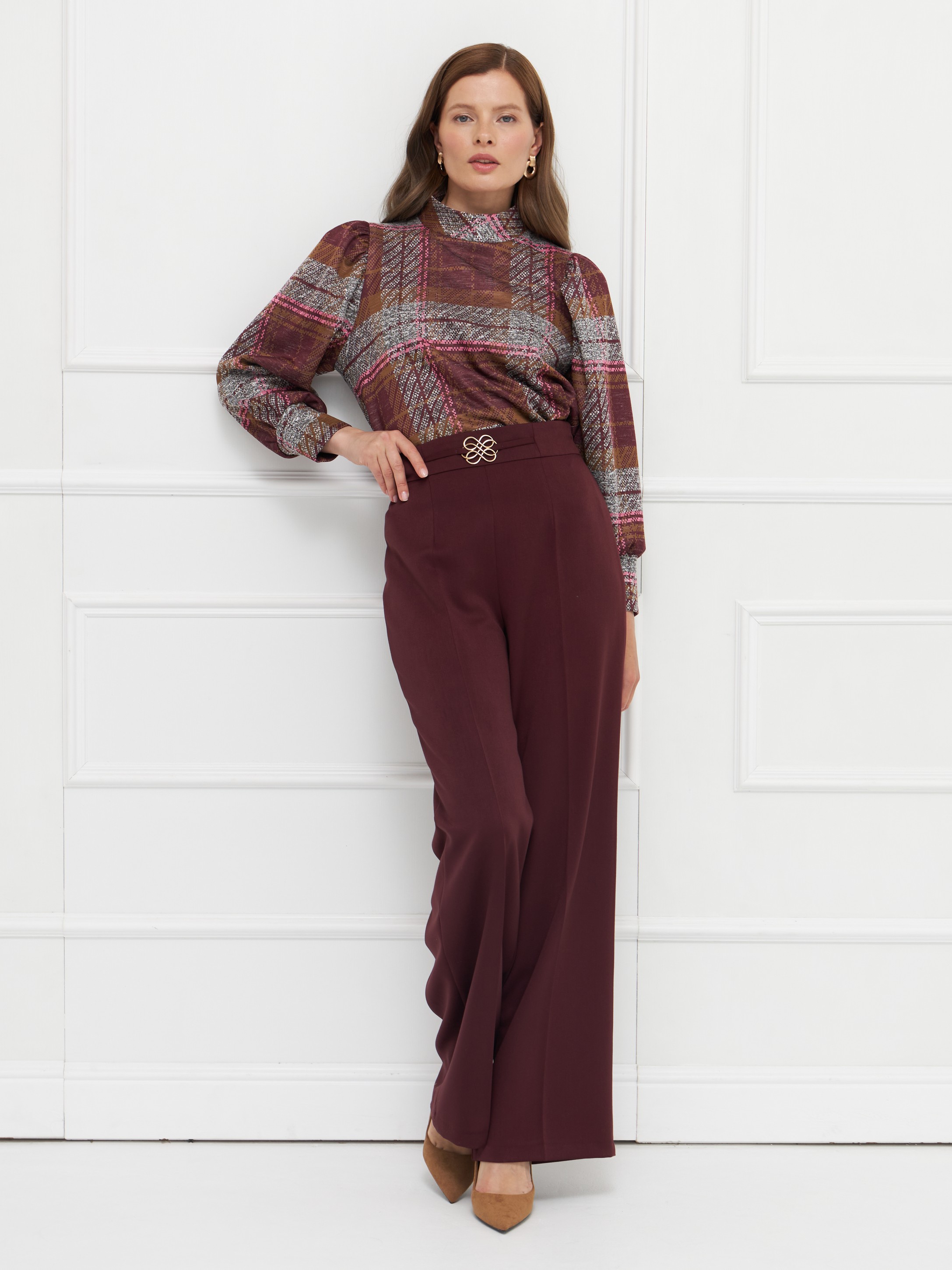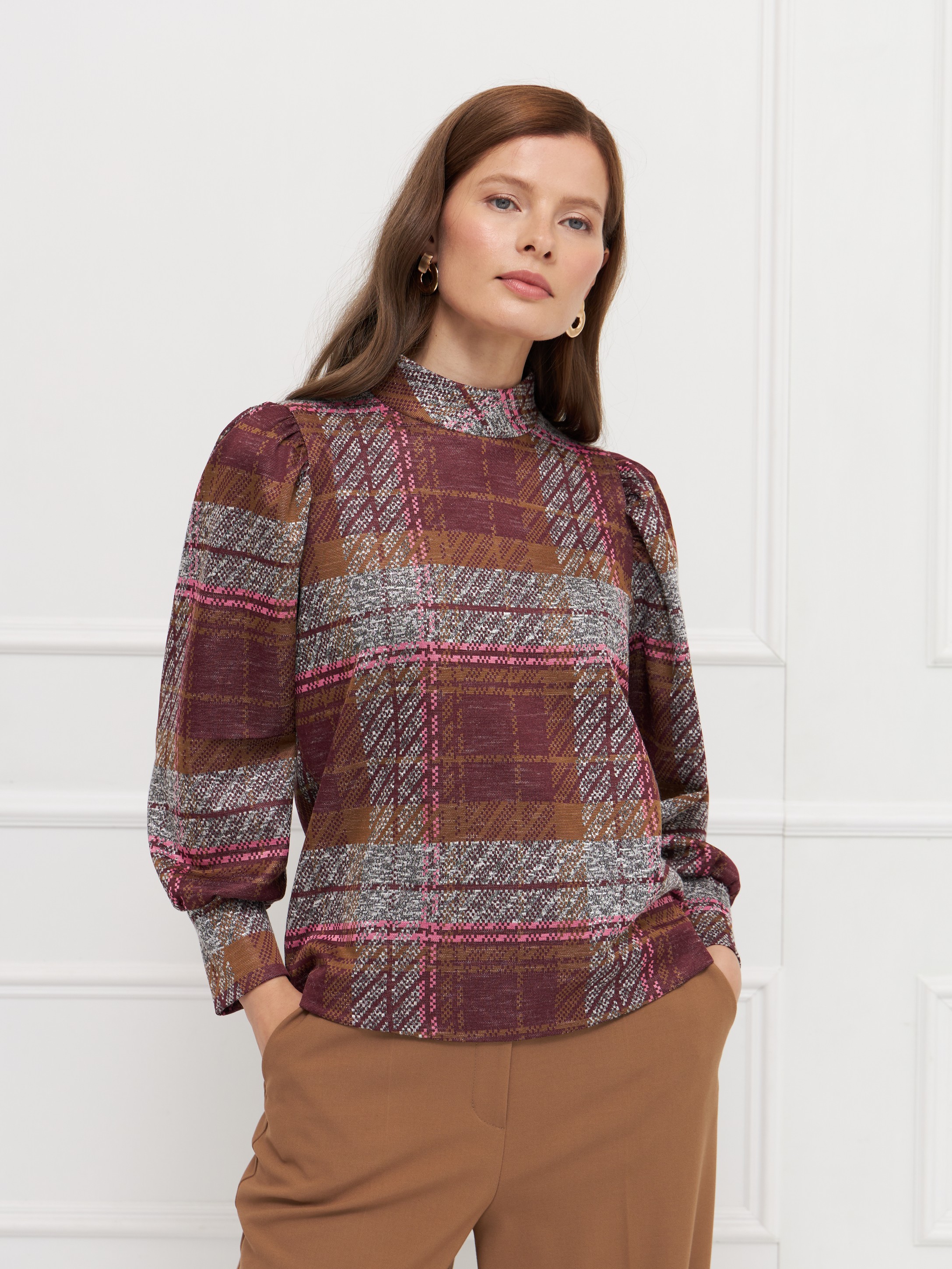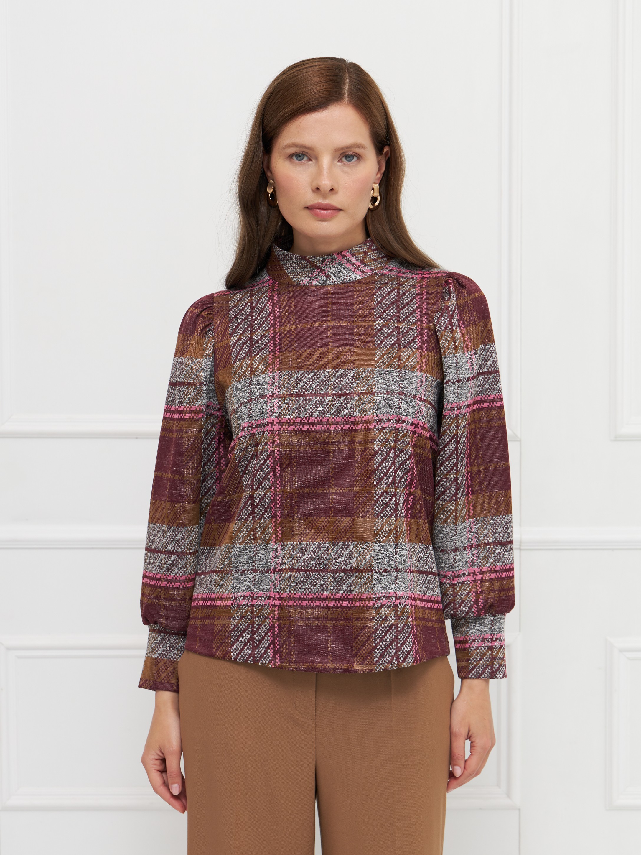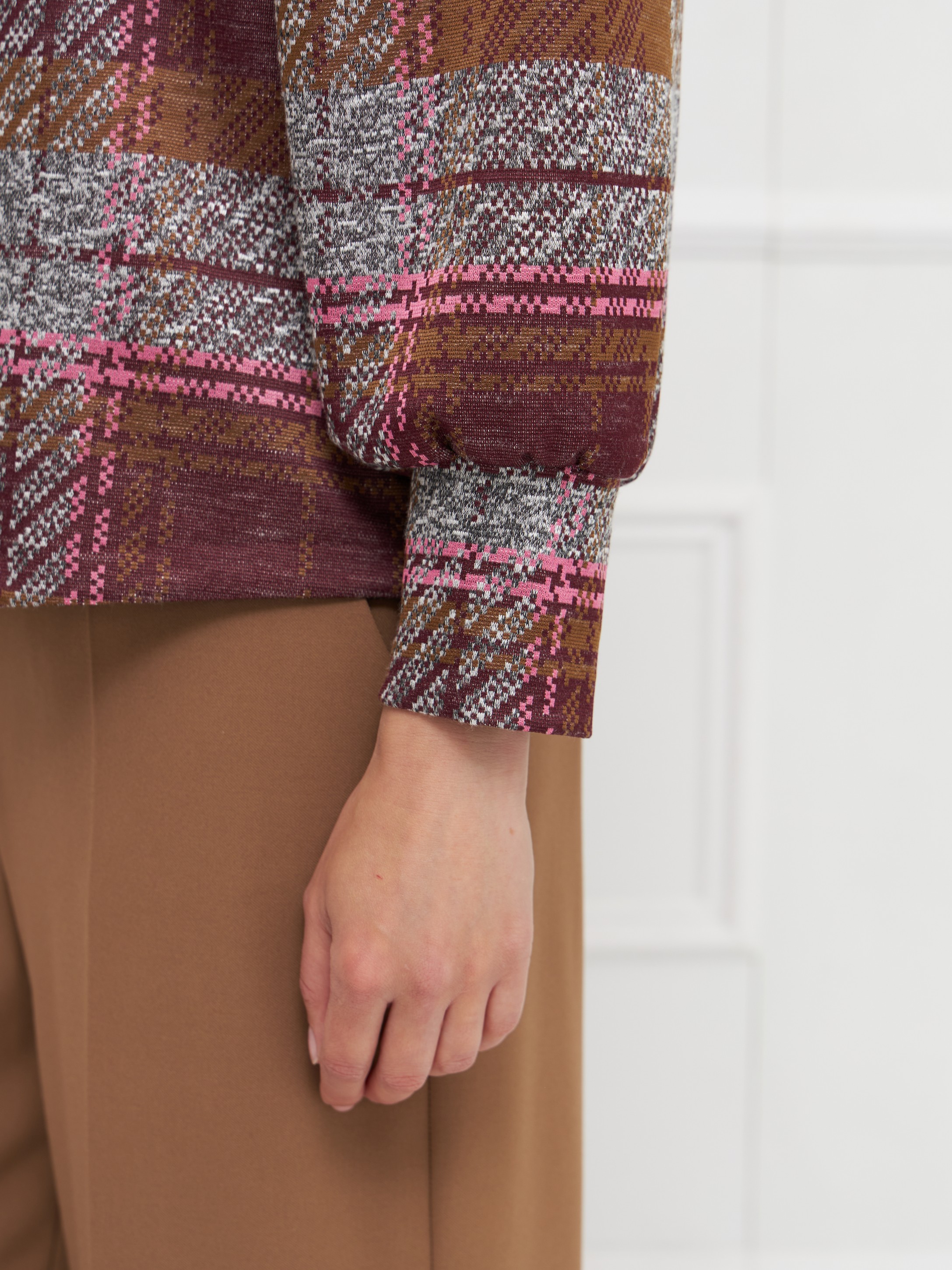 Блузка выполнена из мягкого трикотажа в крупную клетку в осенней палитре — тёплой и выразительной. Прямой силуэт создает комфортную посадку, а рукава длиной 7/8 с мягкой сборкой по окату и у манжет добавляют объема в верхней части. Воротник-стойка подчёркивает вертикаль образа, делая линию шеи более изящной. Застежка сзади на скрытую молнию сохраняет лаконичность фасона. Удобная и эффектная модель для прохладного сезона.