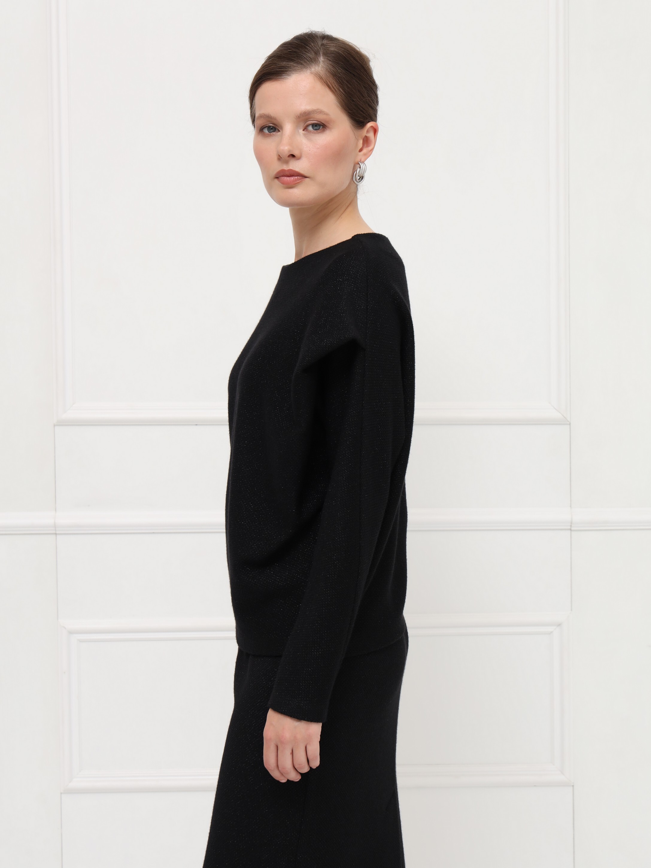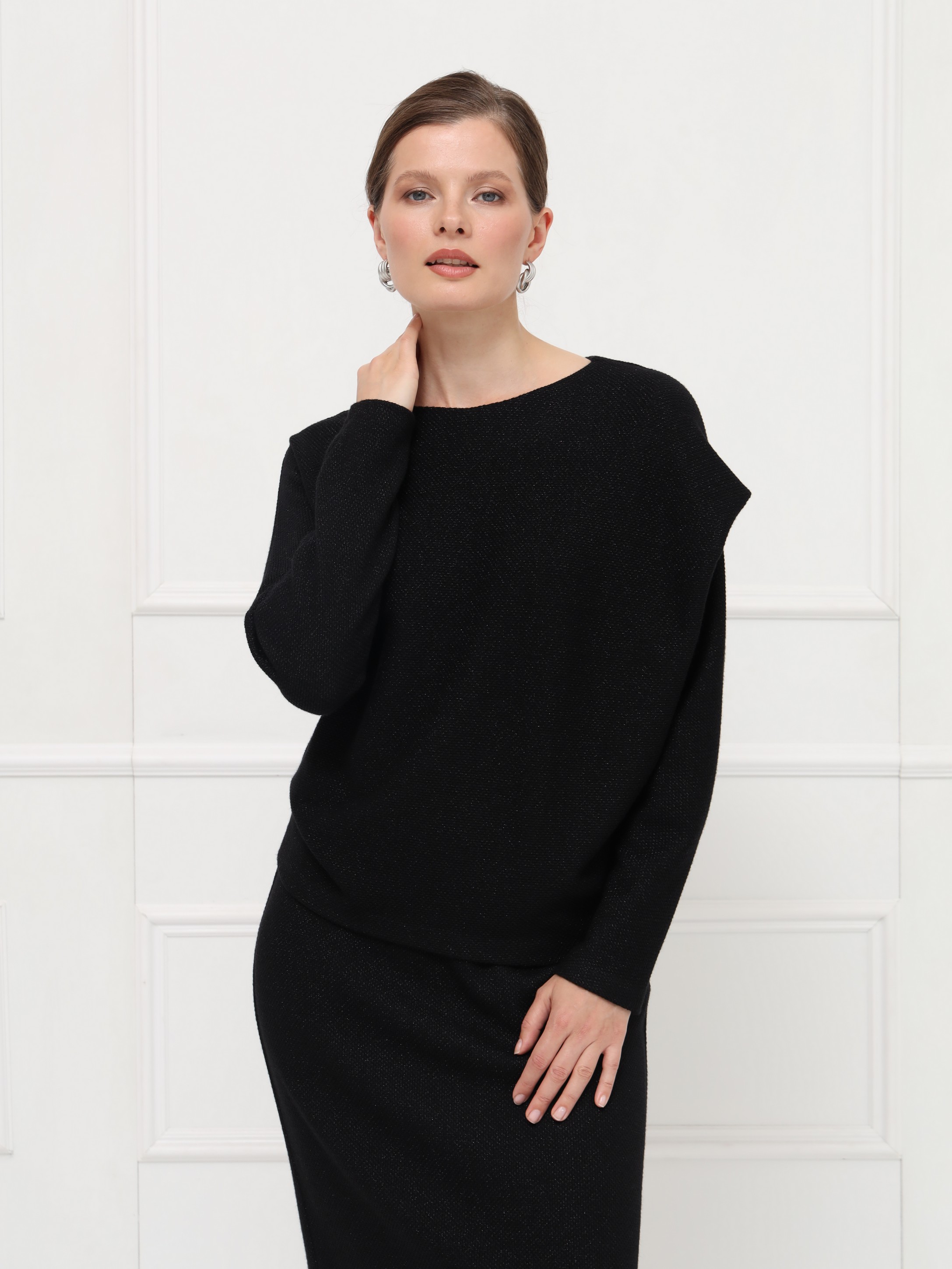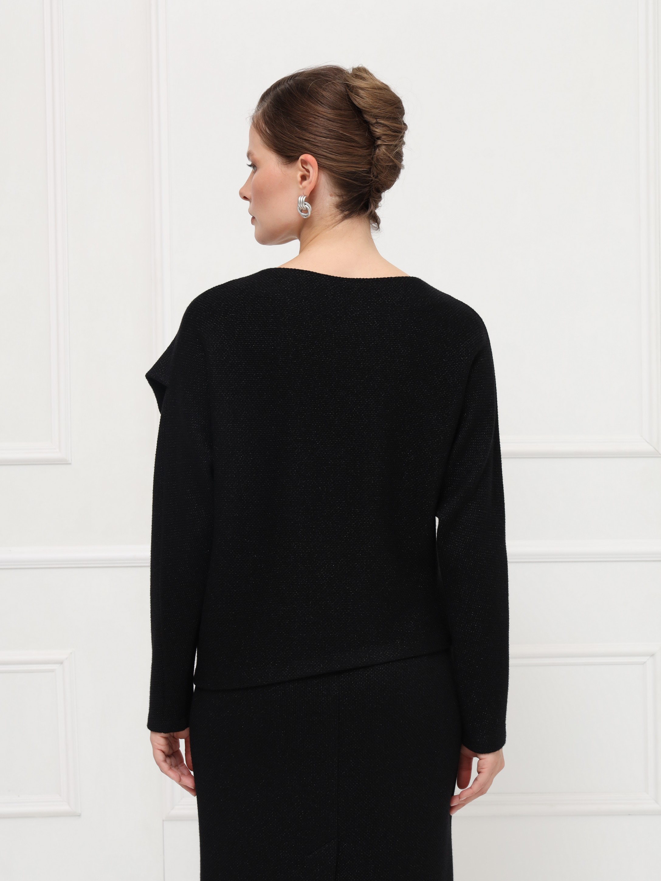 Эффектный черный джемпер из плотного эластичного трикотажа, с деликатным мерцанием, которое красиво проявляется при вечернем свете. Материал мягкий и приятный на ощупь, комфортно прилегает к телу, не стесняя движений. Ассиметричная драпированная складка делает модель оригинальной, горловина-лодочка подчёркивает линию плеч, а длинные зауженные книзу рукава формируют изящный силуэт.