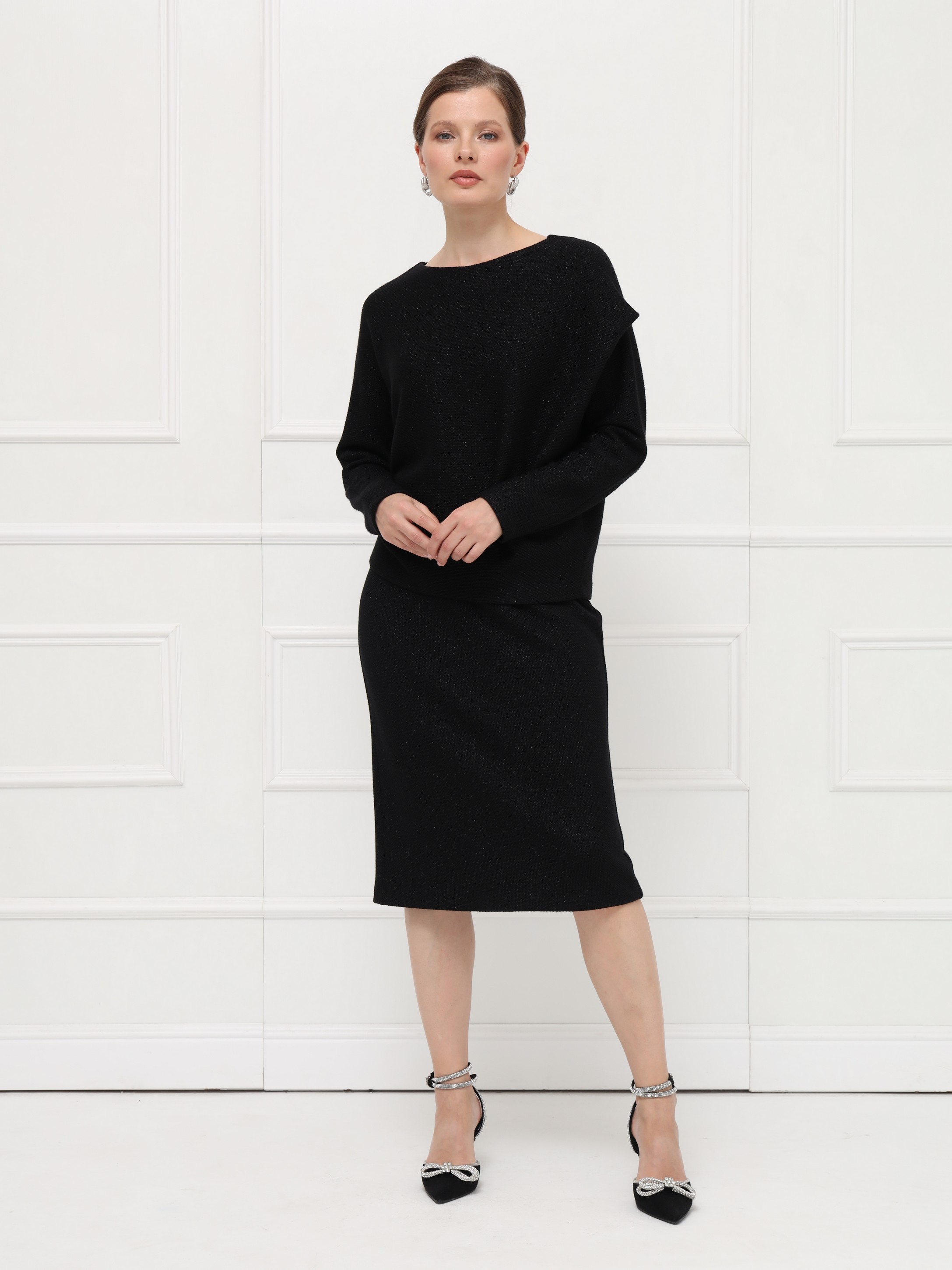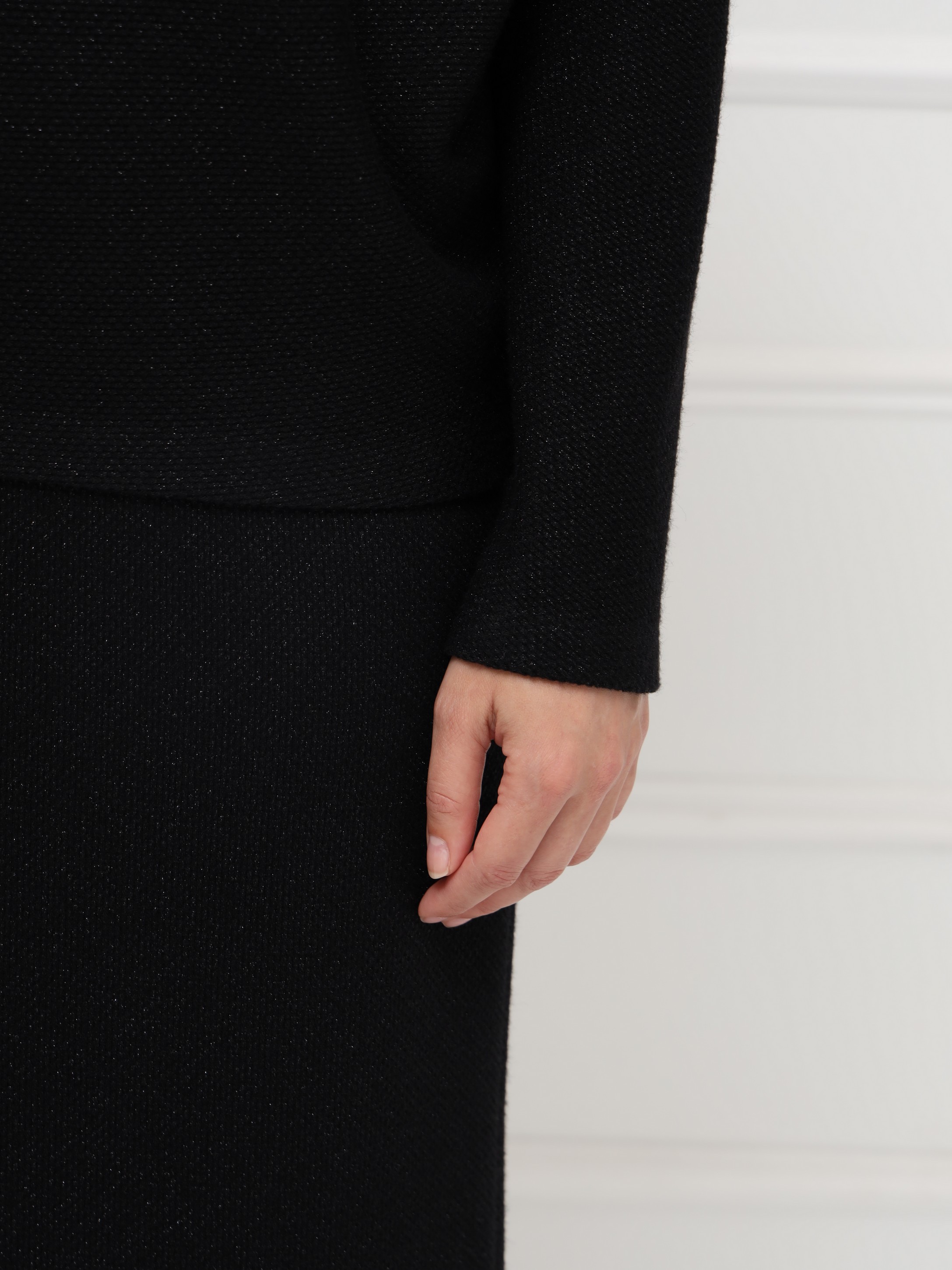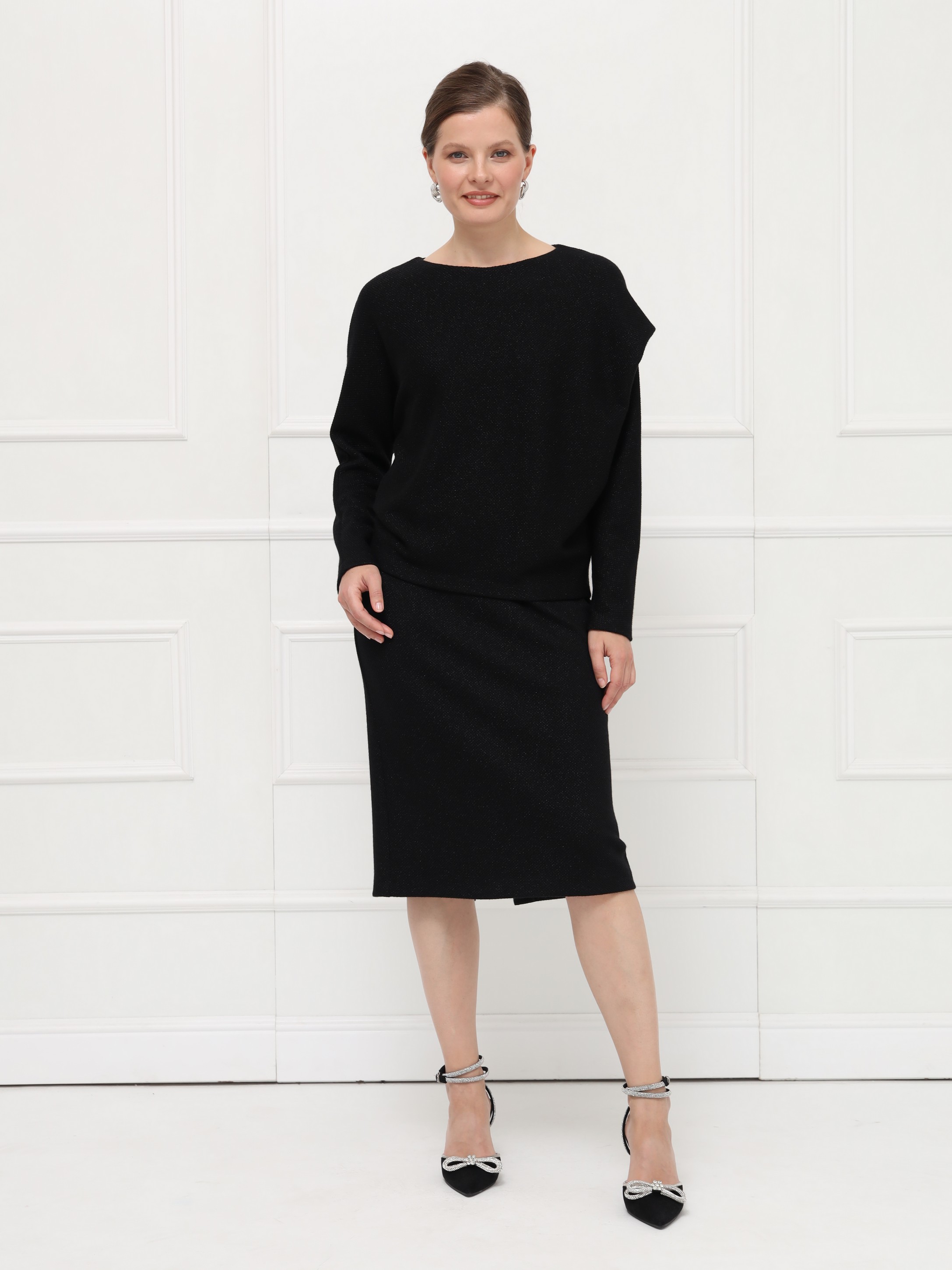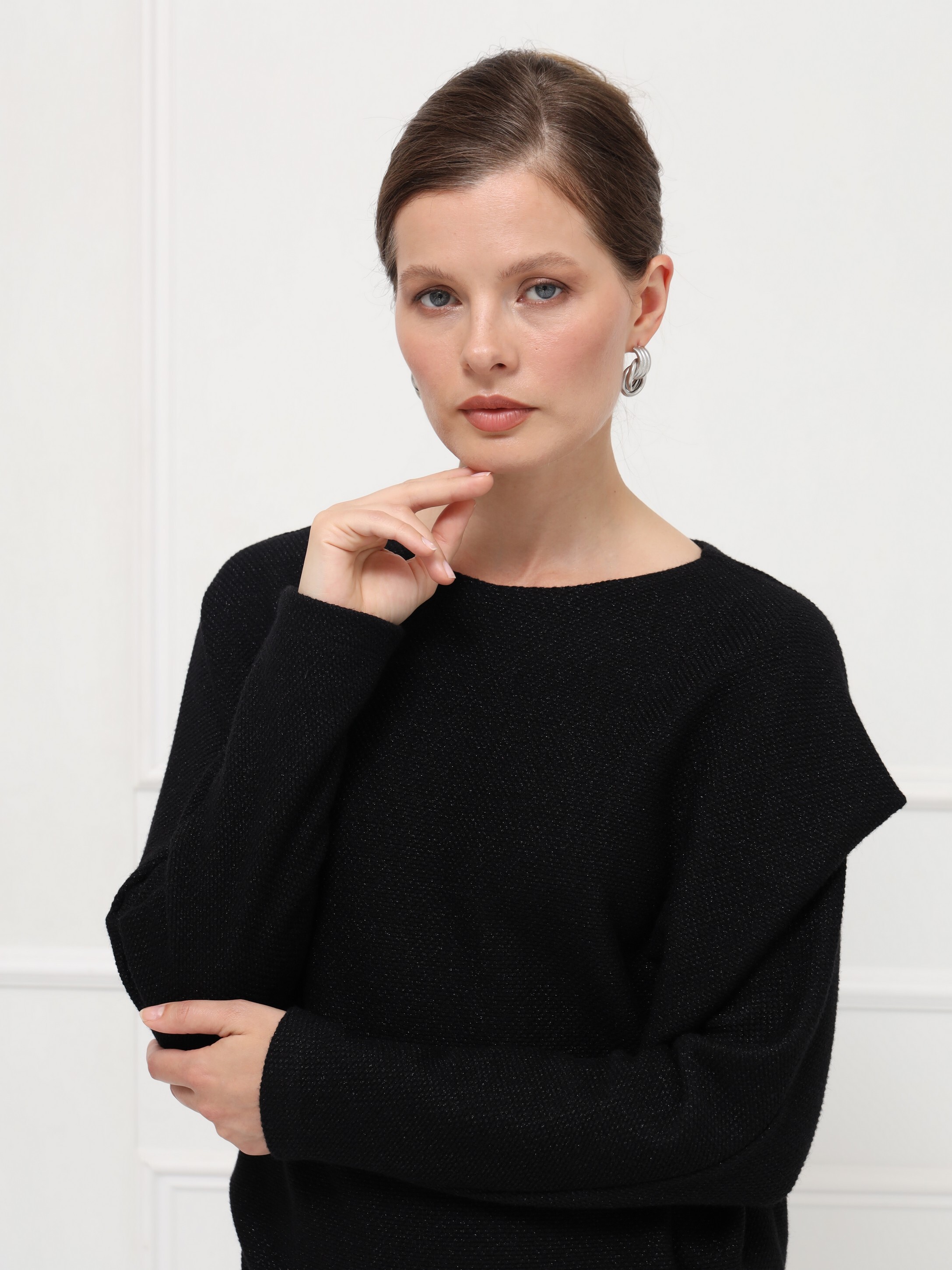 Эффектный черный джемпер из плотного эластичного трикотажа, с деликатным мерцанием, которое красиво проявляется при вечернем свете. Материал мягкий и приятный на ощупь, комфортно прилегает к телу, не стесняя движений. Ассиметричная драпированная складка делает модель оригинальной, горловина-лодочка подчёркивает линию плеч, а длинные зауженные книзу рукава формируют изящный силуэт.