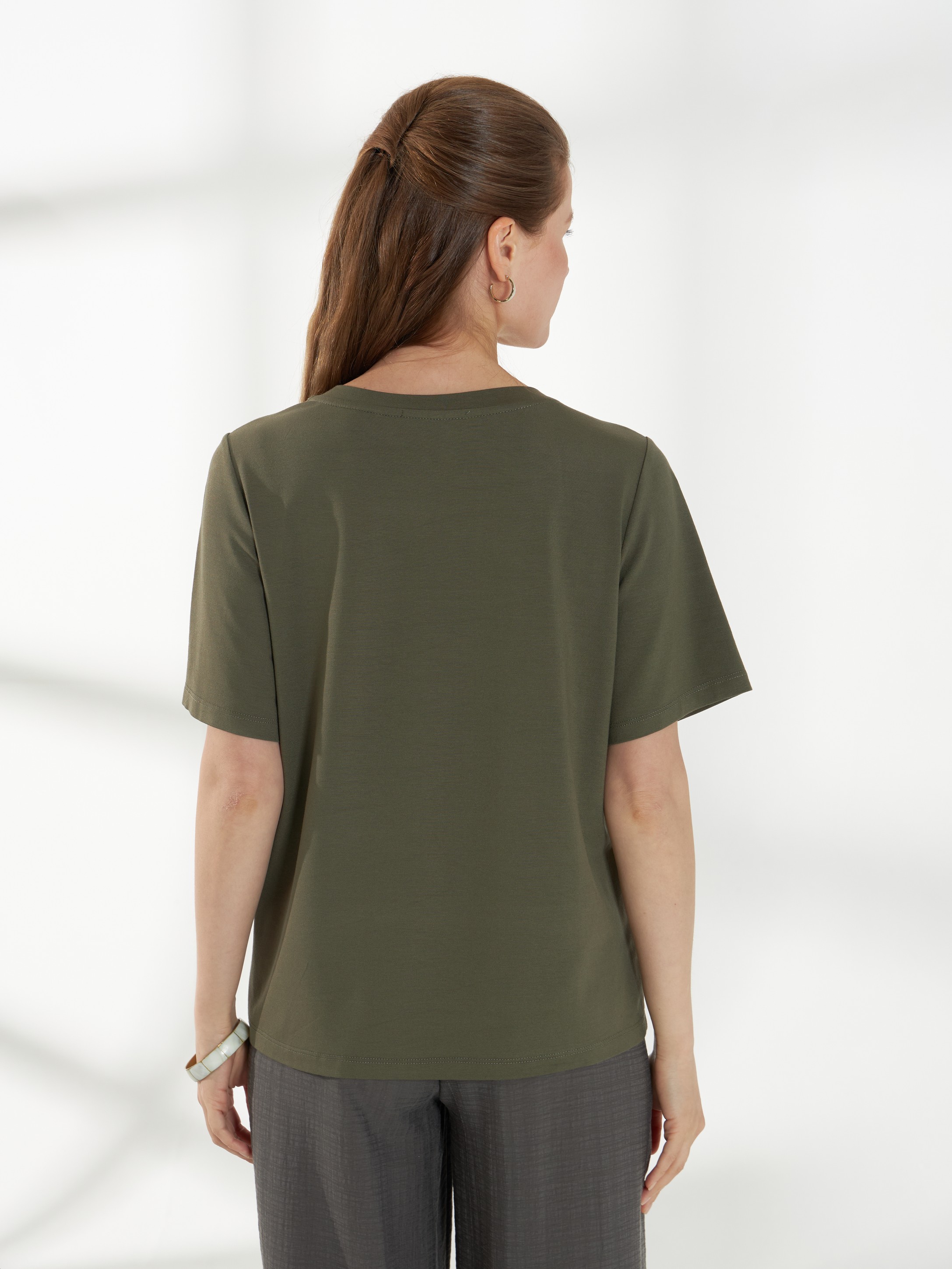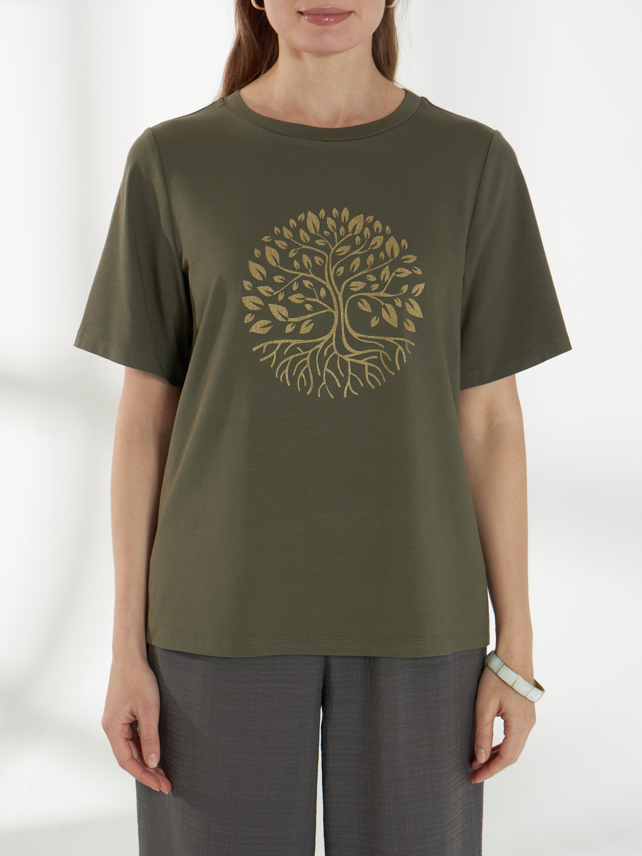 Свободный джемпер с короткими рукавами и круглой горловиной, выполненный из мягкого и приятного к телу трикотажа в зеленом оттенке. Спереди украшен авторским орнаментом «Дерево» в форме круга с золотым напылением, который добавляет элегантный акцент и делает модель выразительной.