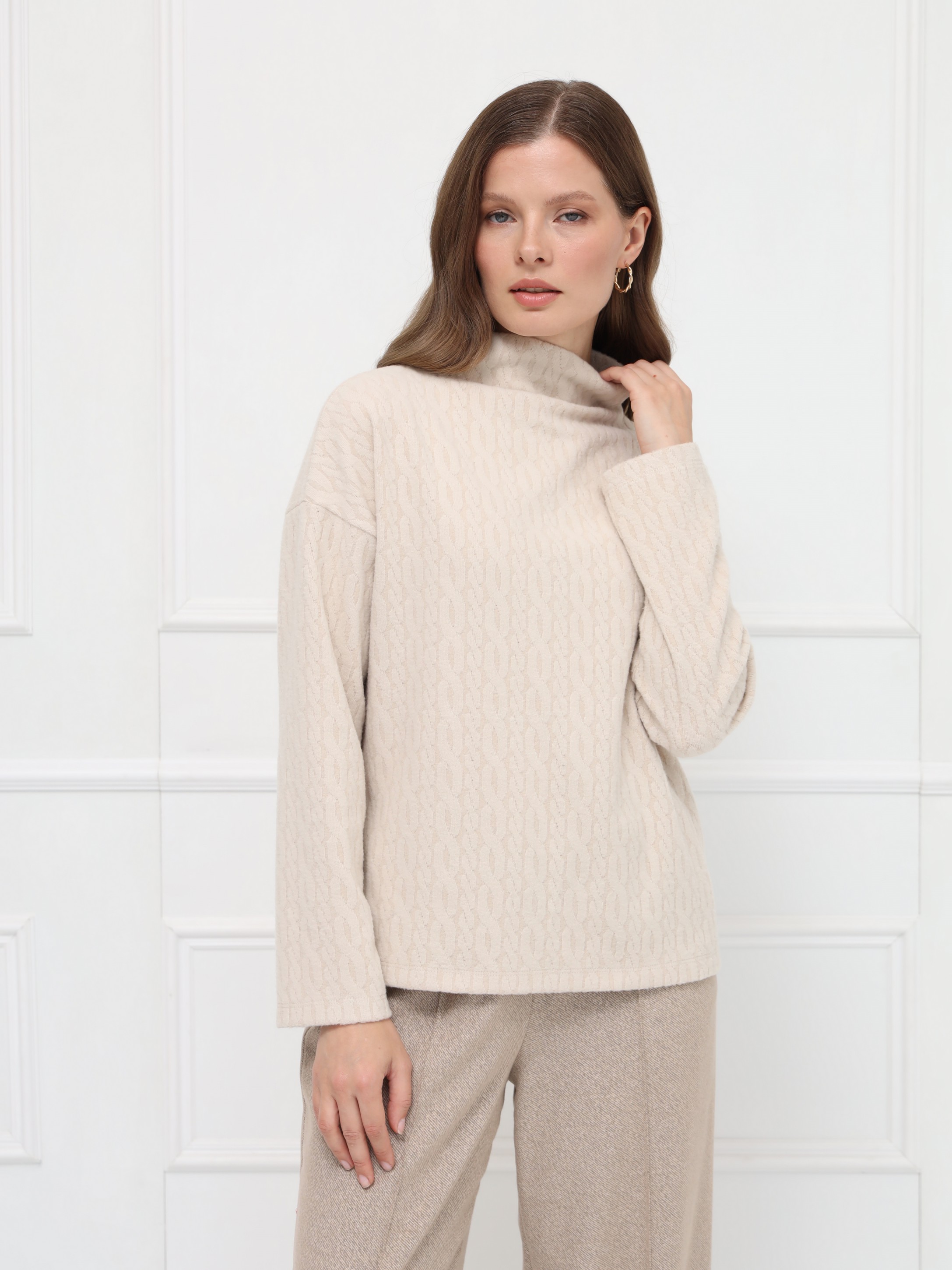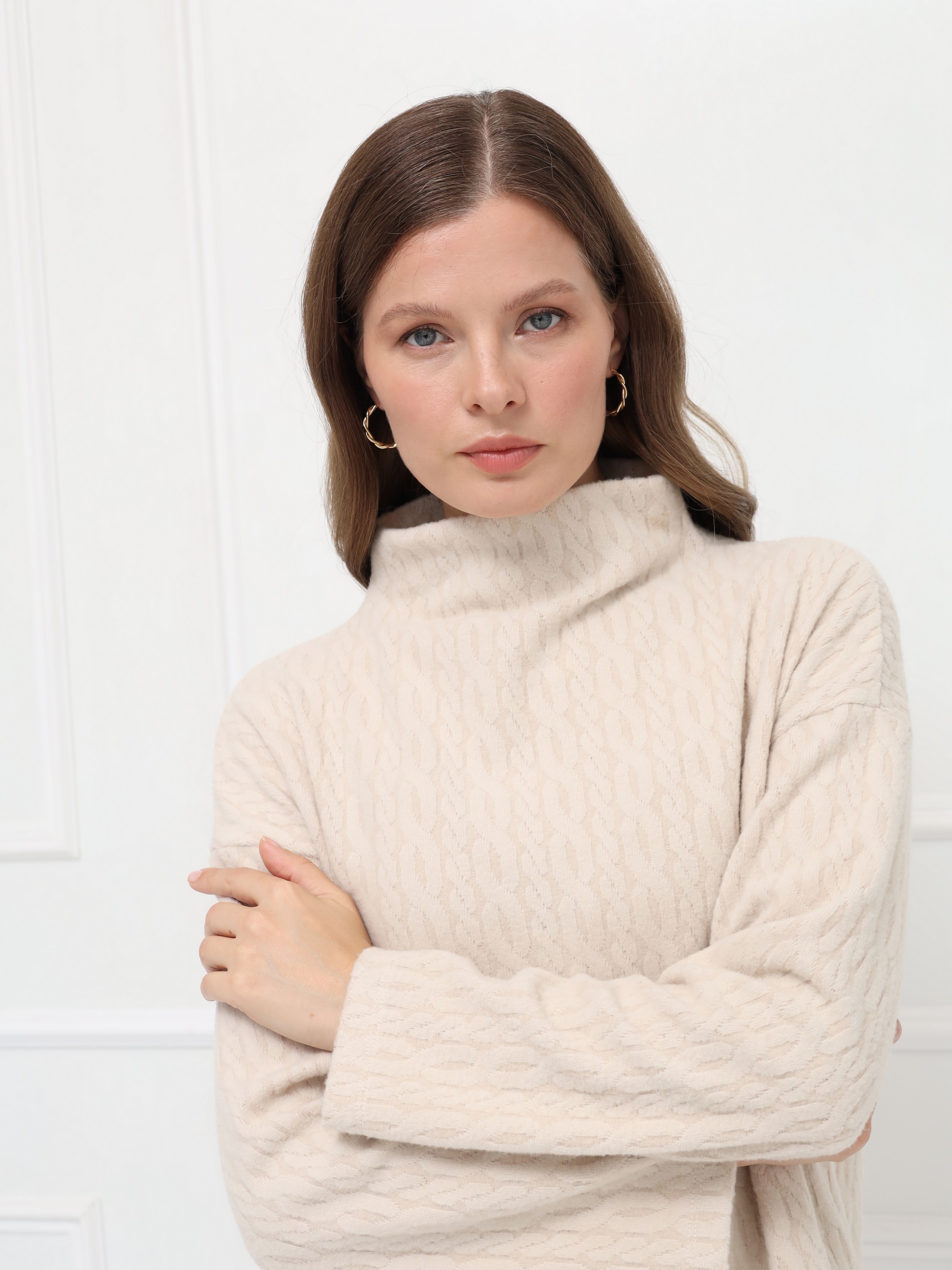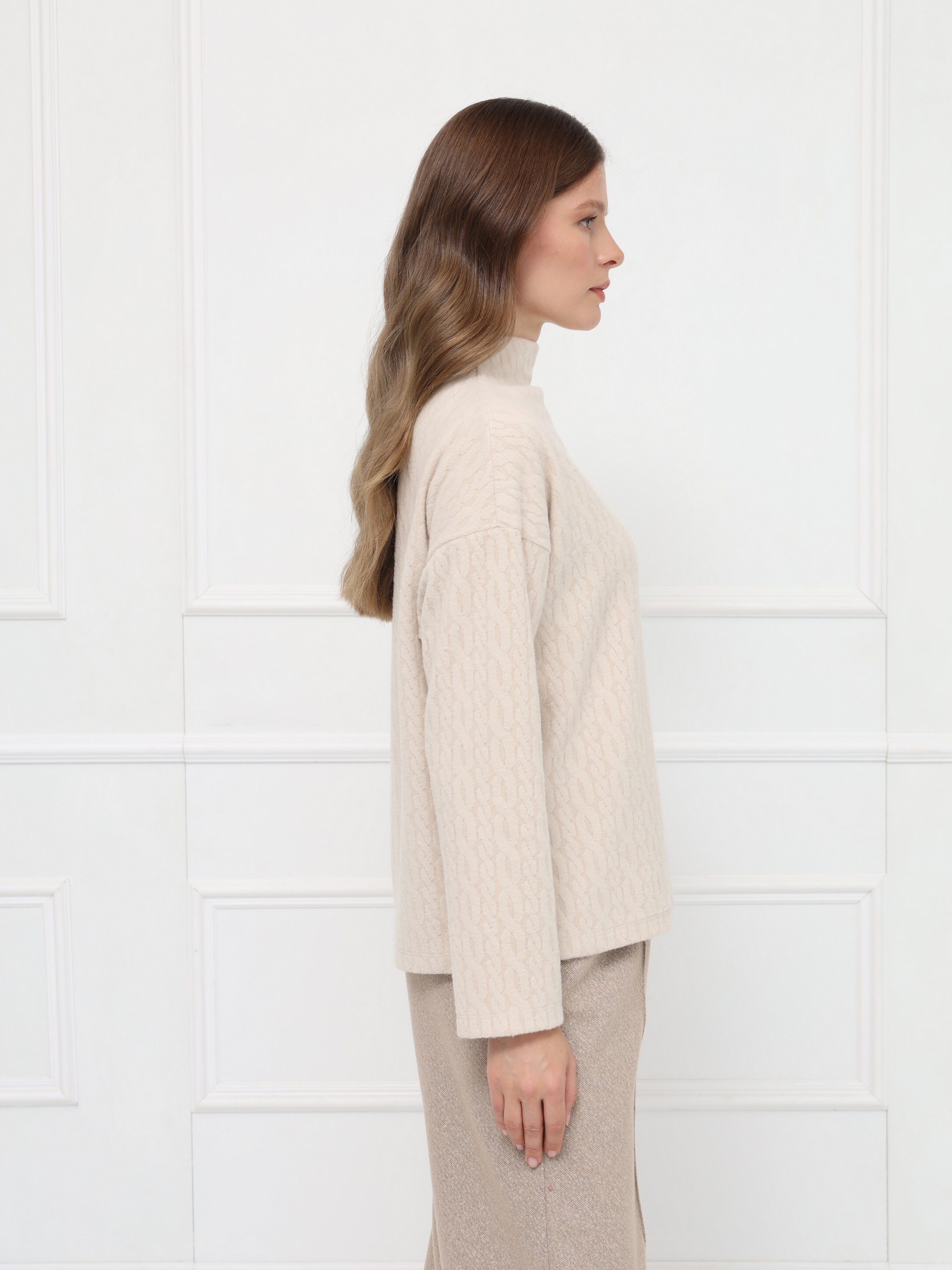 Джемпер из невесомого трикотажа с плетением «косы», невероятно уютный, приятный к телу. Свободный силуэт и спущенная линия плеч подчёркивают непринуждённость, а аккуратная стойка завершает образ.