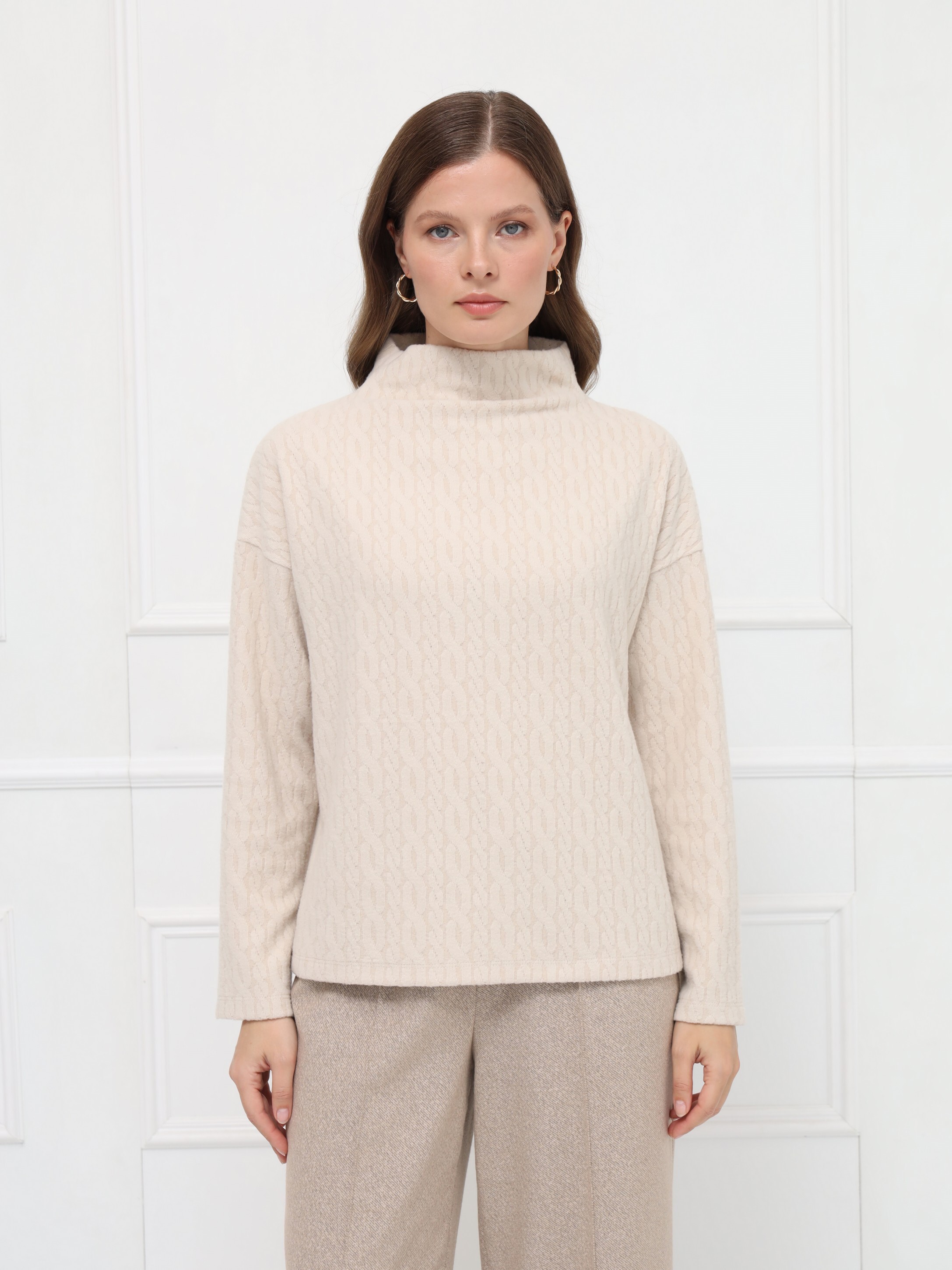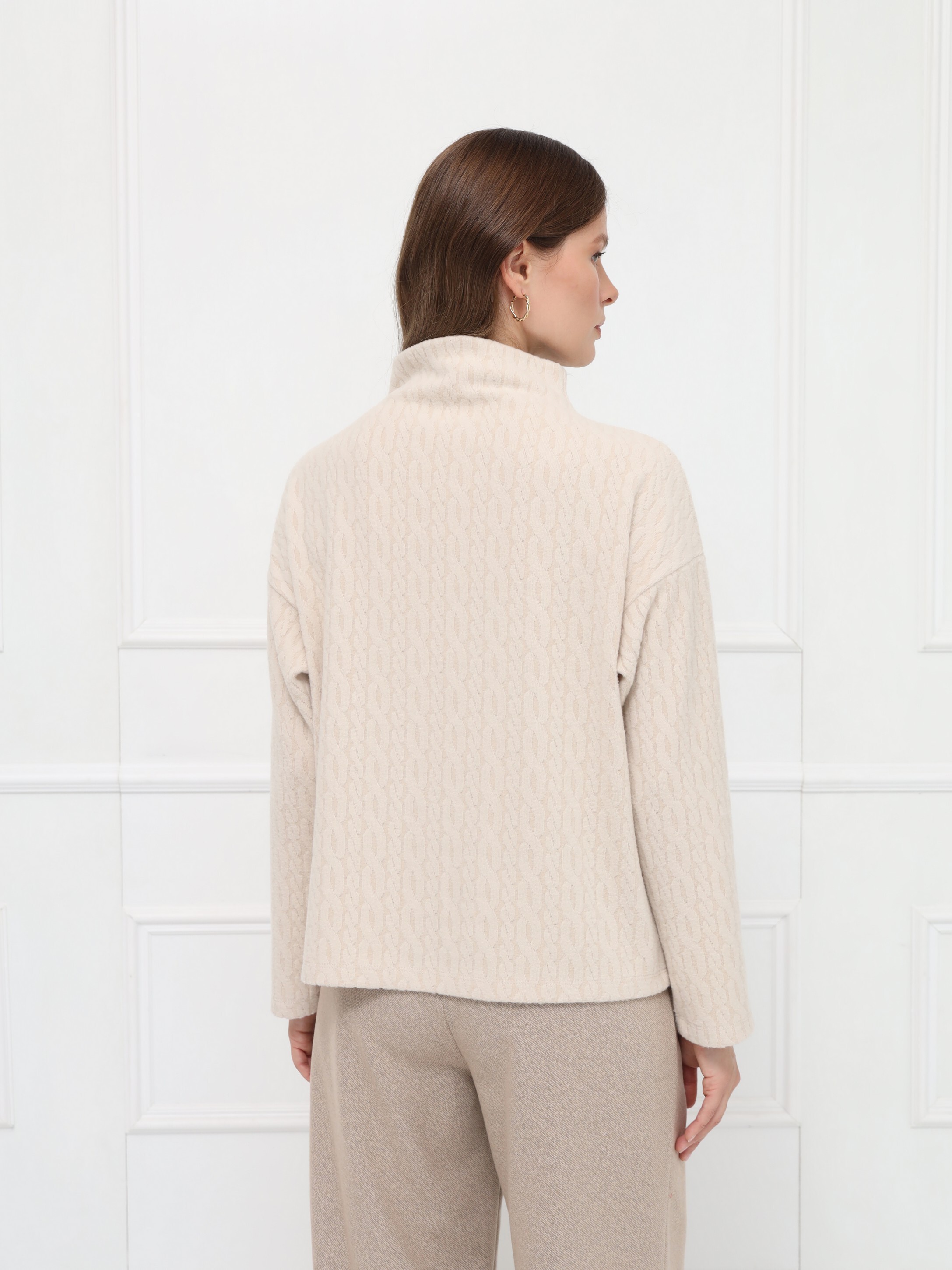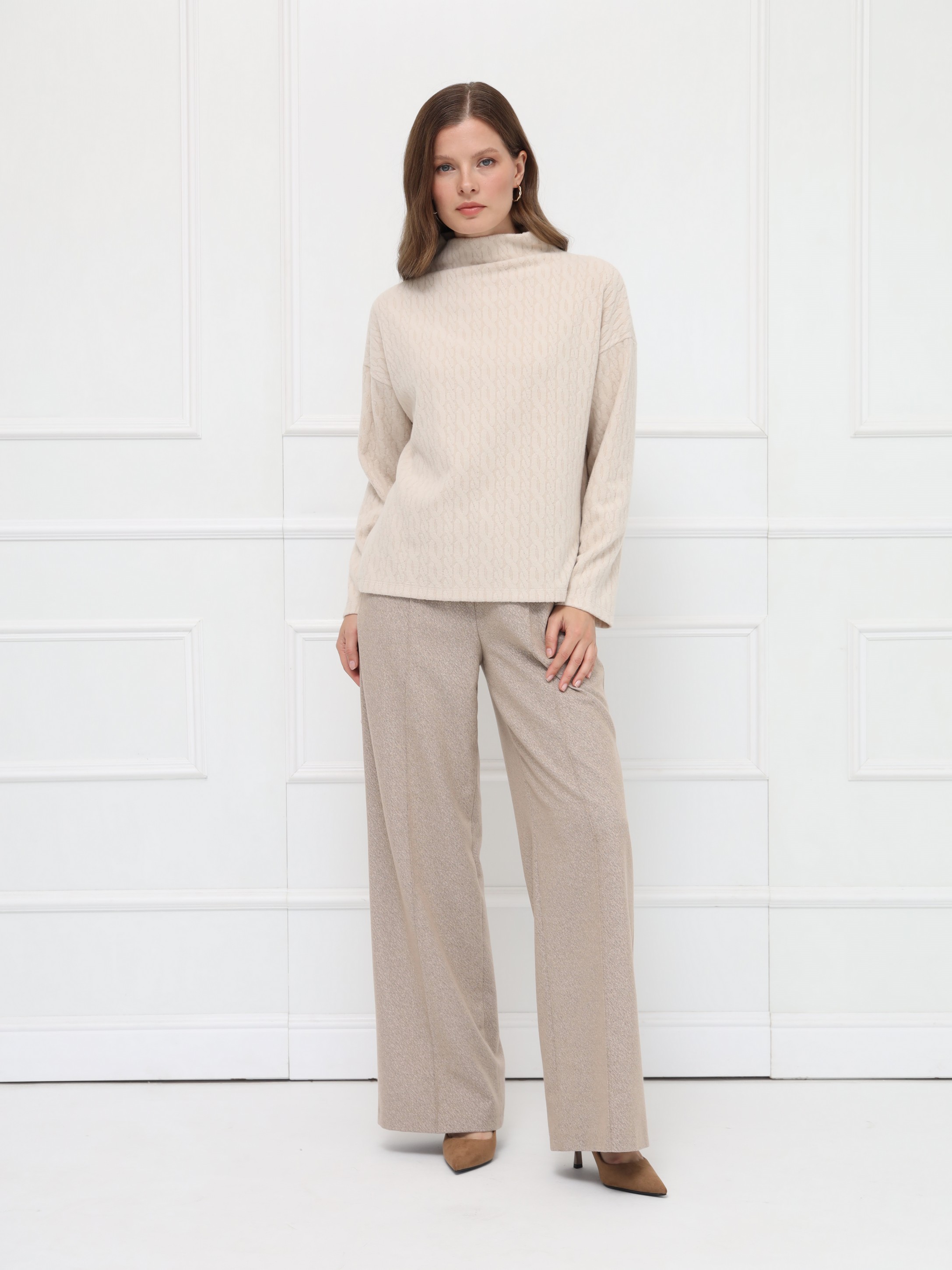 Джемпер из невесомого трикотажа с плетением «косы», невероятно уютный, приятный к телу. Свободный силуэт и спущенная линия плеч подчёркивают непринуждённость, а аккуратная стойка завершает образ.
