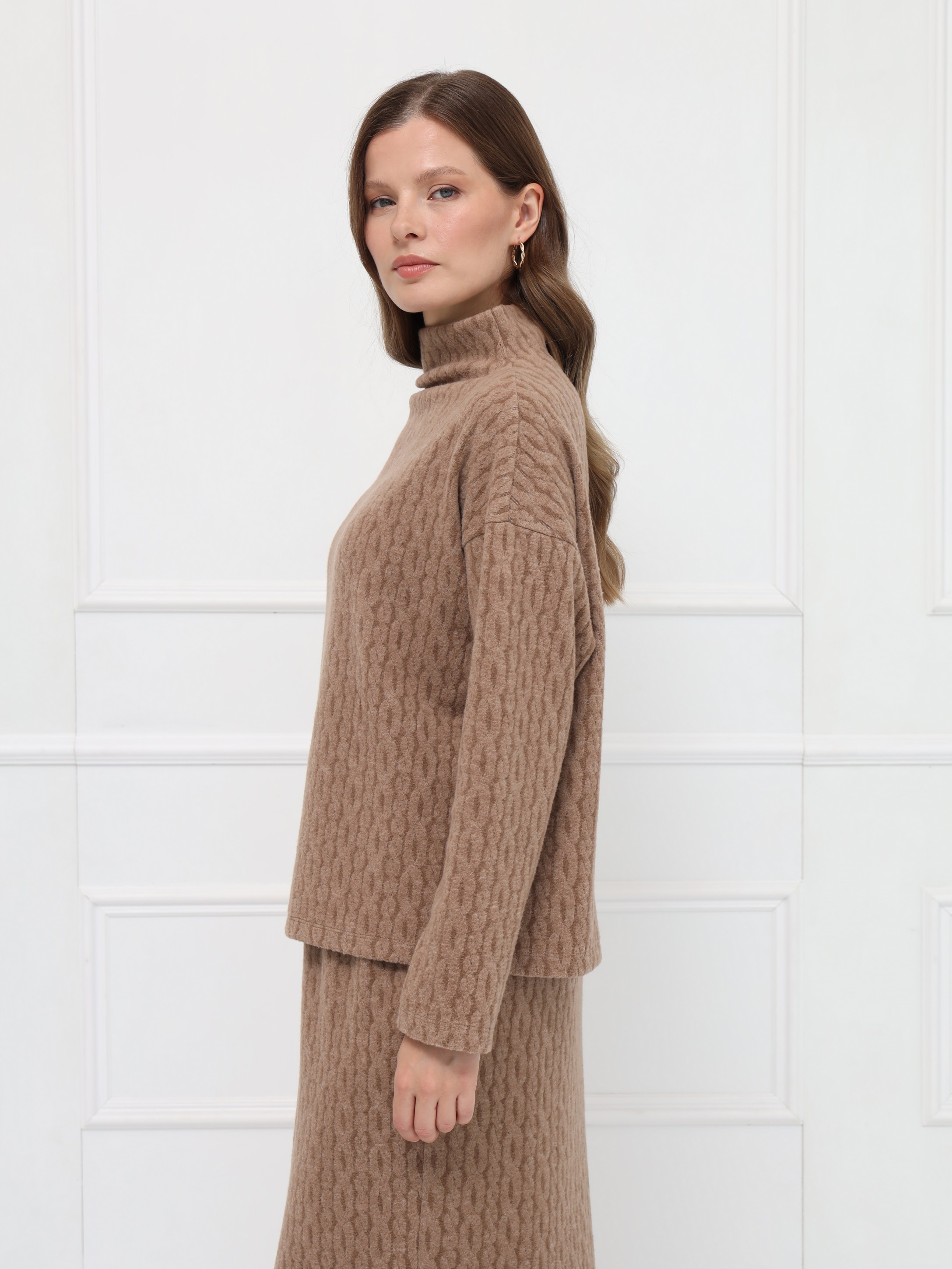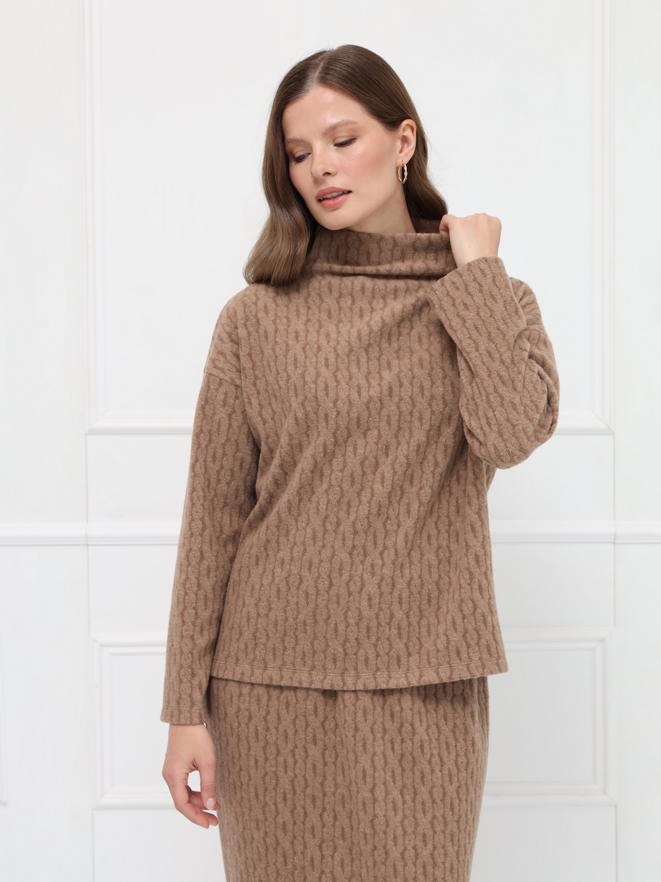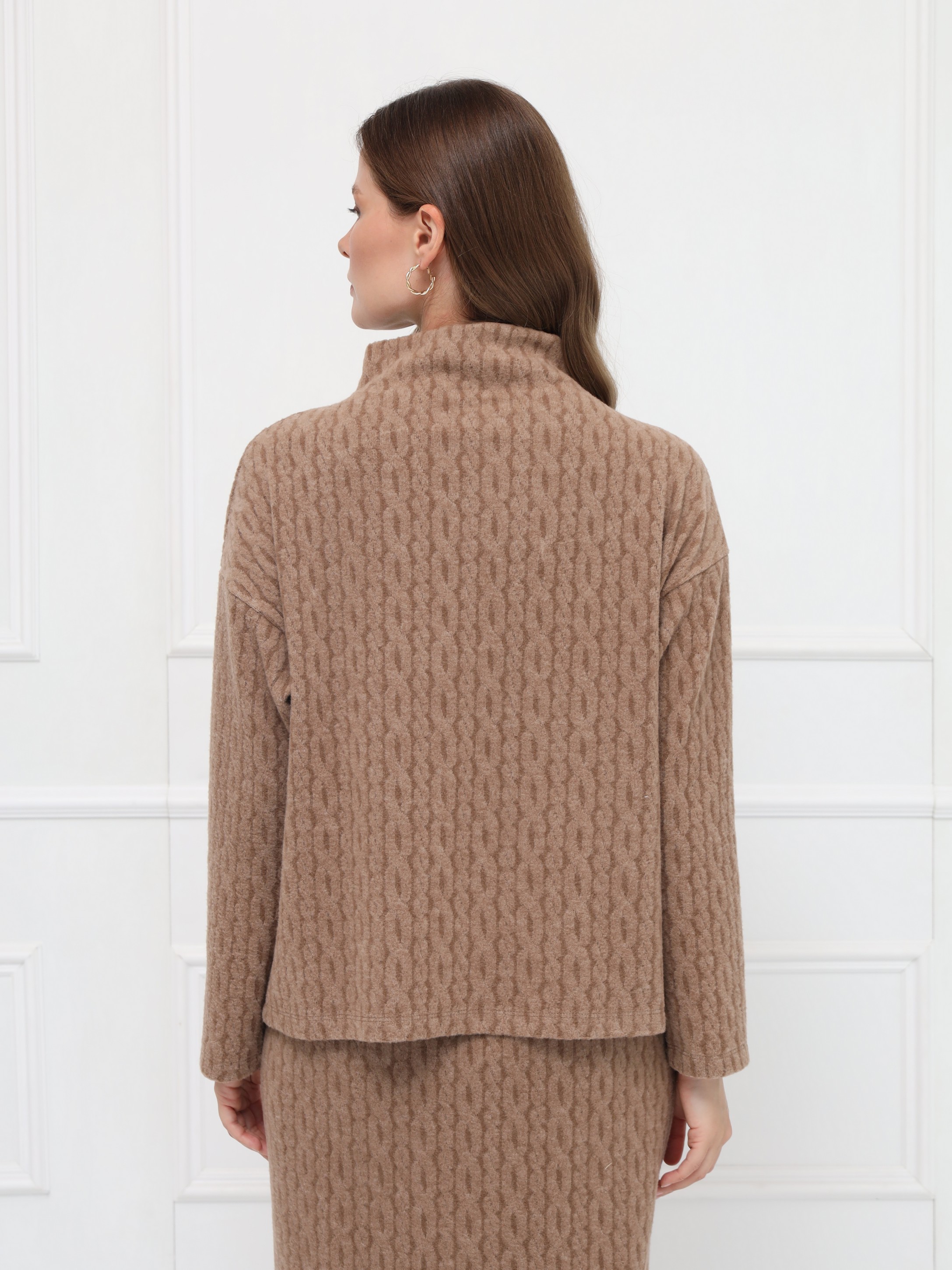 Стильный джемпер цвета кемел из невесомого трикотажа с плетением «косы», невероятно уютный, приятный к телу. Свободный силуэт и спущенная линия плеч подчёркивают непринуждённость, а аккуратная стойка завершает образ.