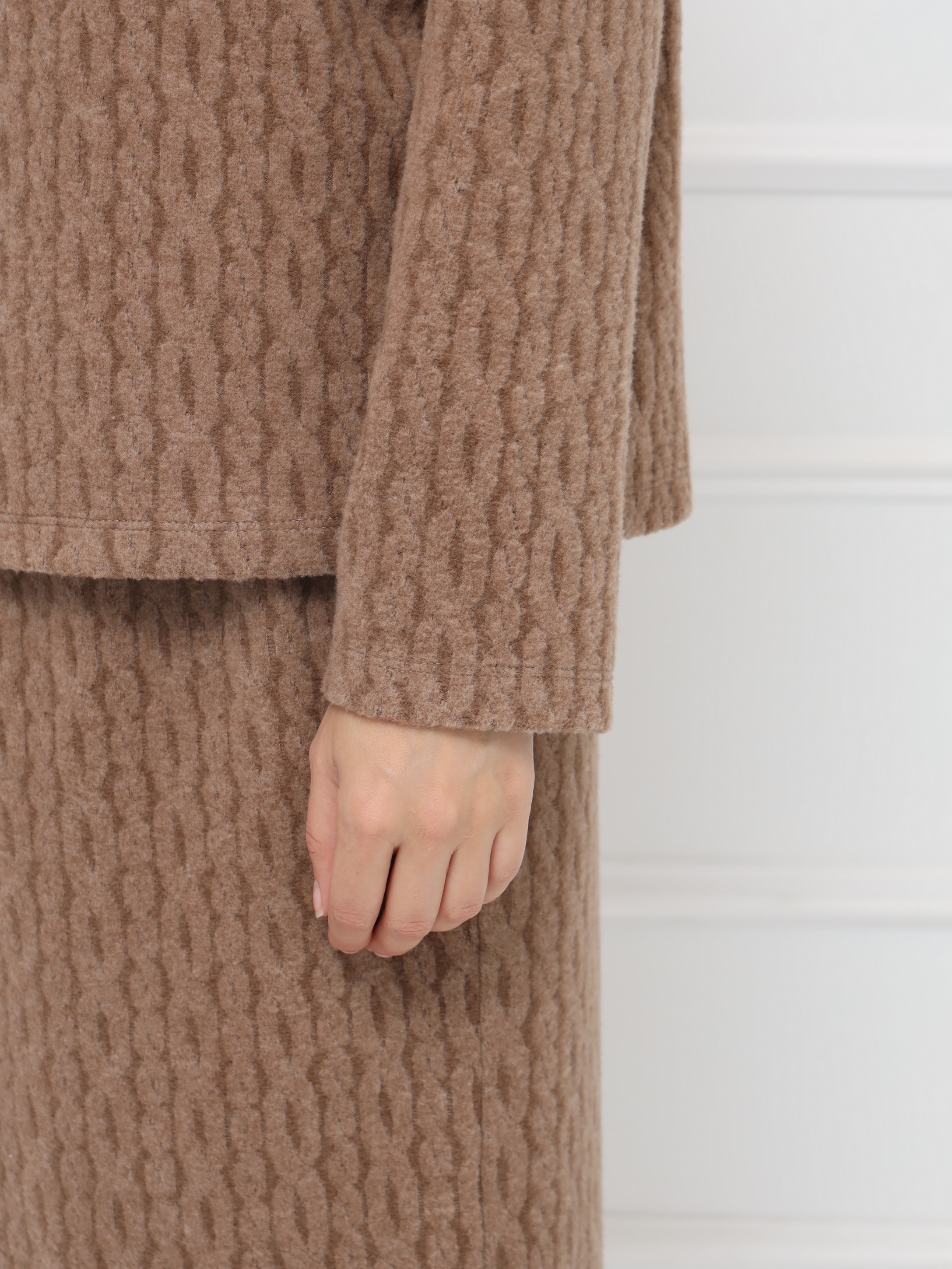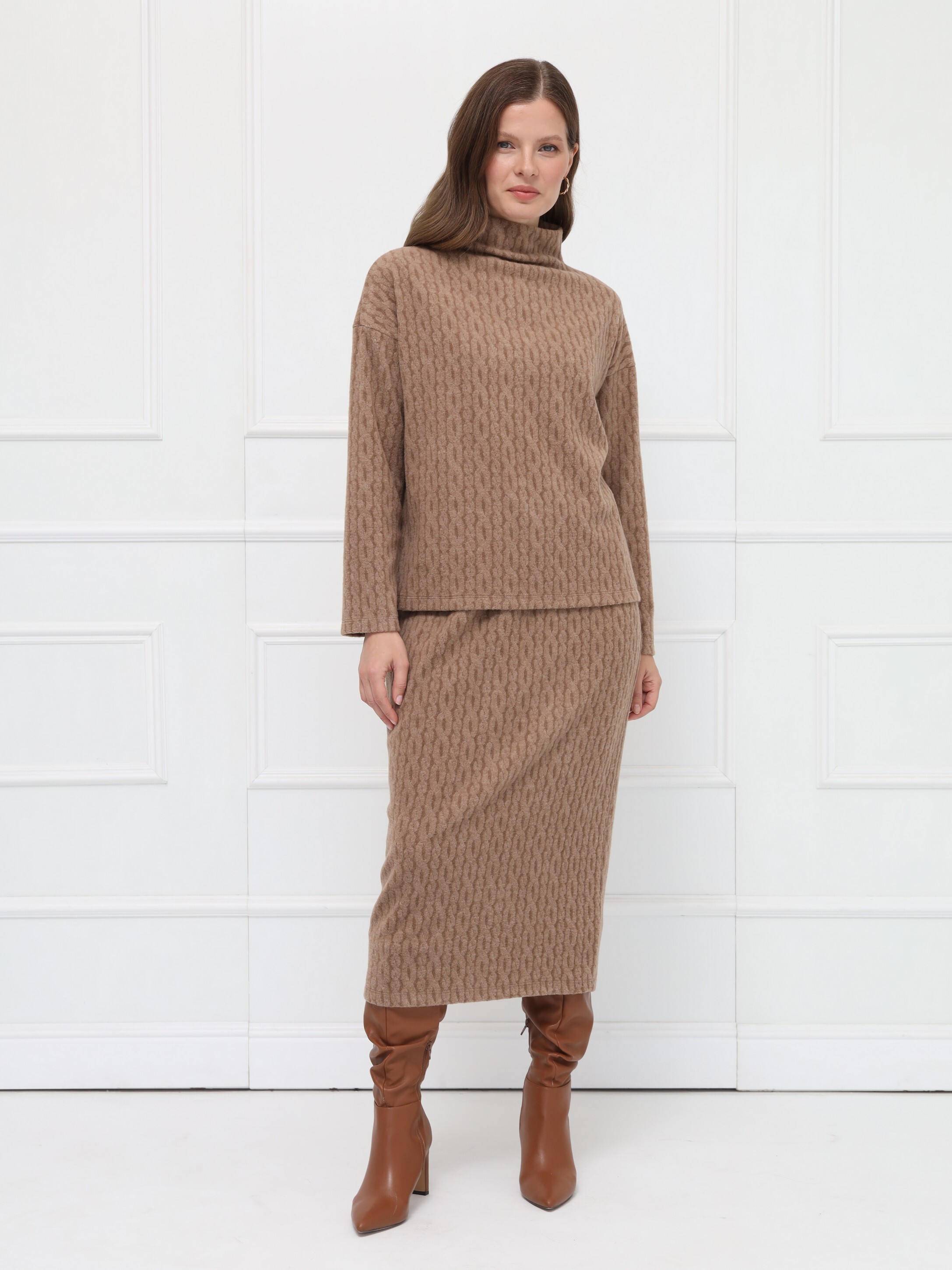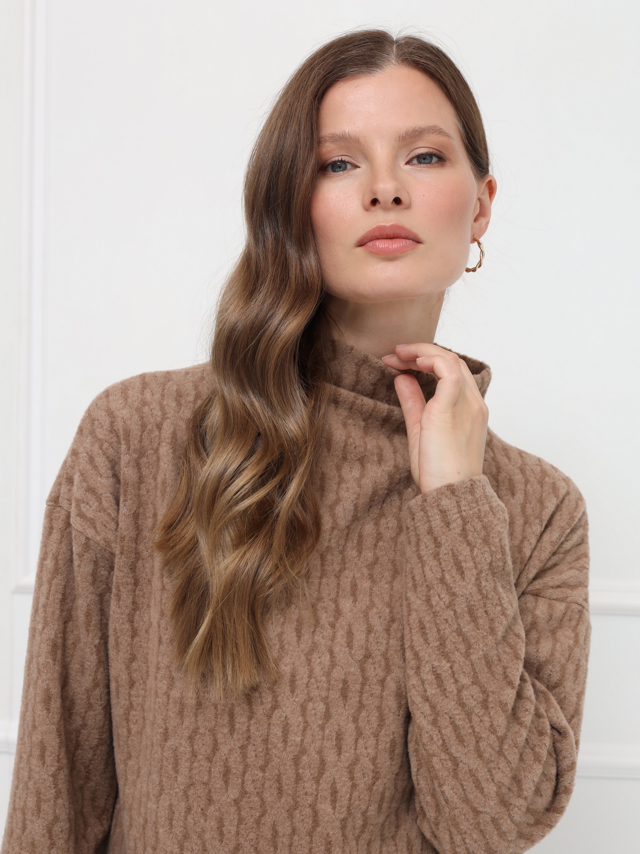 Стильный джемпер цвета кемел из невесомого трикотажа с плетением «косы», невероятно уютный, приятный к телу. Свободный силуэт и спущенная линия плеч подчёркивают непринуждённость, а аккуратная стойка завершает образ.