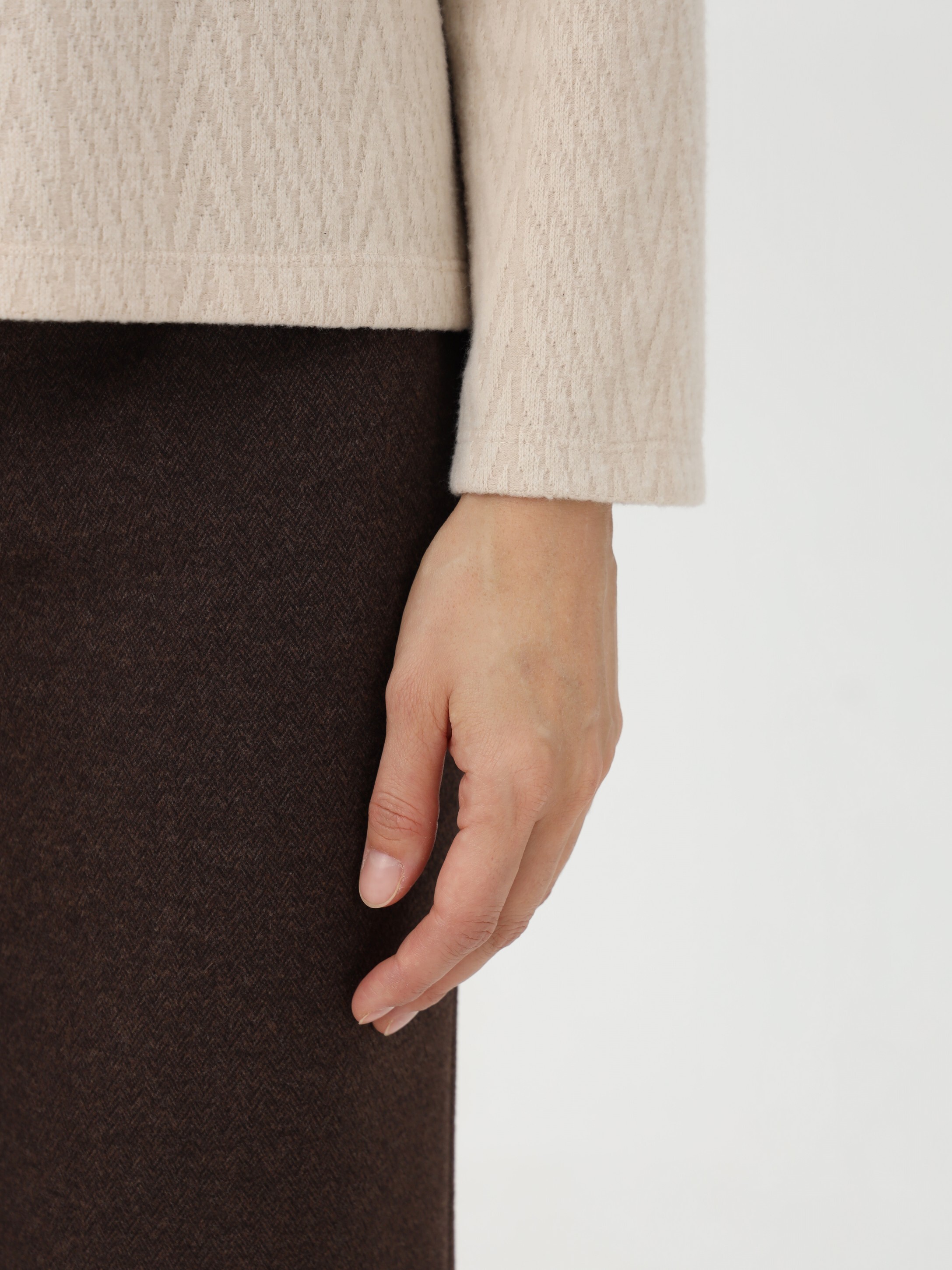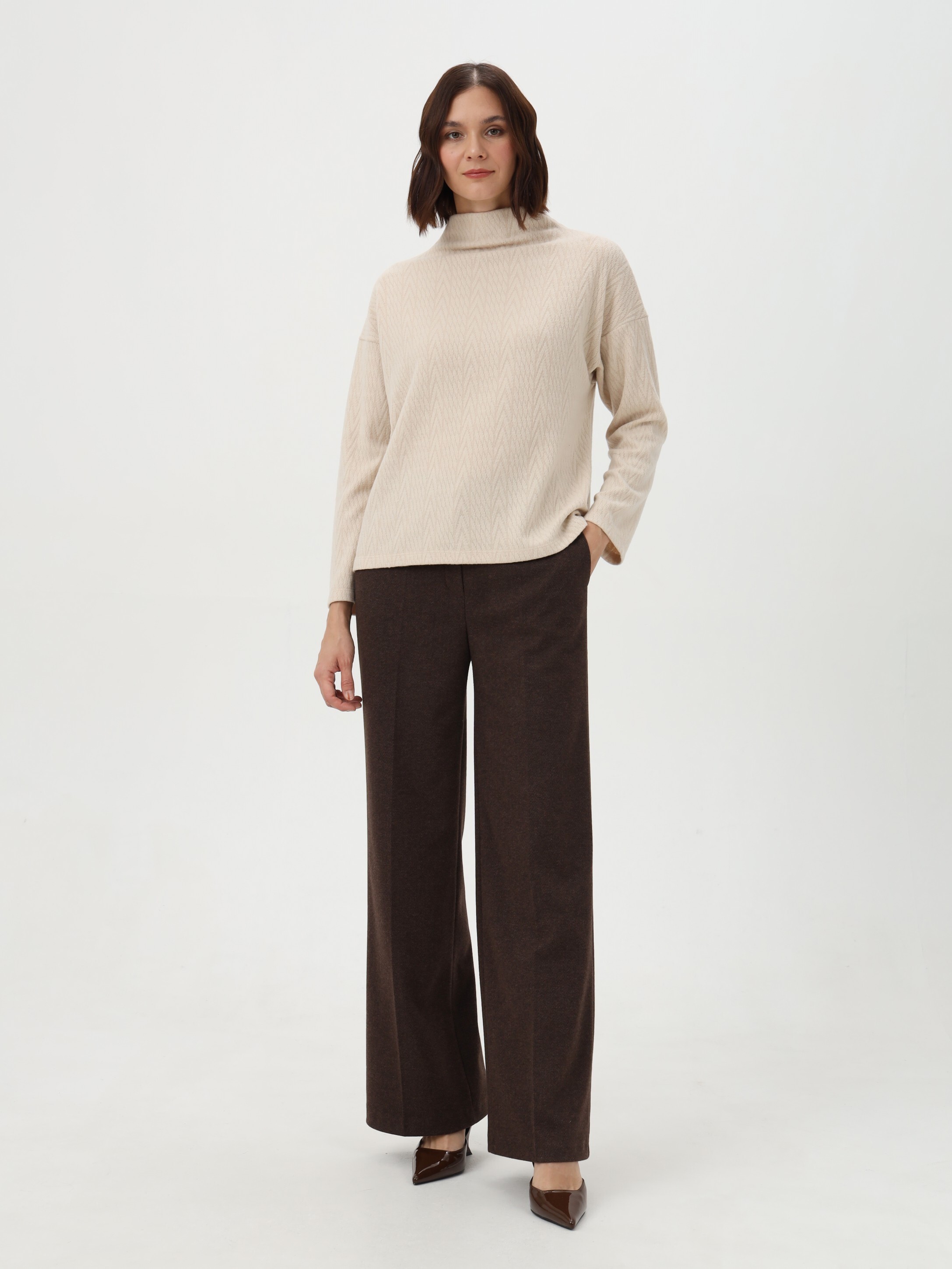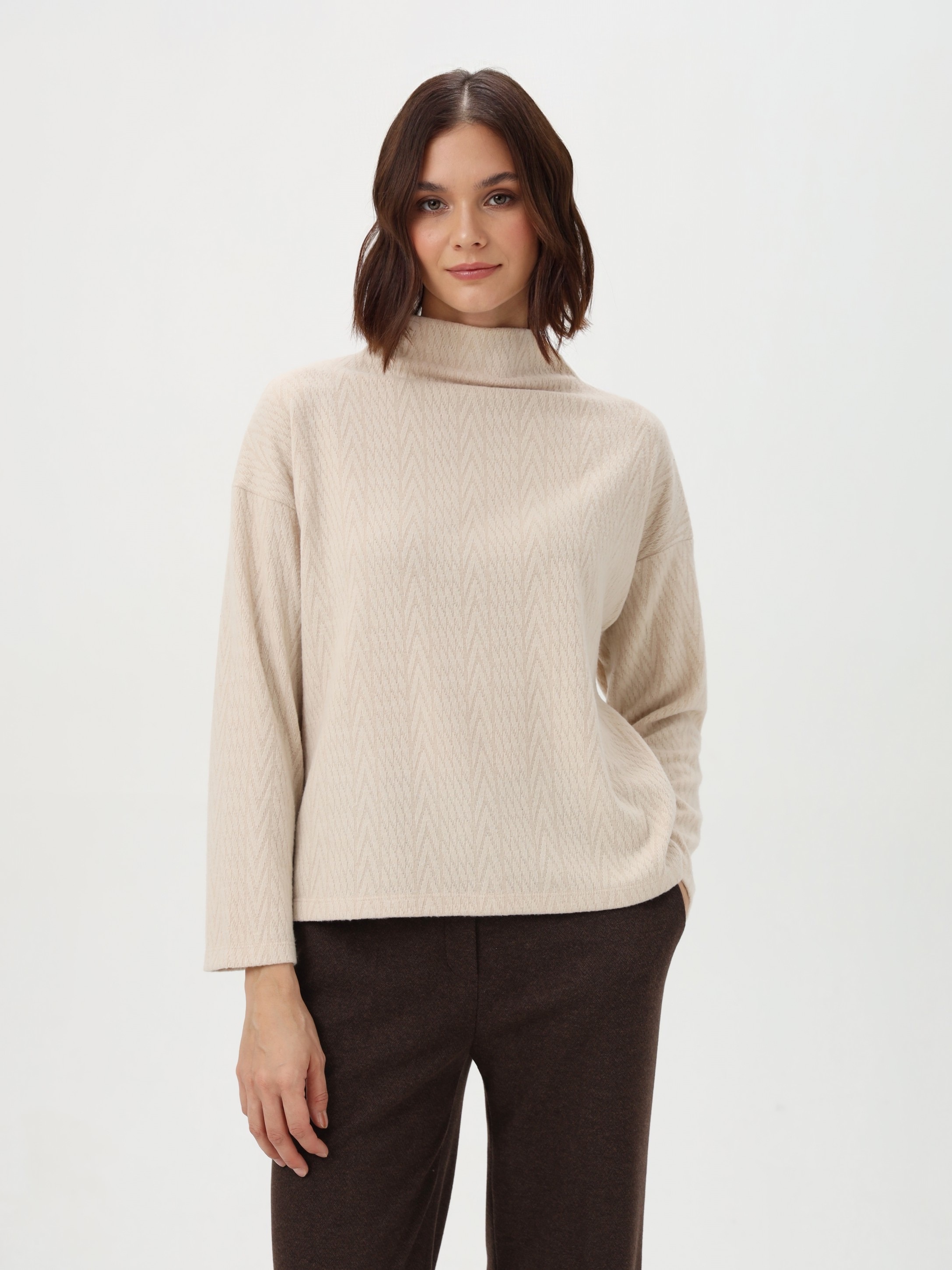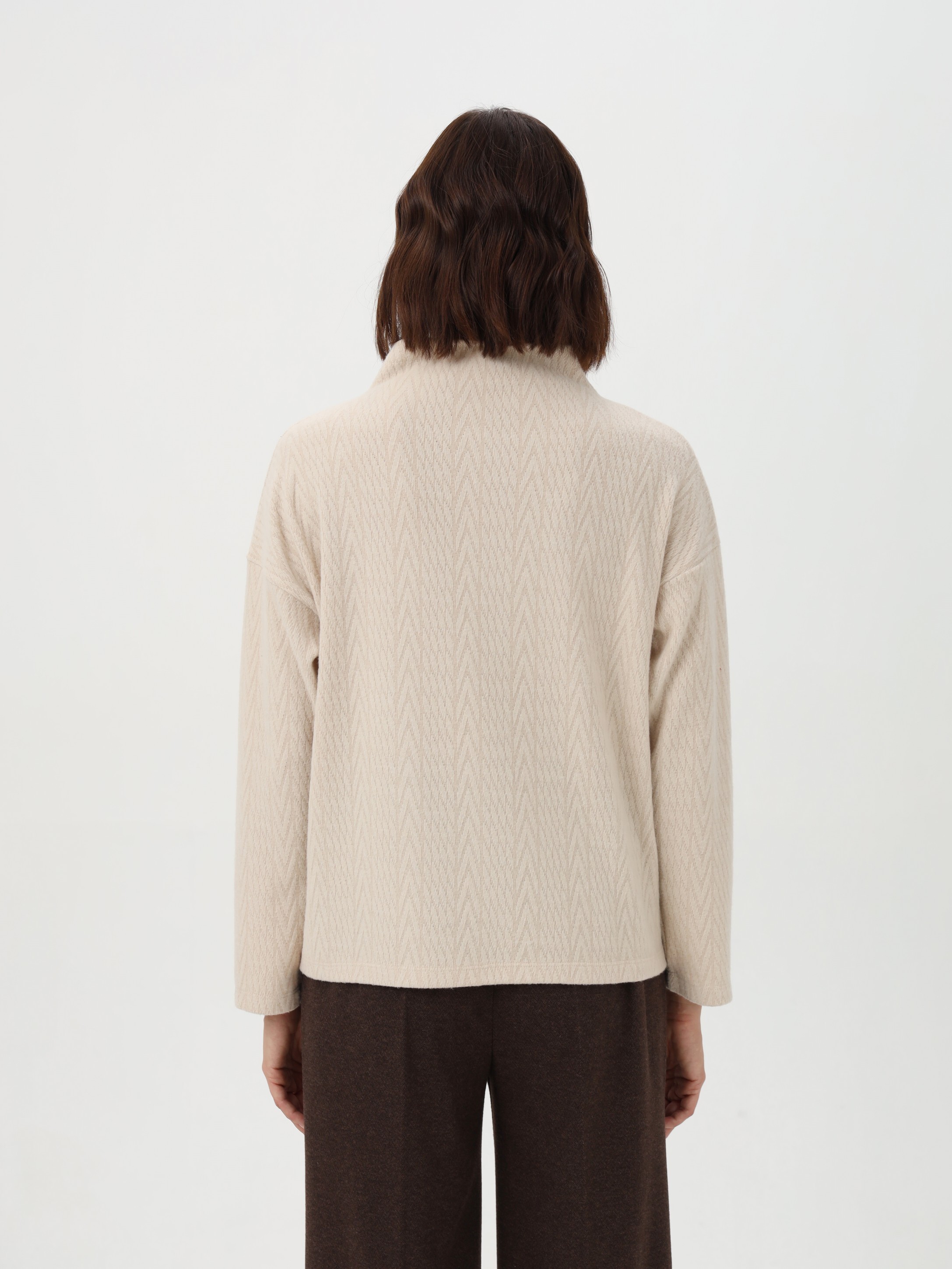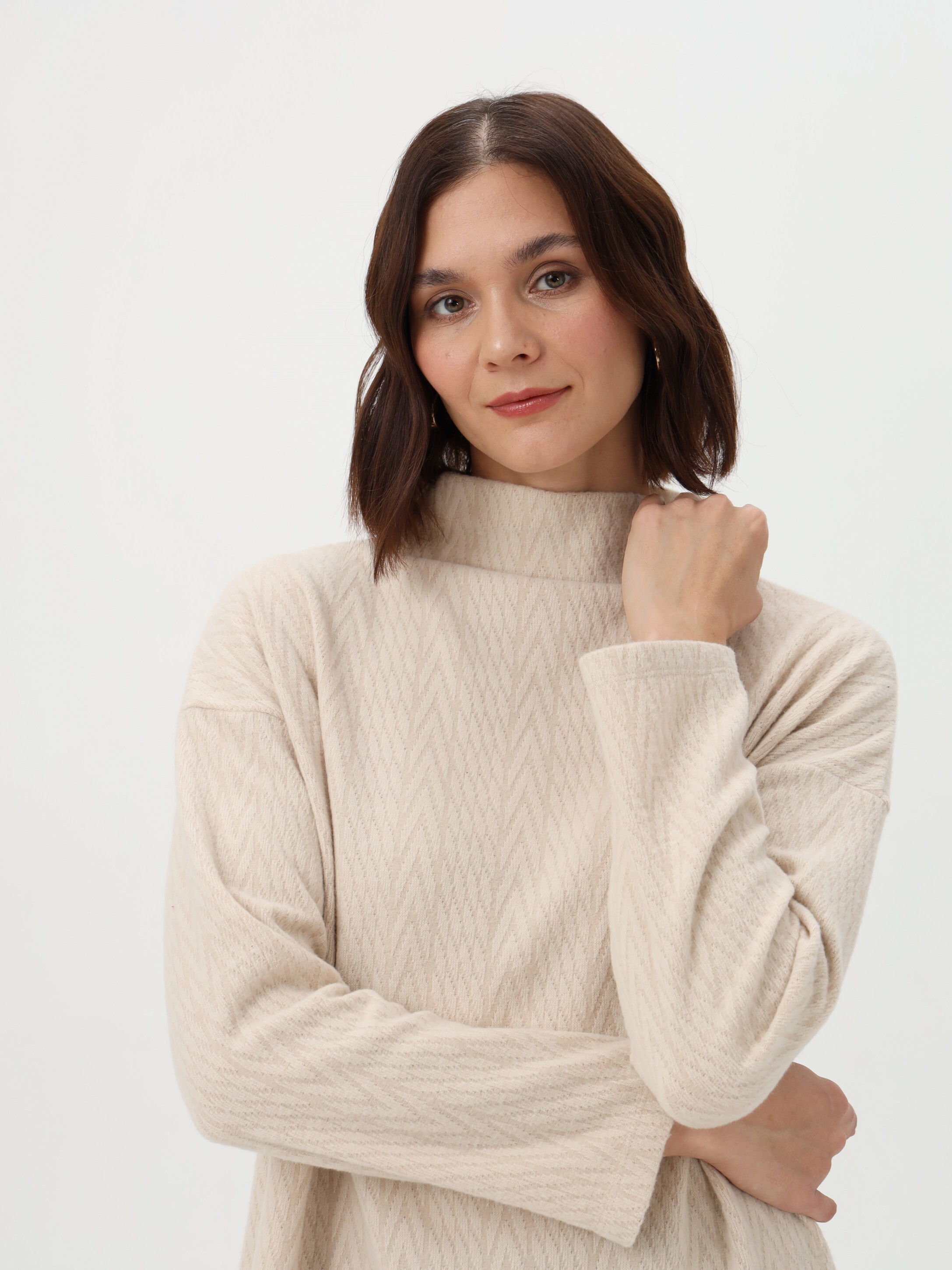 Джемпер из невесомого трикотажа , невероятно уютный, приятный к телу. Свободный силуэт и спущенная линия плеч подчёркивают непринуждённость, а аккуратная стойка завершает образ.