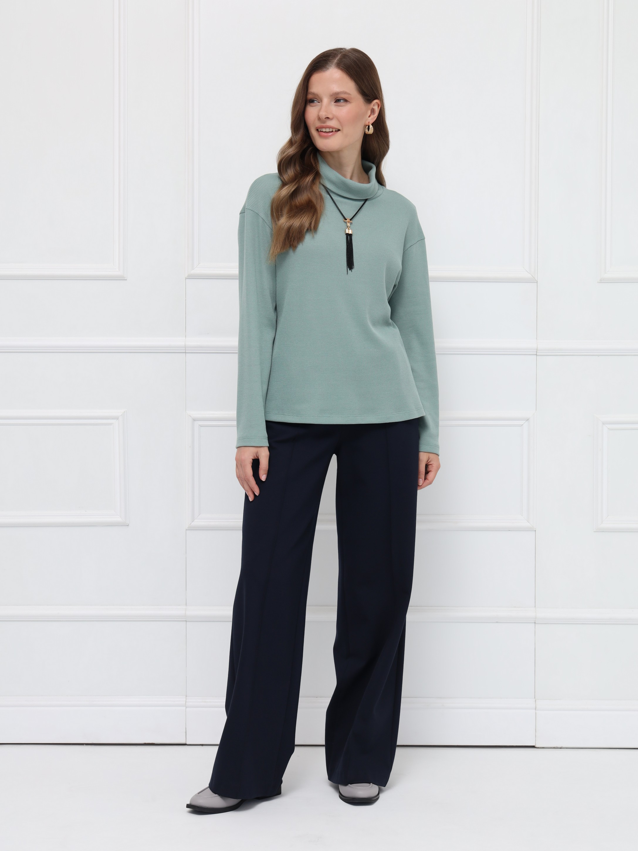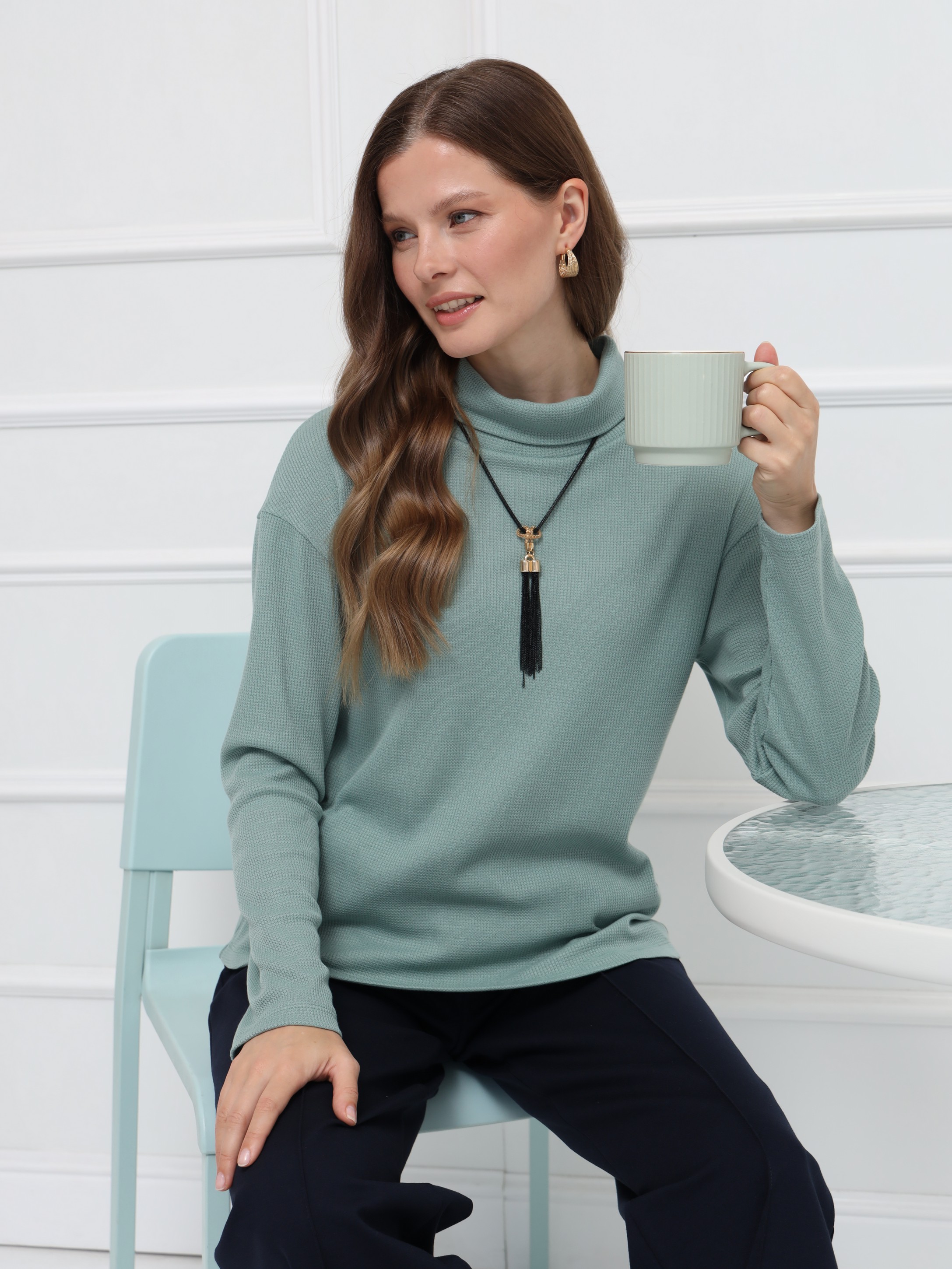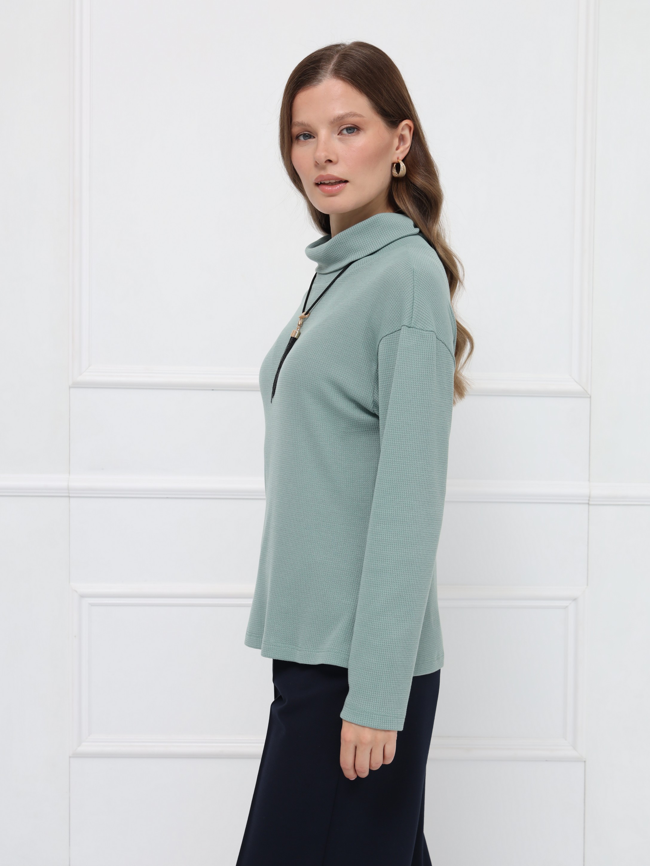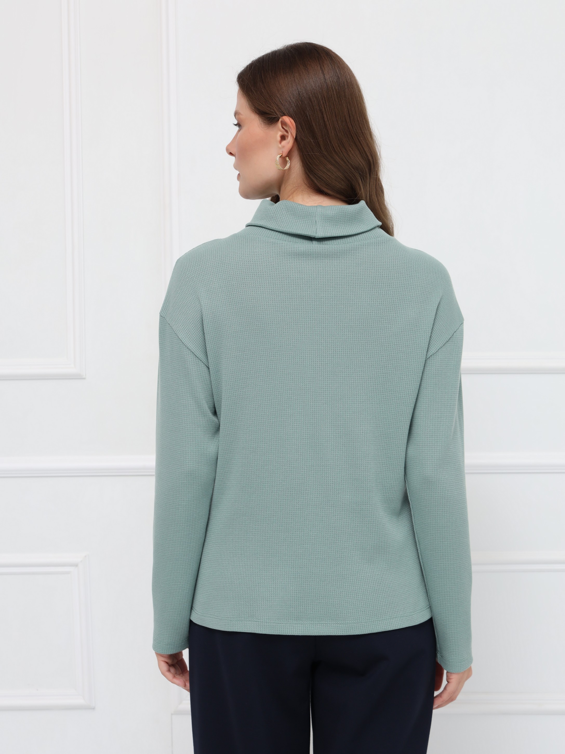 Джемпер оттенка «снежная мята» - идеальный выбор для осенних образов. Прямой крой и уютный воротник-хомут создают расслабленный, но элегантный силуэт. Мягкий трикотаж нежно прилегает к телу и поддерживает комфортную температуру в течение дня.
