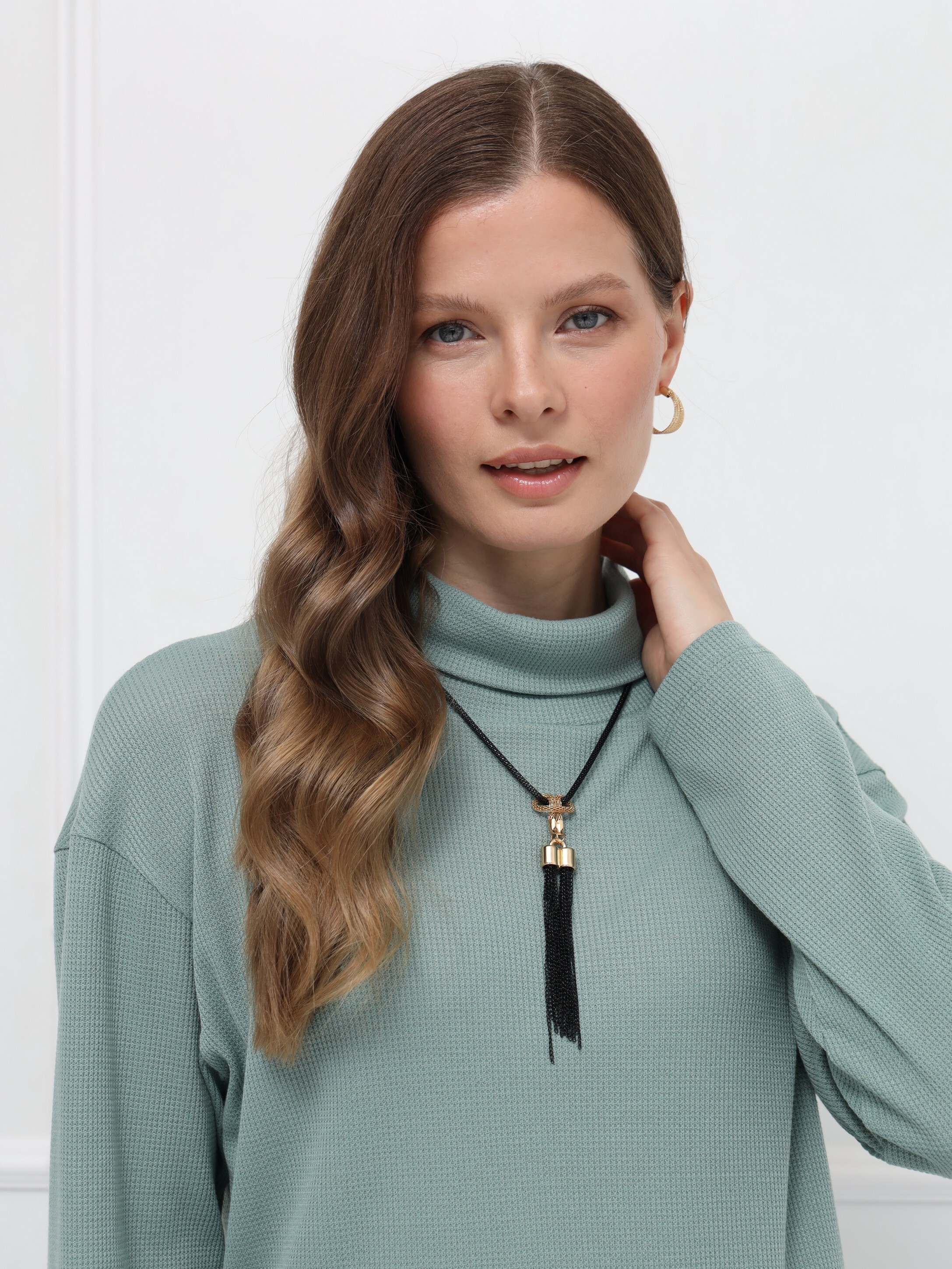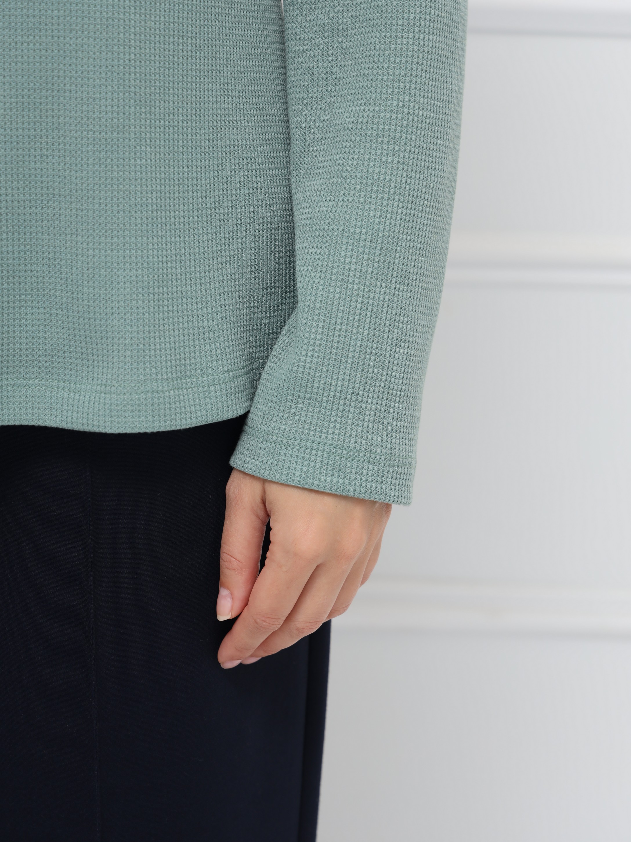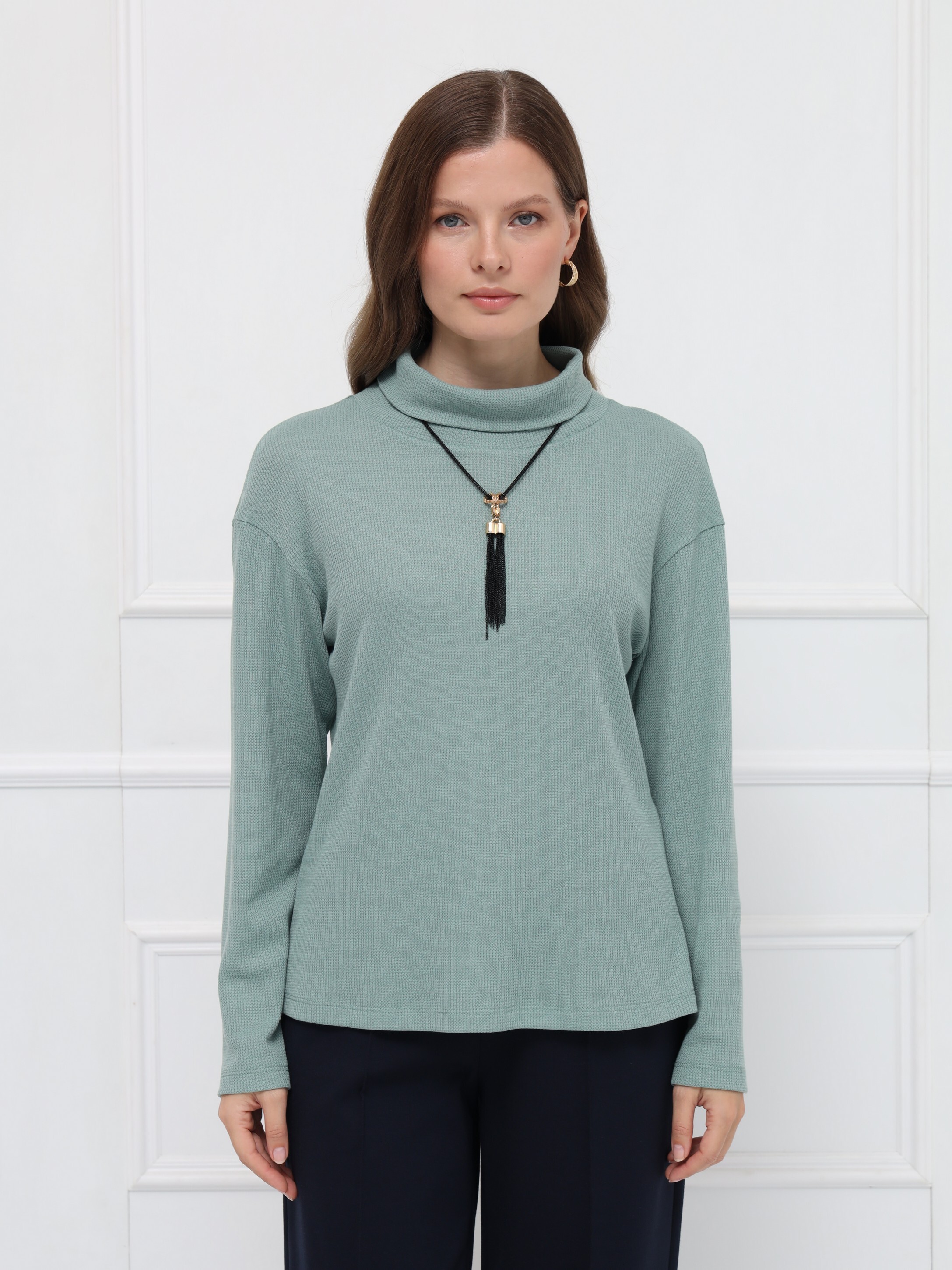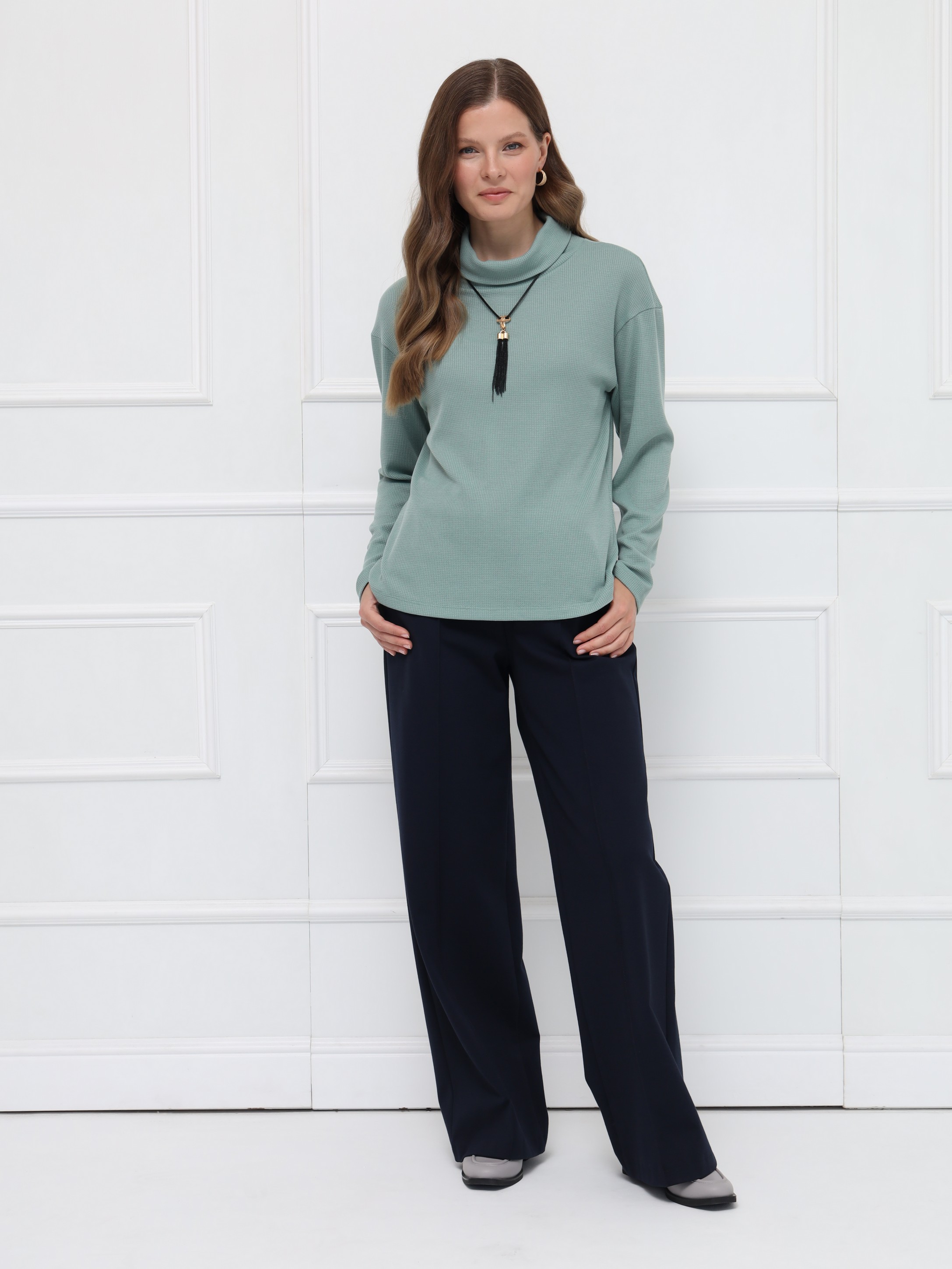 Джемпер оттенка «снежная мята» - идеальный выбор для осенних образов. Прямой крой и уютный воротник-хомут создают расслабленный, но элегантный силуэт. Мягкий трикотаж нежно прилегает к телу и поддерживает комфортную температуру в течение дня.