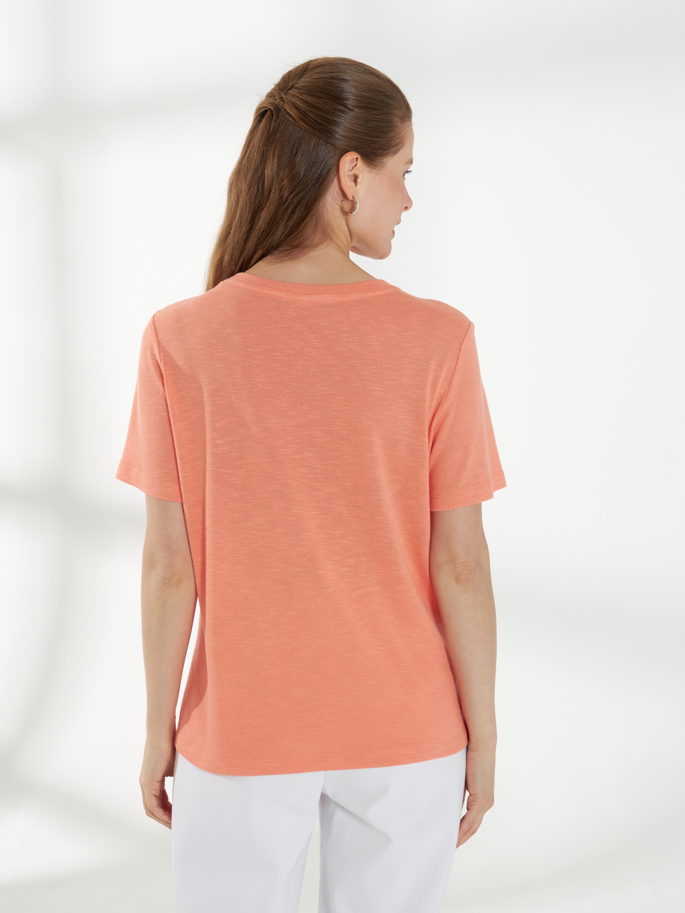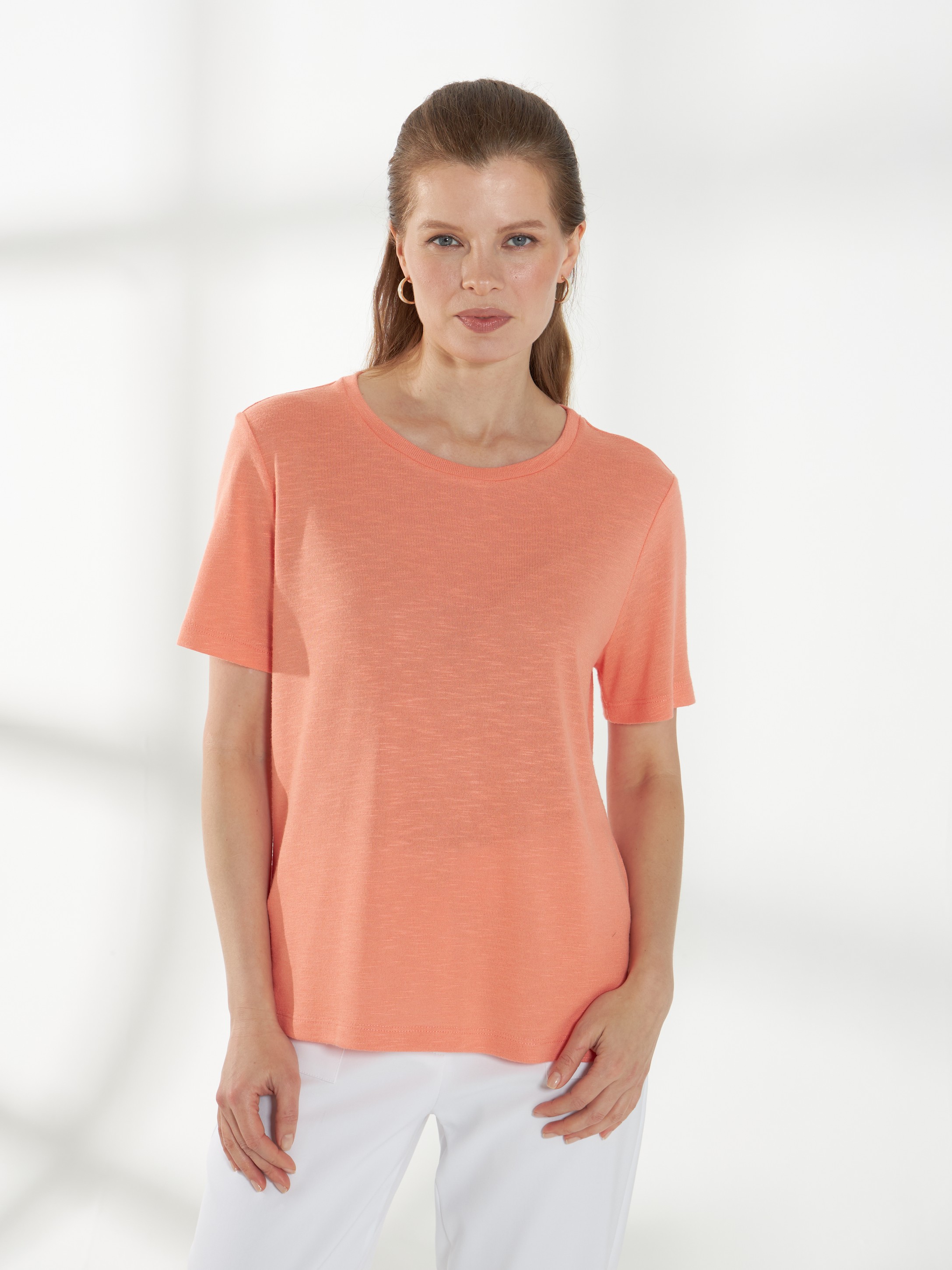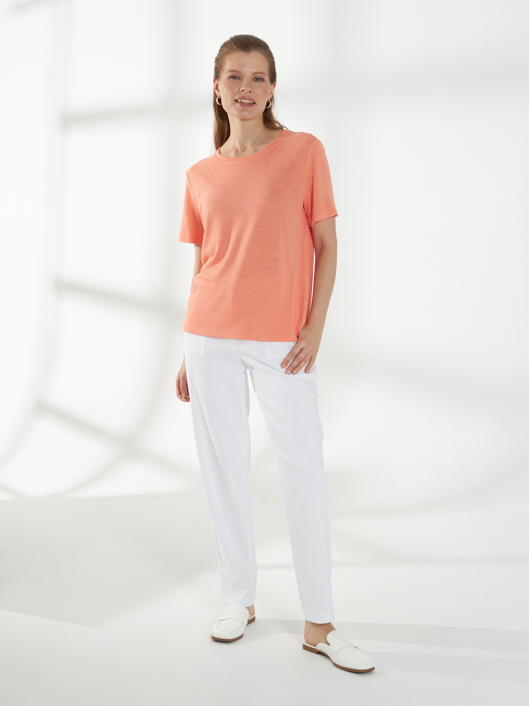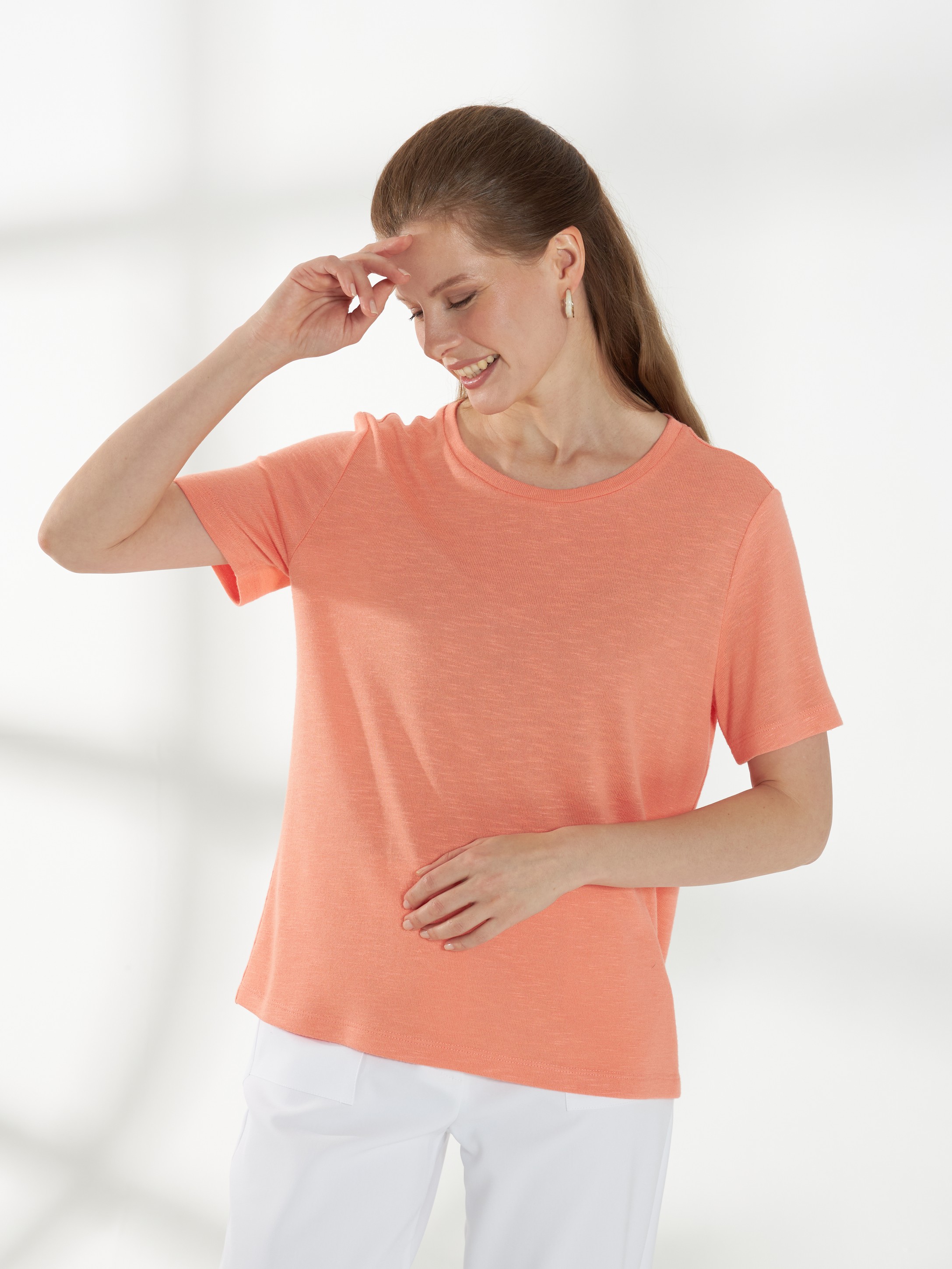 Легкий джемпер в ярком коралловом оттенке. Мягкий, приятный к телу трикотаж, обеспечивает комфорт в течение дня. Овальная горловина и короткие рукава создают аккуратный и свежий силуэт. Свободный крой подчеркивает легкость и воздушность модели.