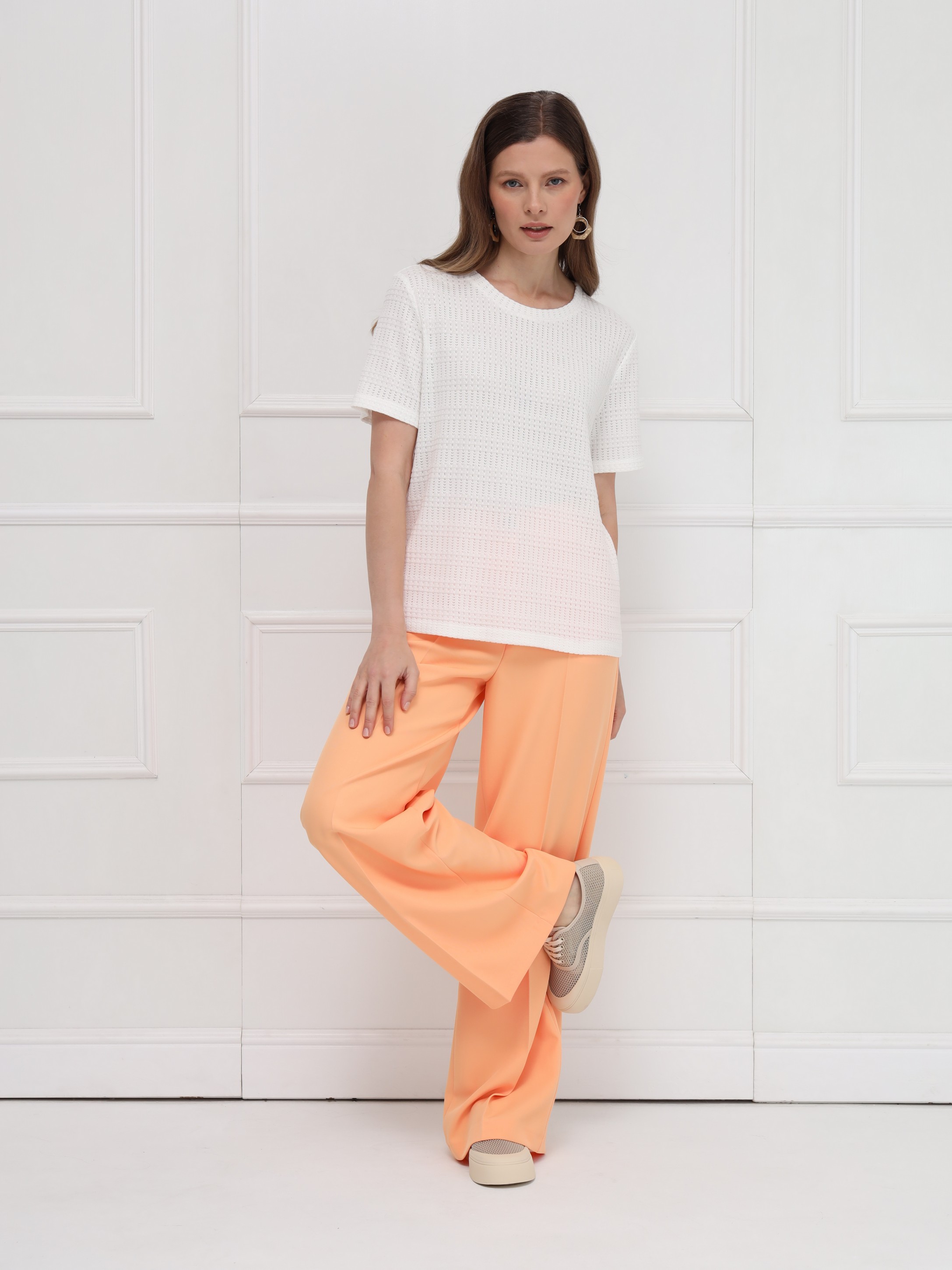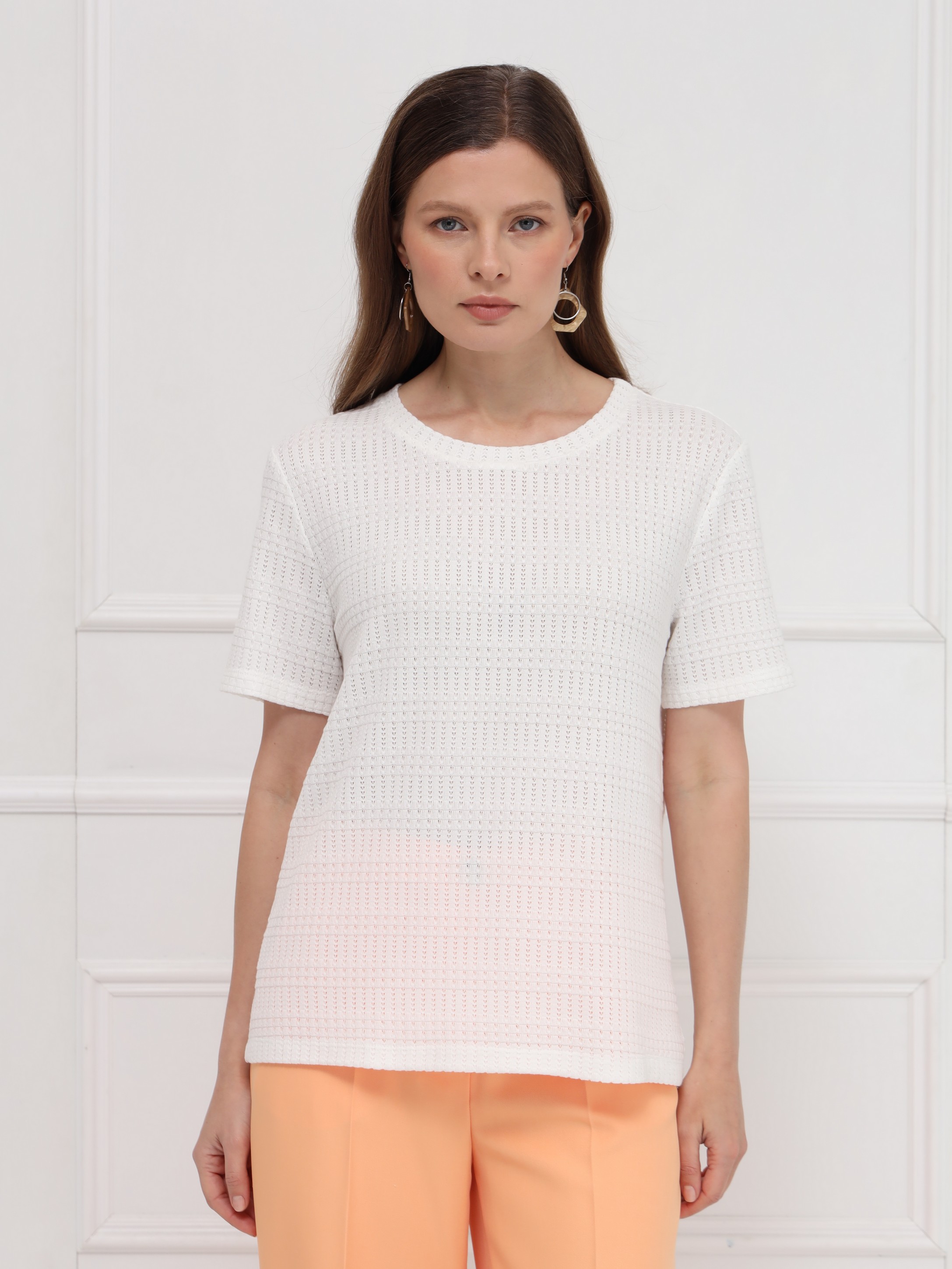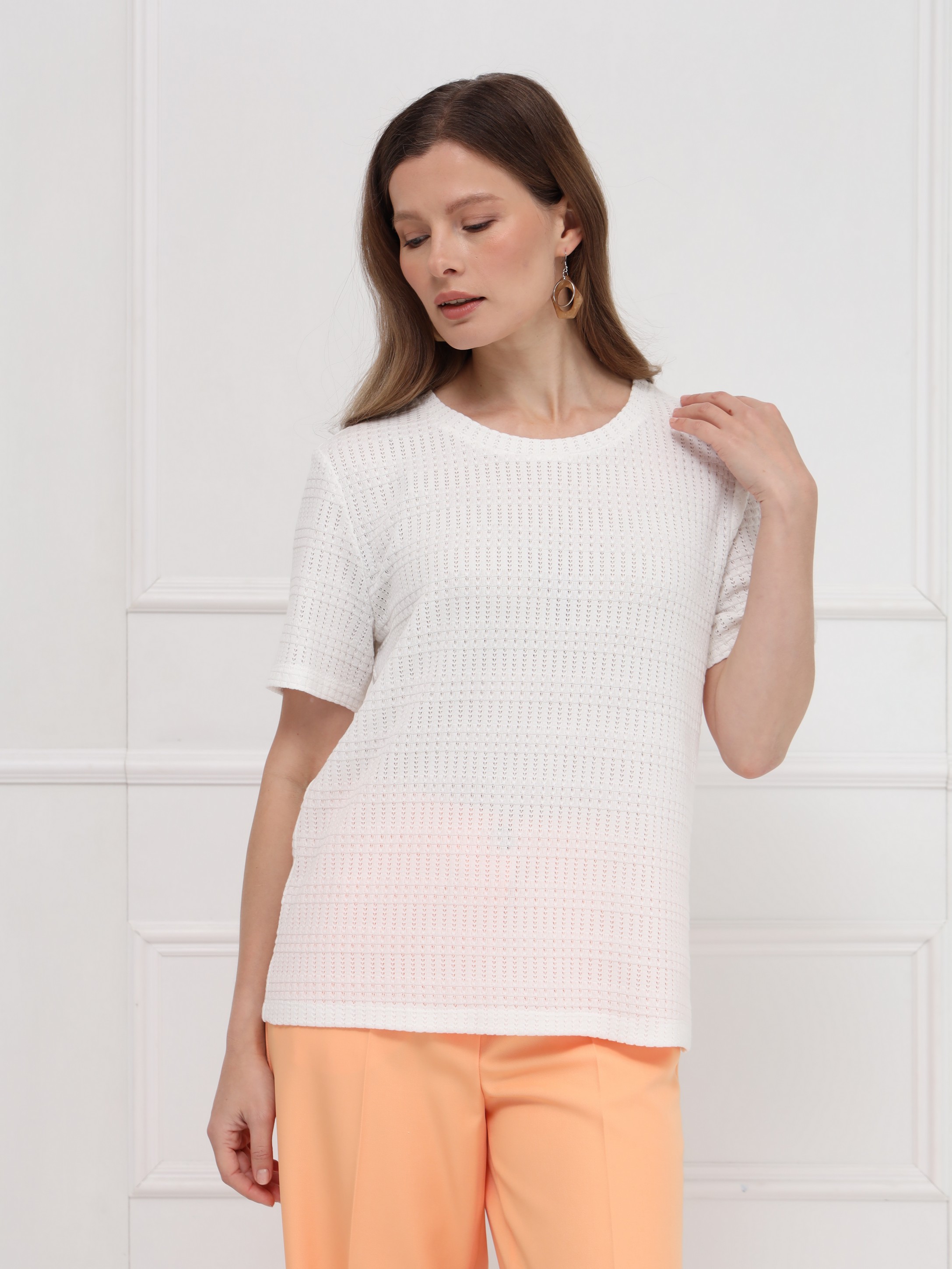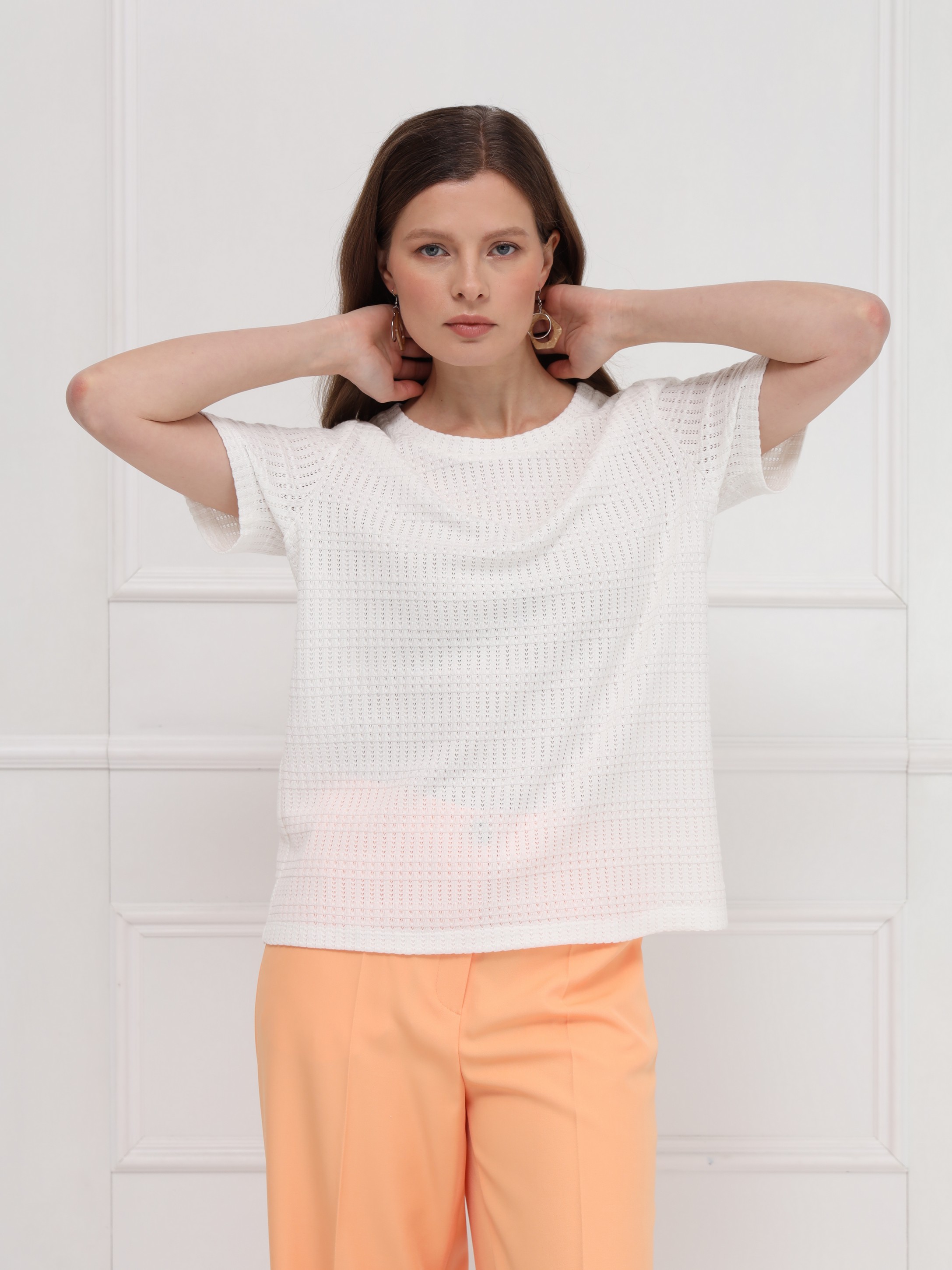 Джемпер выполнен из трикотажа с деликатным ажурным плетением. Прямой крой и овальная горловина создают чистые, мягкие линии, а короткий рукав добавляет модели лёгкости и непринуждённости. Дышащая структура вискозного трикотажа делает джемпер комфортным в носке и легко вписывает его в любые весенние образы.
