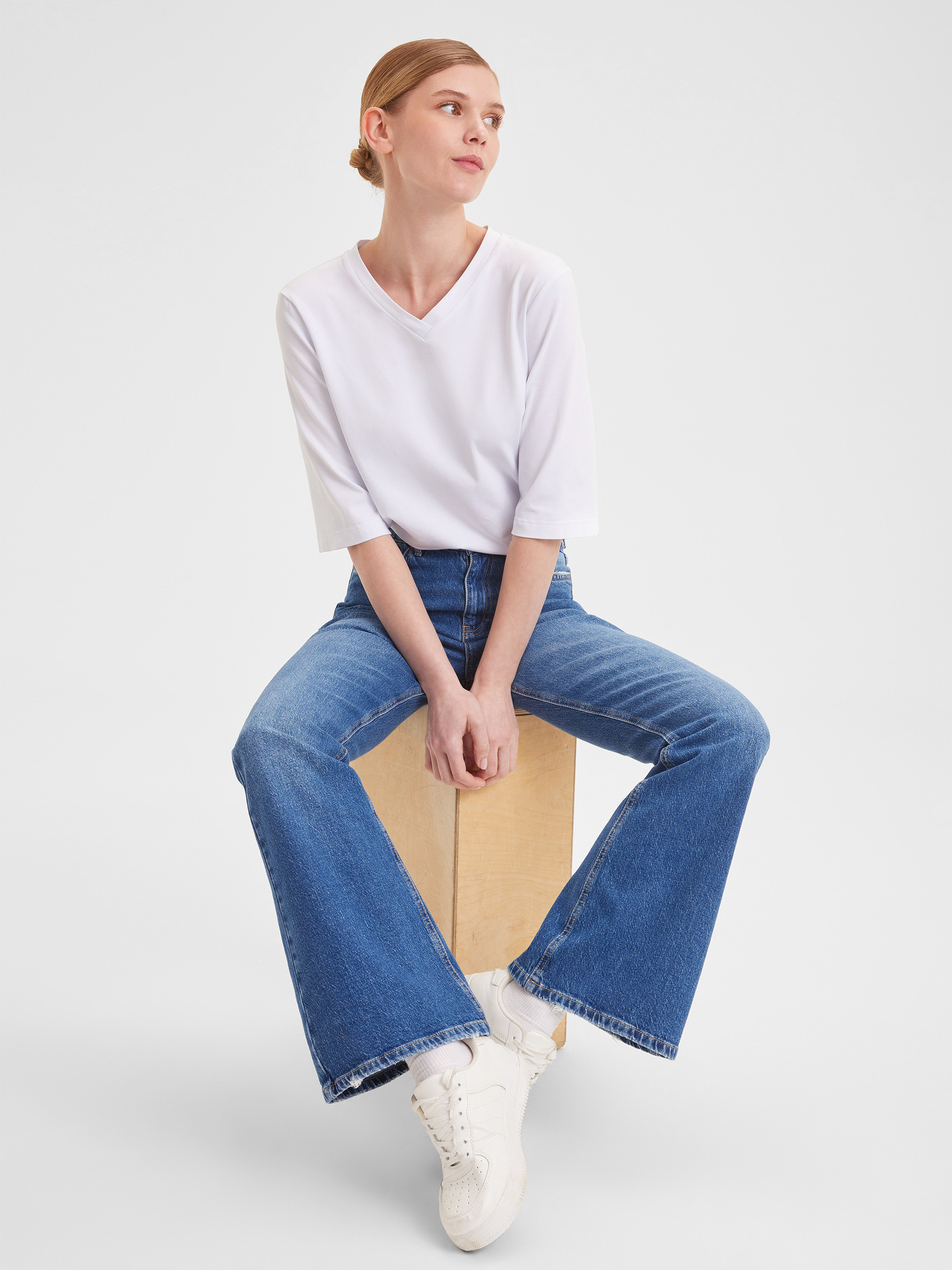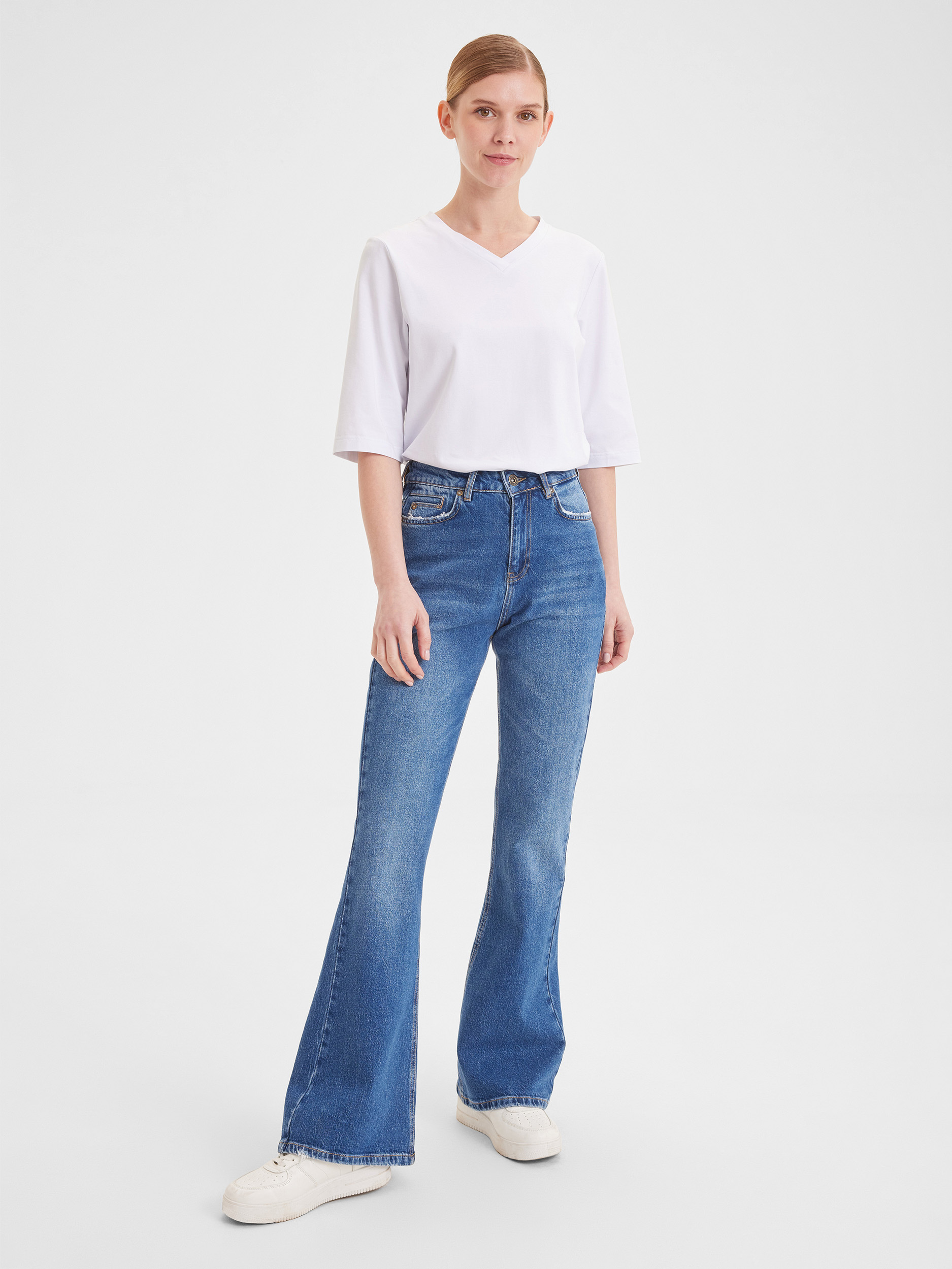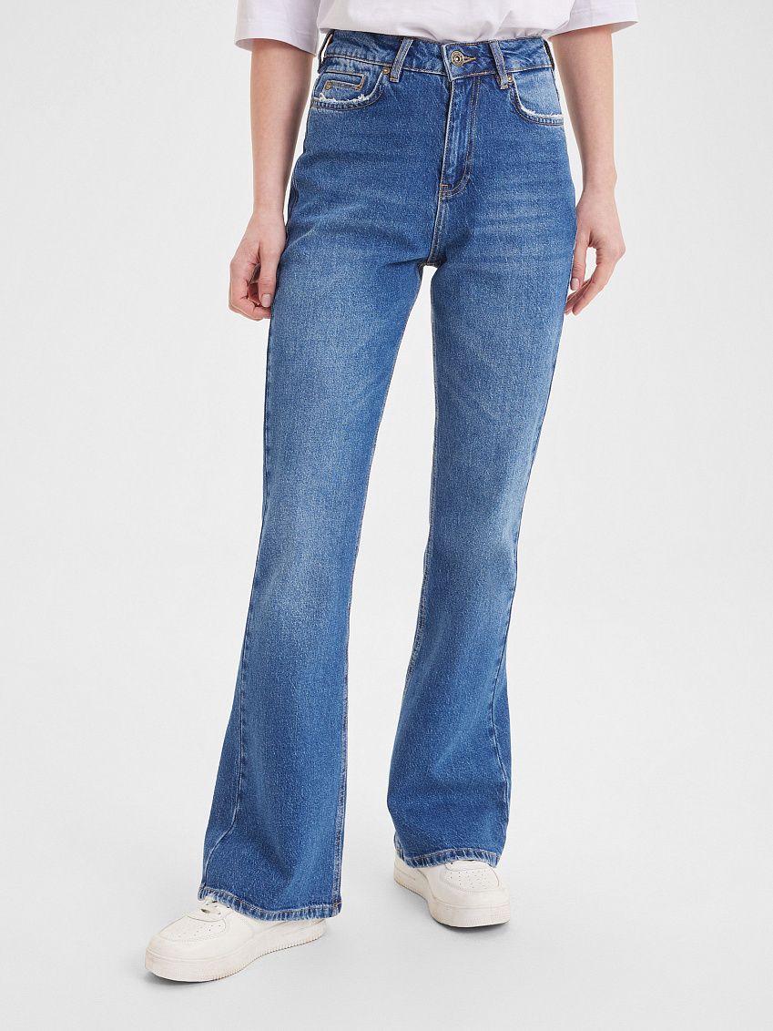 Модель джинсов клеш от колена придаёт образу некоторую игривость и свободу движения. Широкий низ подчеркивает изящество ног и позволяет мгновенно трансформировать любой образ из повседневного в вечерний.В составе хлопок, обладающий дышащими свойствами, и лайкра, добавляющая эластичности, обеспечивая посадку по фигуре. Вы не только будете выглядеть стильно, но и ощущать себя комфортно в течение всего дня.Длина в пол создает эффектный и утончённый образ. Высокая посадка акцентирует внимание на талии, визуально удлиняя ноги. Такие джинсы легко комбинировать с различной обувью: от ботильонов до кед.