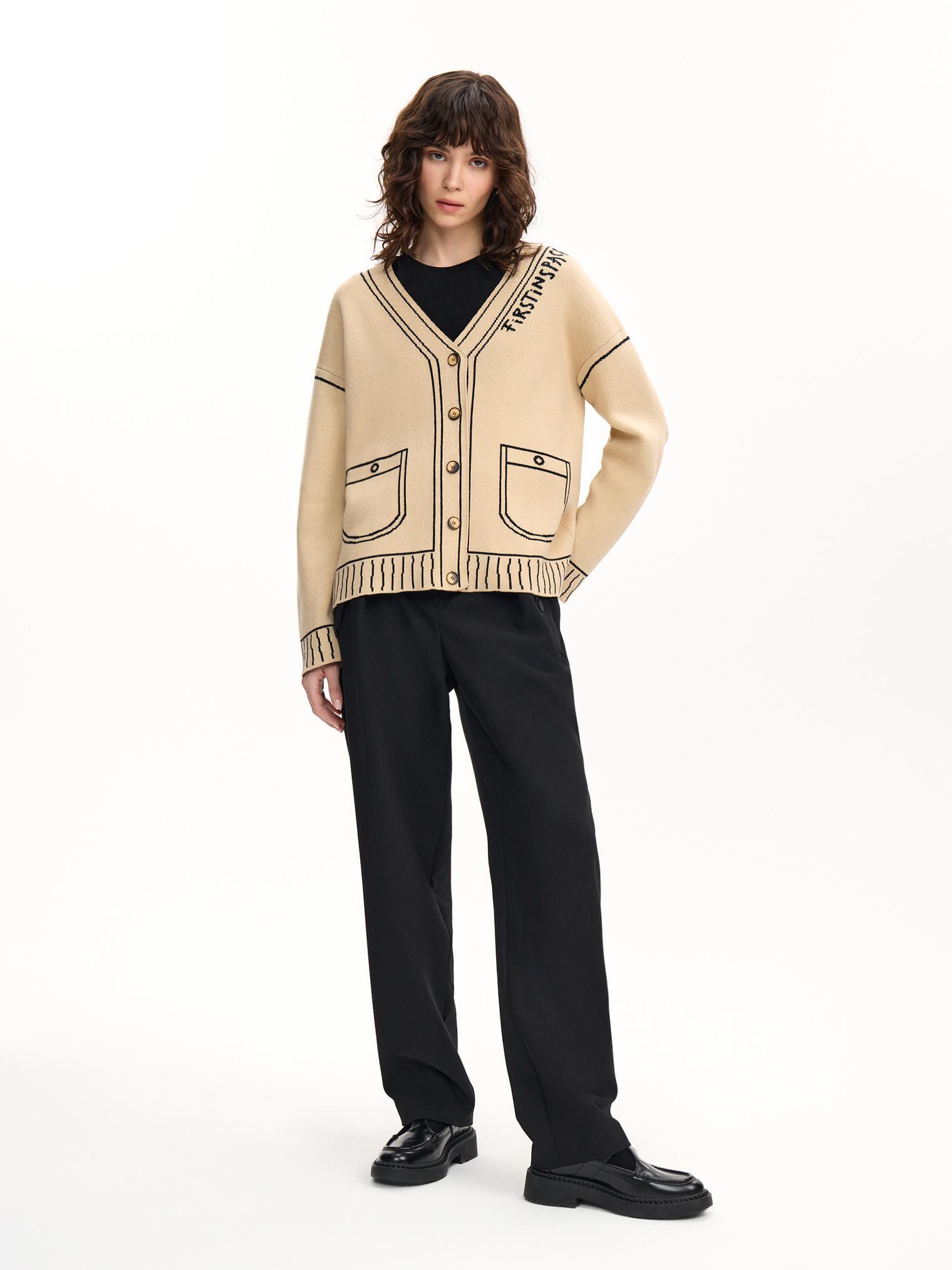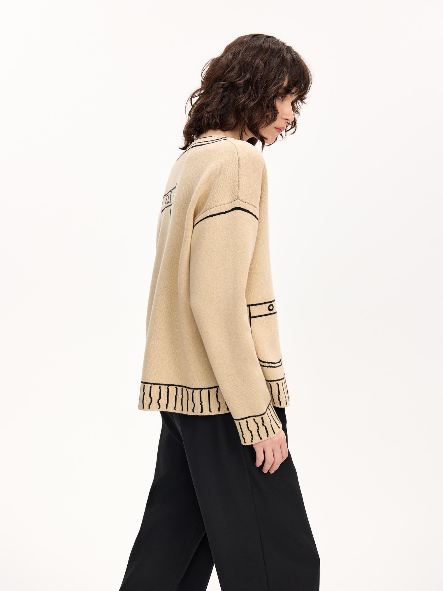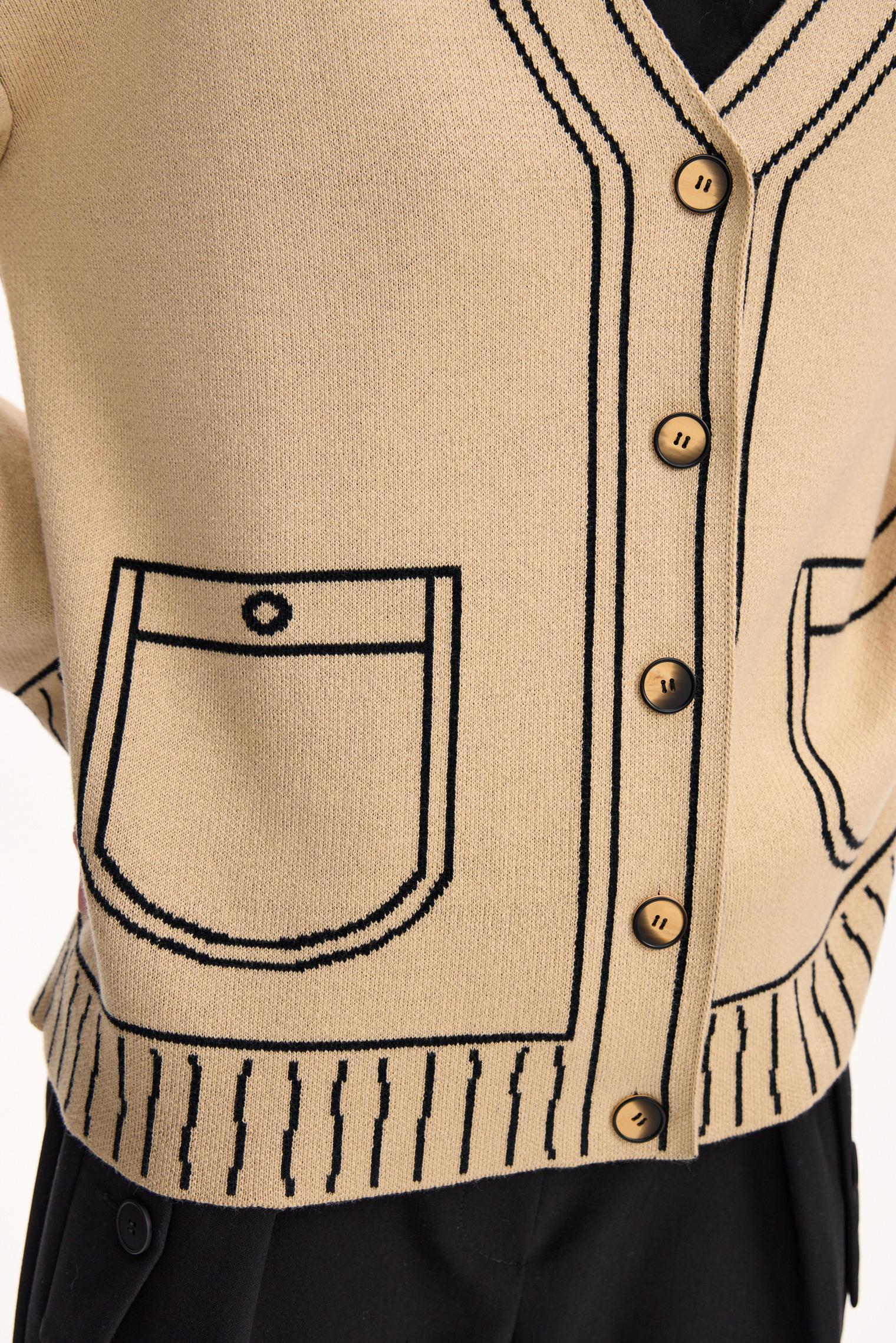 Необычный, отходящий от правил и клише кардиган. Мы решили поэкспериментировать и оформить классический трикотаж контрастной окантовкой, «застежкой» и «карманами» в технике интарсия. Приятный и не слишком огромный оверсайз для уютных дней и вечеров.