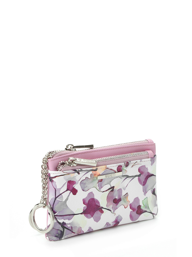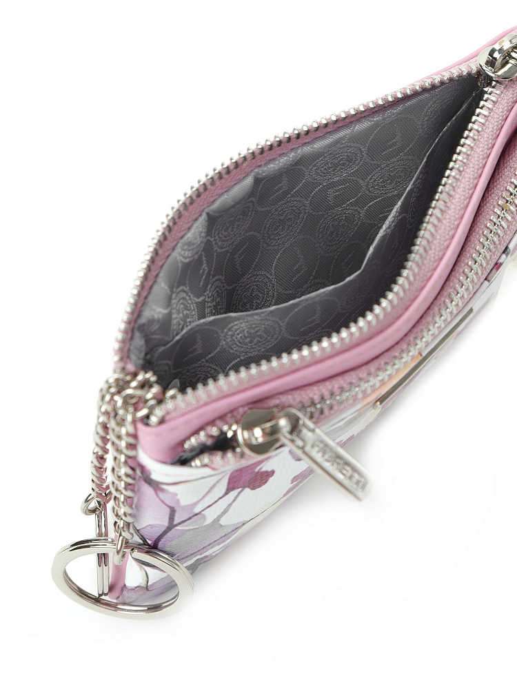 Женская ключница итальянского бренда FABRETTI из натуральной кожи в оригинальном дизайне. Лицевая сторона украшена узором из лилово-розовых акварельных цветов на белом фоне, тыльная сторона нежного розового цвета. Завершает декор небольшой металлический шильд с логотипом.В ключнице легко поместятся не только ключи, но и несколько карточек. Основное отделение застегивается на молнию, внутри два кольца-держателя на цепочке и открытый карман для дисконтных и кредитных карт. Внешний карман - на молнии, вмещает банковские карты и другие необходимые мелочи. Цвет фурнитуры - серебро.