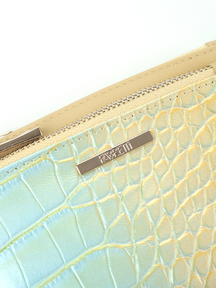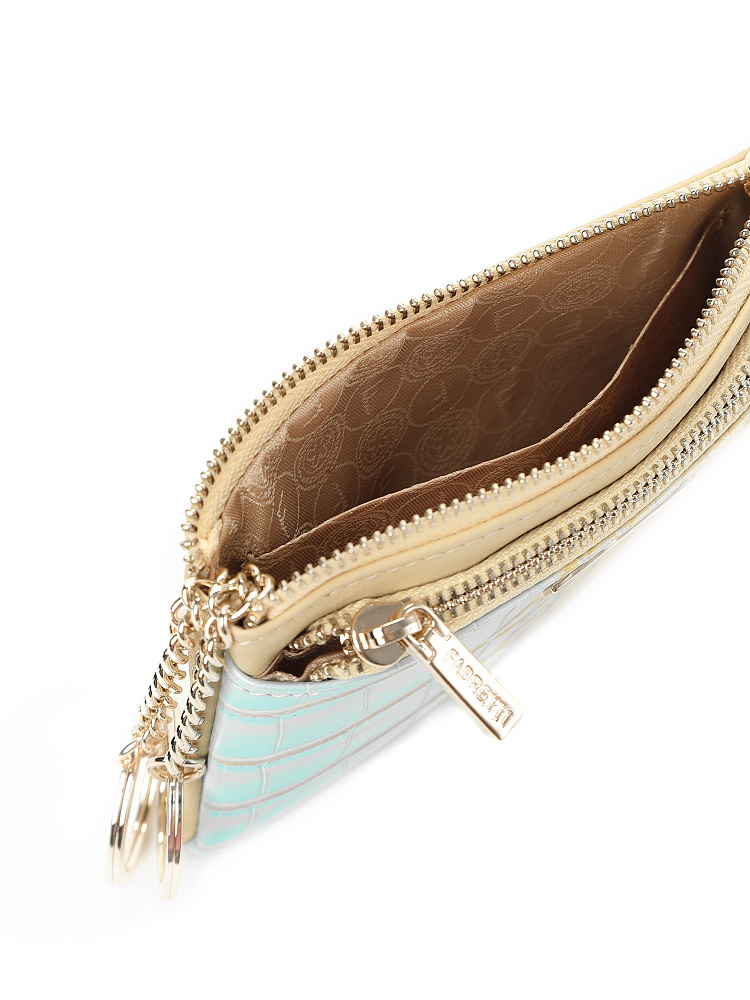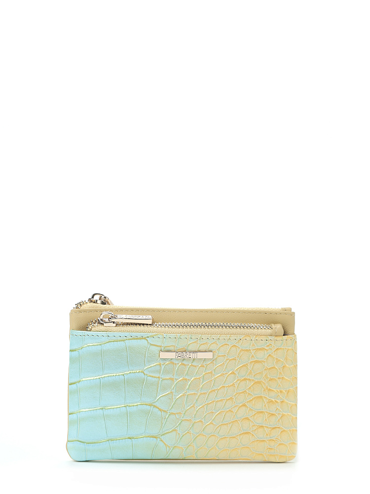 Невероятно стильная женская ключница итальянского бренда FABRETTI из натуральной кожи светло-желтого цвета «акация». Лицевая сторона украшена оригинальным тиснением под шкуру рептилии и дополнена желто-голубым градиентом. Завершает декор небольшой металлический шильд с логотипом.В ключнице легко поместятся не только ключи, но и несколько карточек. Основное отделение застегивается на молнию, внутри два кольца-держателя на цепочке и открытый карман для дисконтных и кредитных карт. Внешний карман - на молнии, вмещает банковские карты и другие необходимые мелочи. Цвет фурнитуры - золото.