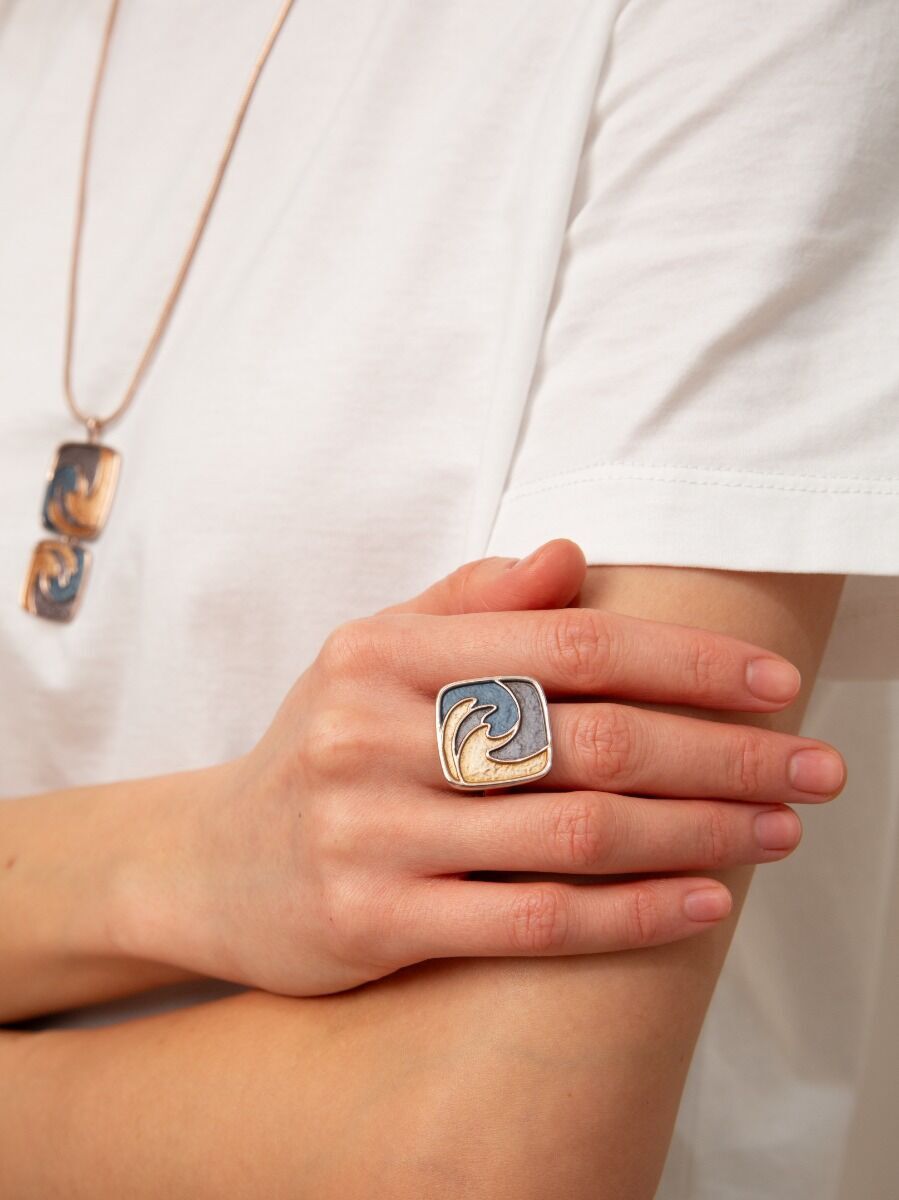 Безразмерное кольцо с абстрактным узором. Оригинальное кольцо квадратной формы и с утонченным абстрактным узором – стильный аксессуар для тех, кто ценит современные украшения. Теплое покрытие под кофейное золото в сочетании с эмалевыми вставками создает гармоничный и выразительный дизайн. Безразмерное эластичное основание делает кольцо удобным и практичным, позволяя адаптироваться под любой размер пальца. Это украшение станет эффектным акцентом в любом образе, придавая ему яркости и оригинальность.