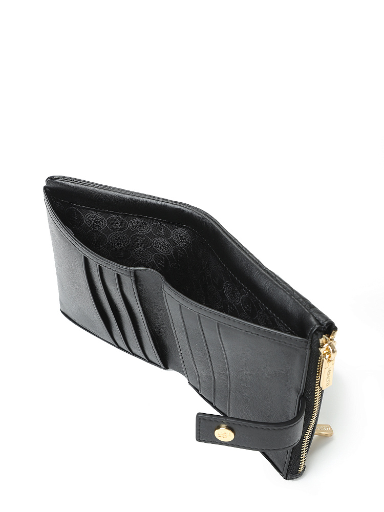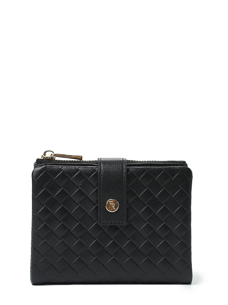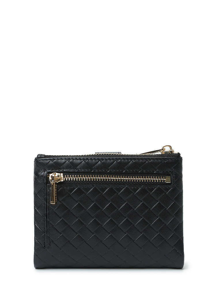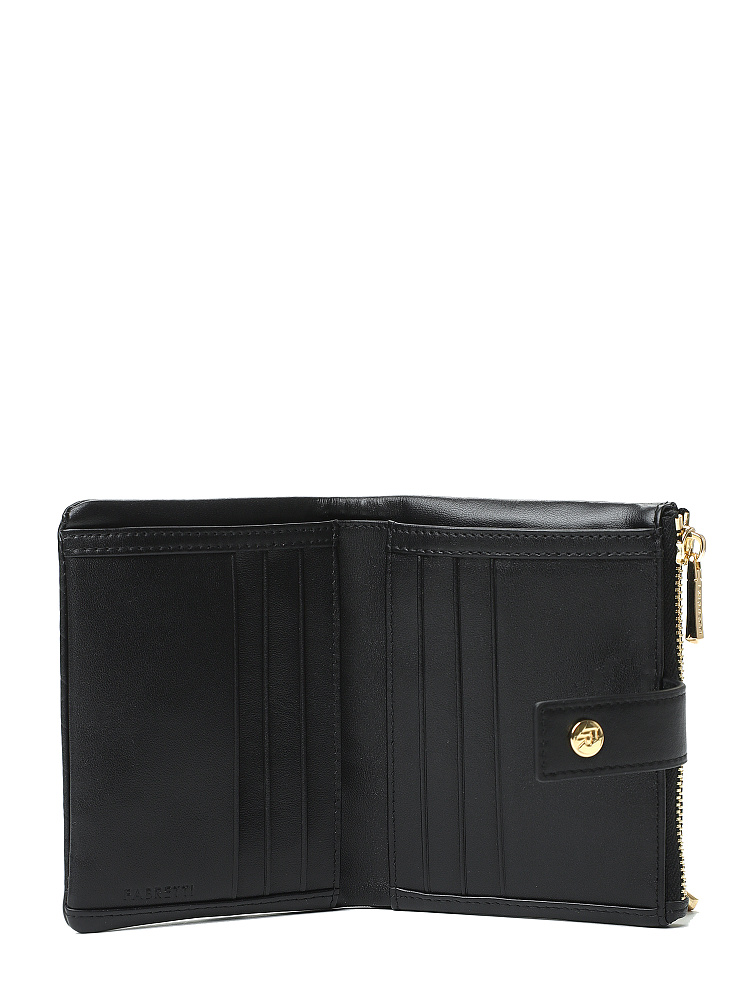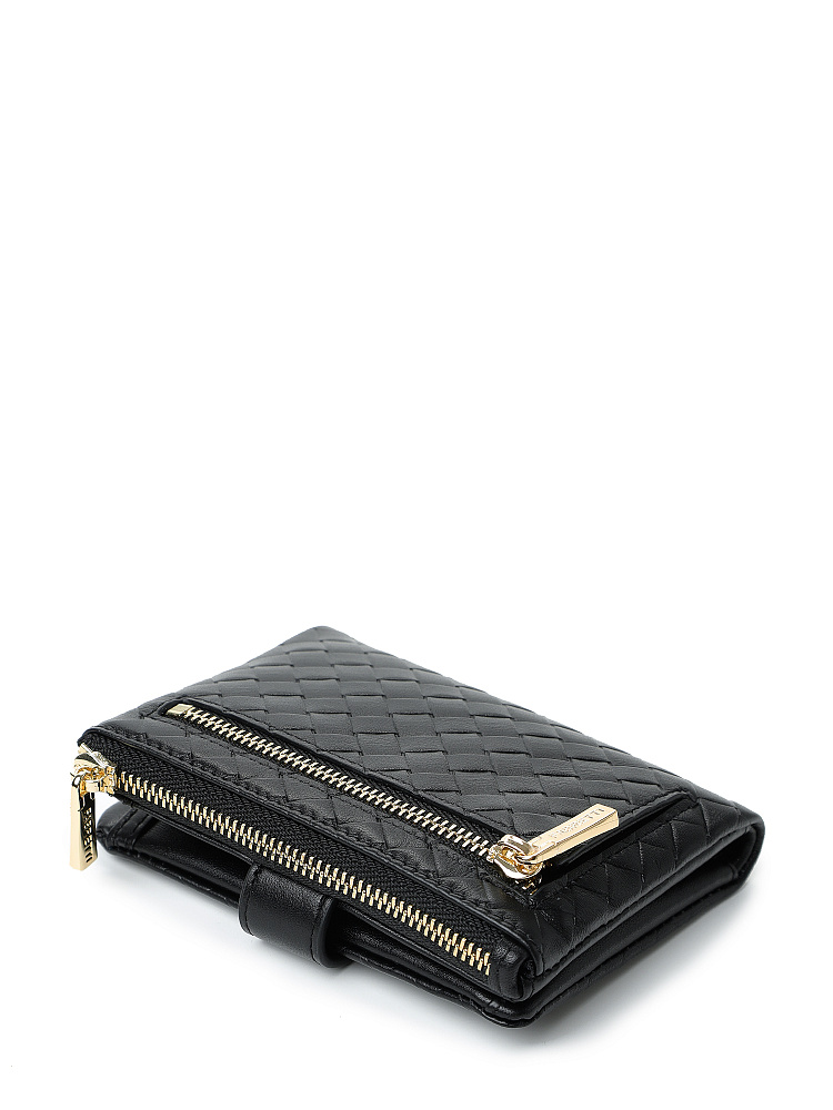 Складной женский кошелек итальянского бренда FABRETTI из нежной кожи наппа в черном цвете. Поверхность украшена оригинальным глубоким тиснением, имитирующим плетеный узор.Основное отделение закрывается на хлястик с кнопкой. Внутри одно отделение для купюр, шесть слотов для пластиковых карт и два открытых кармана. На тыльной стороне расположены два кармана на молнии для мелочей. Цвет фурнитуры - золото.