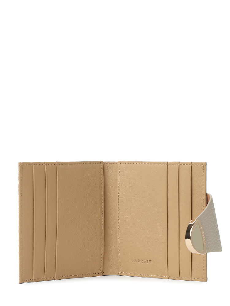 Небольшой складной кошелек итальянского бренда FABRETTI – статусный аксессуар с необычным дизайном и декором.Он выполнен из натуральной зернистой кожи в нежном светло-бежевом оттенке. Закрывается на хлястик с магнитным замком, украшенный стильной металлической пряжкой со вставкой эмали в тон коже.Внутри одно отделение для купюр, два открытых кармана, шесть слотов для карт. НА тыльной стороне карман на молнии для монет и мелочей.Этот стильный аксессуар станет идеальным подарком близким.