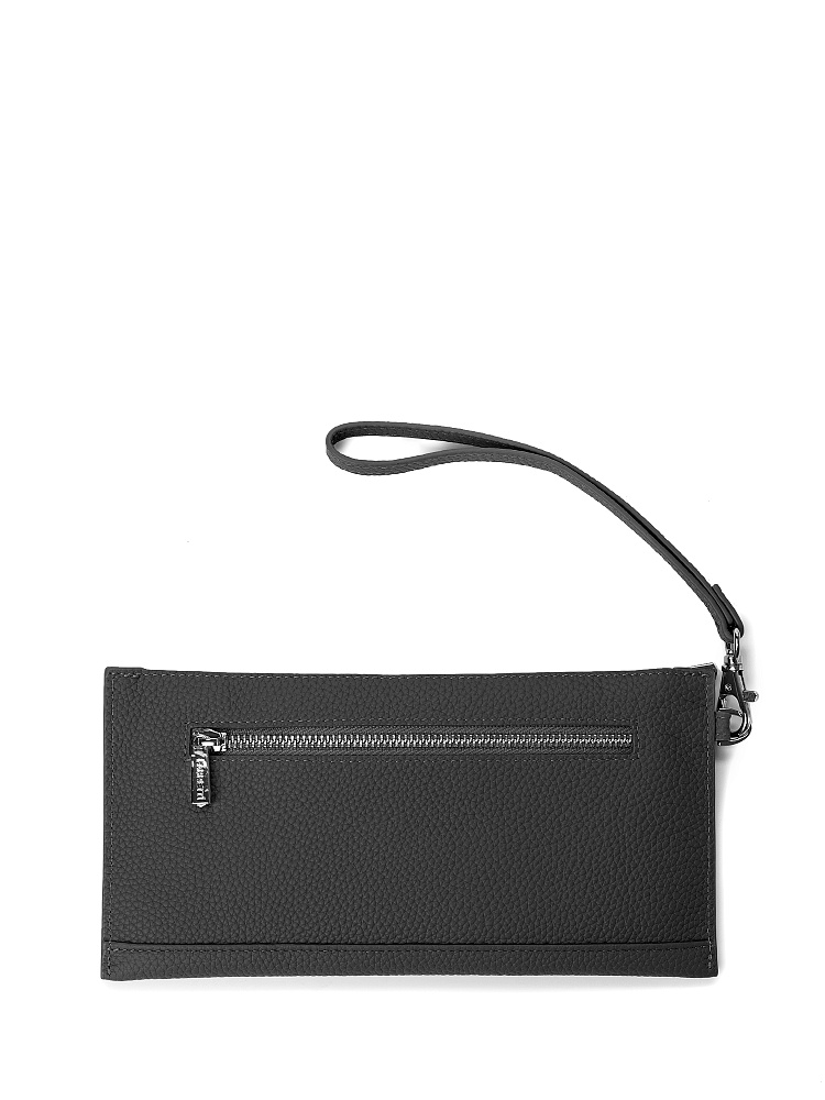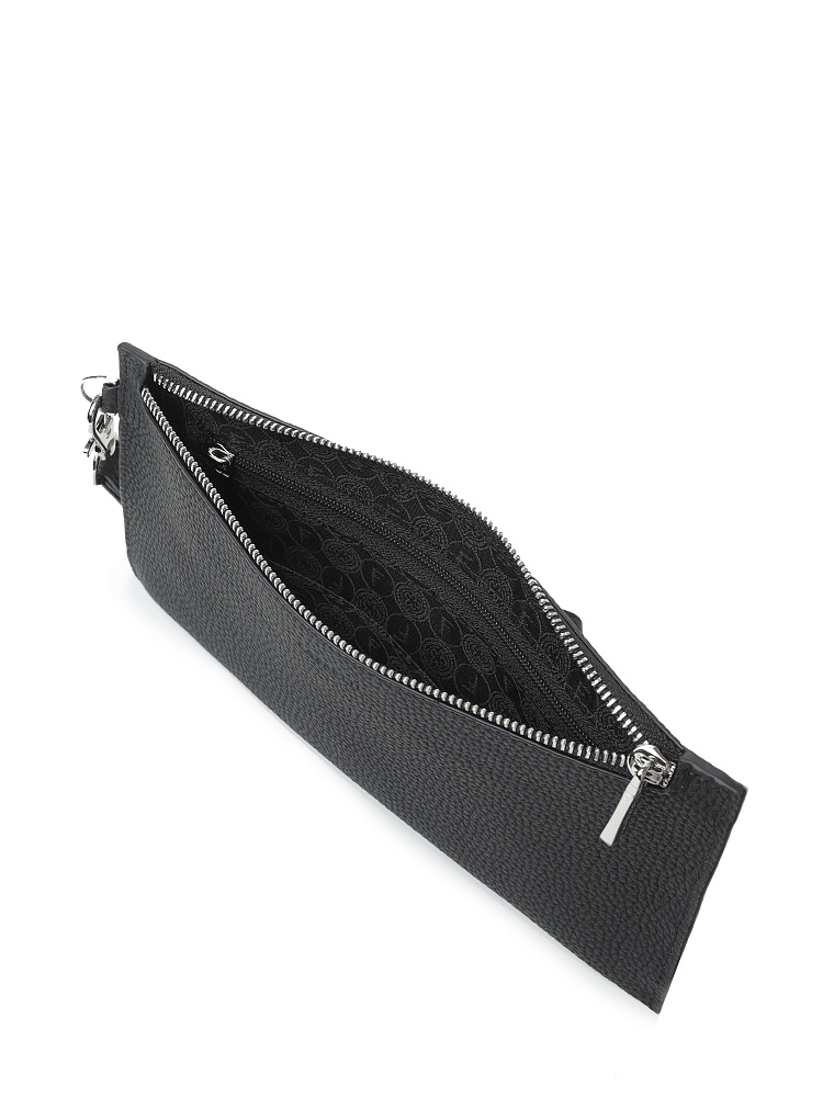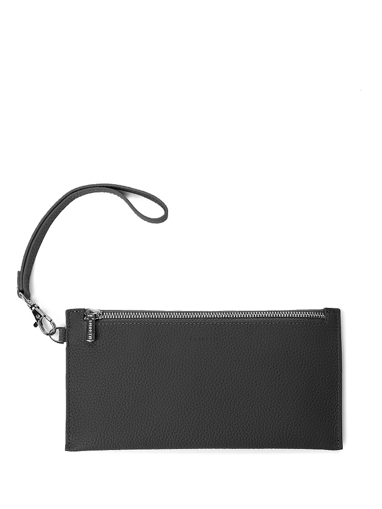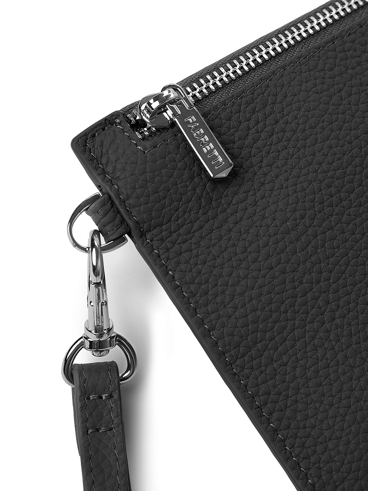 Удобный женский кошелек на полную купюру от итальянского бренда FABRETTI. Он выполнен из натуральной кожи с крупнозернистой фактурой в классическом черном цвете.У кошелька одно основное отделение на молнии, внутри три слота для карт и один карман на молнии. На тыльной стороне расположен карман быстрого доступа – для монет и различных мелочей – на металлической молнии.Эта компактная модель подходит для ношения не только в сумке, но и в руках – на боку есть съемный ремень-петля на карабине.Цвет фурнитуры – серебро.