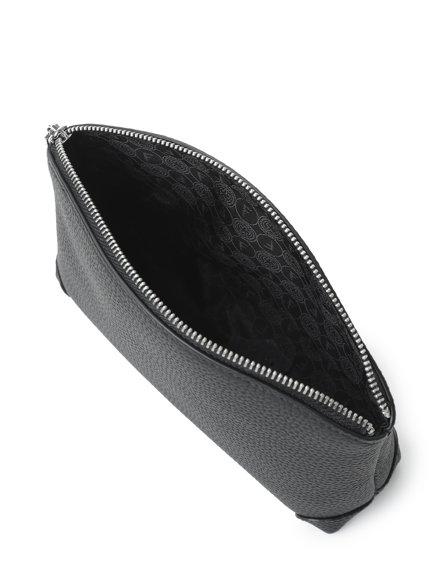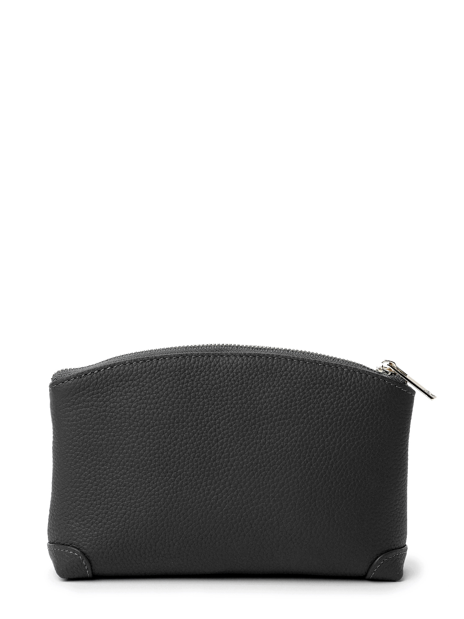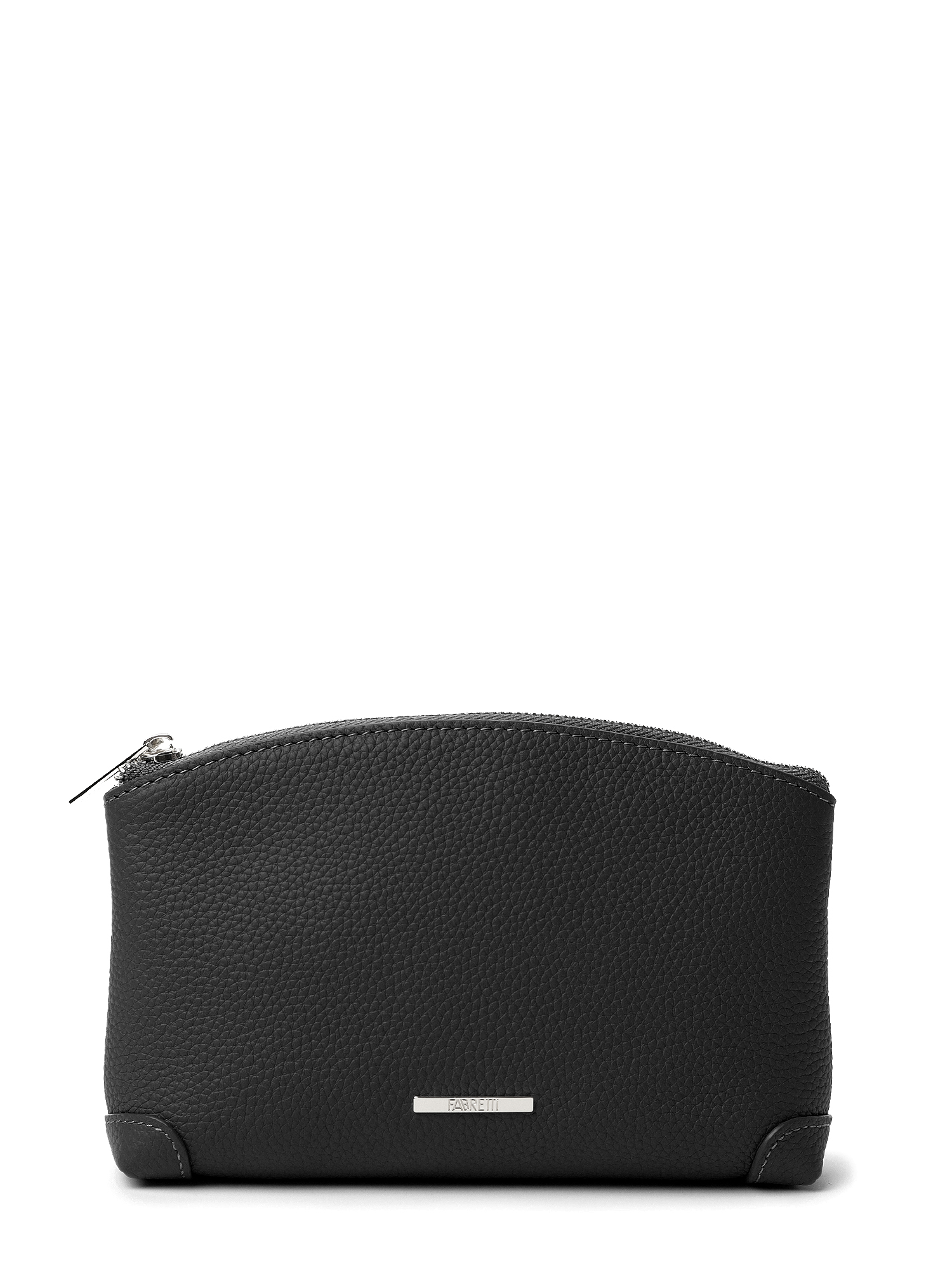 Женская косметичка итальянского бренда FABRETTI из натуральной кожи с крупнозернистой фактурой в черном цвете.Внутри модель дополнена подкладкой в стиле Логомании. Основное отделение одно, застегивается на металлическую молнию. По бокам модель дополнена накладными уголками, которые увеличивают износостойкость и позволяет лучше держать форму.Кожаная косметичка – простой и удобный аксессуар, который хорошо дополняет основную сумку или может послужить небольшой сумочкой для мероприятий.Цвет фурнитуры – серебро.