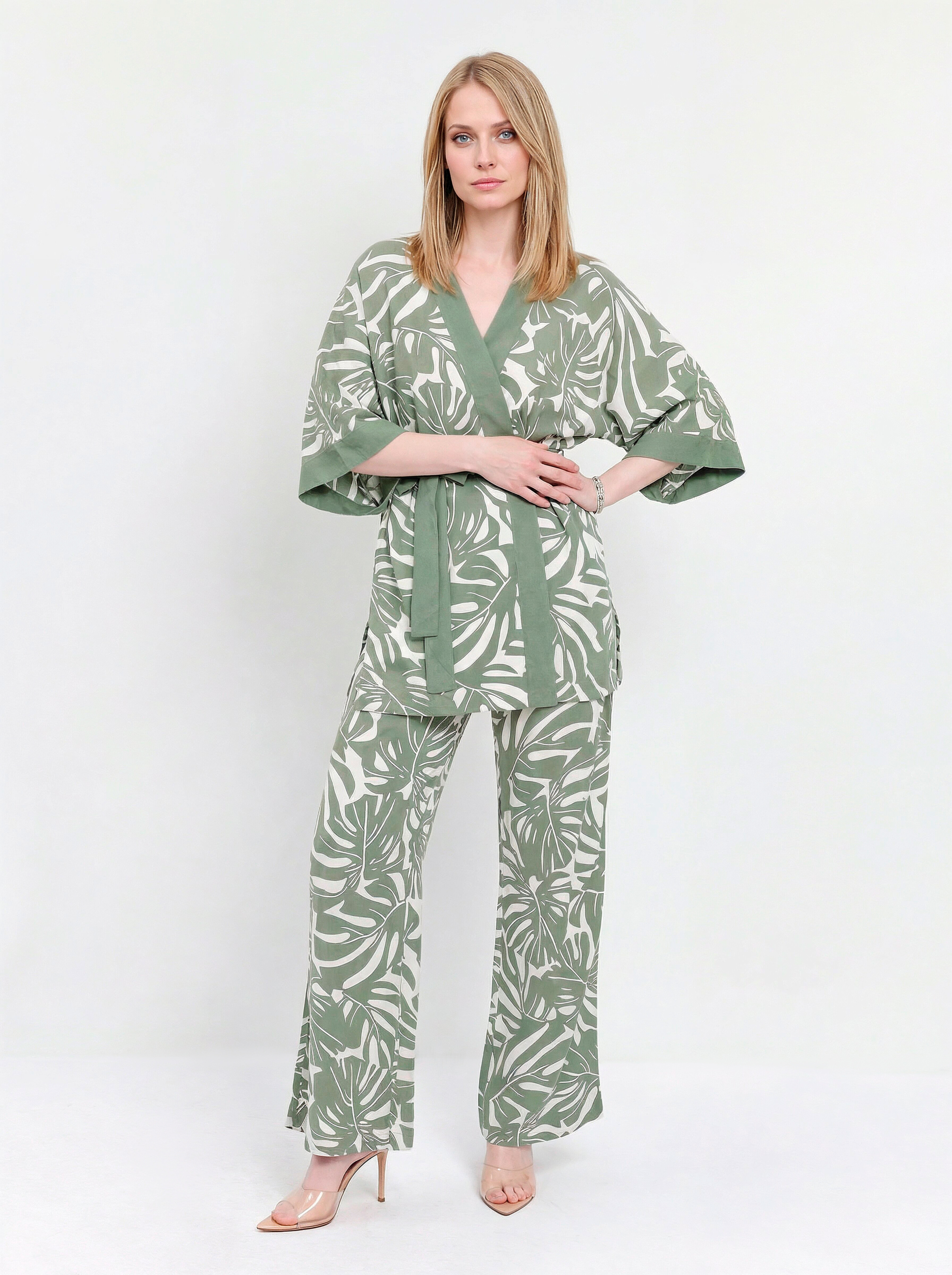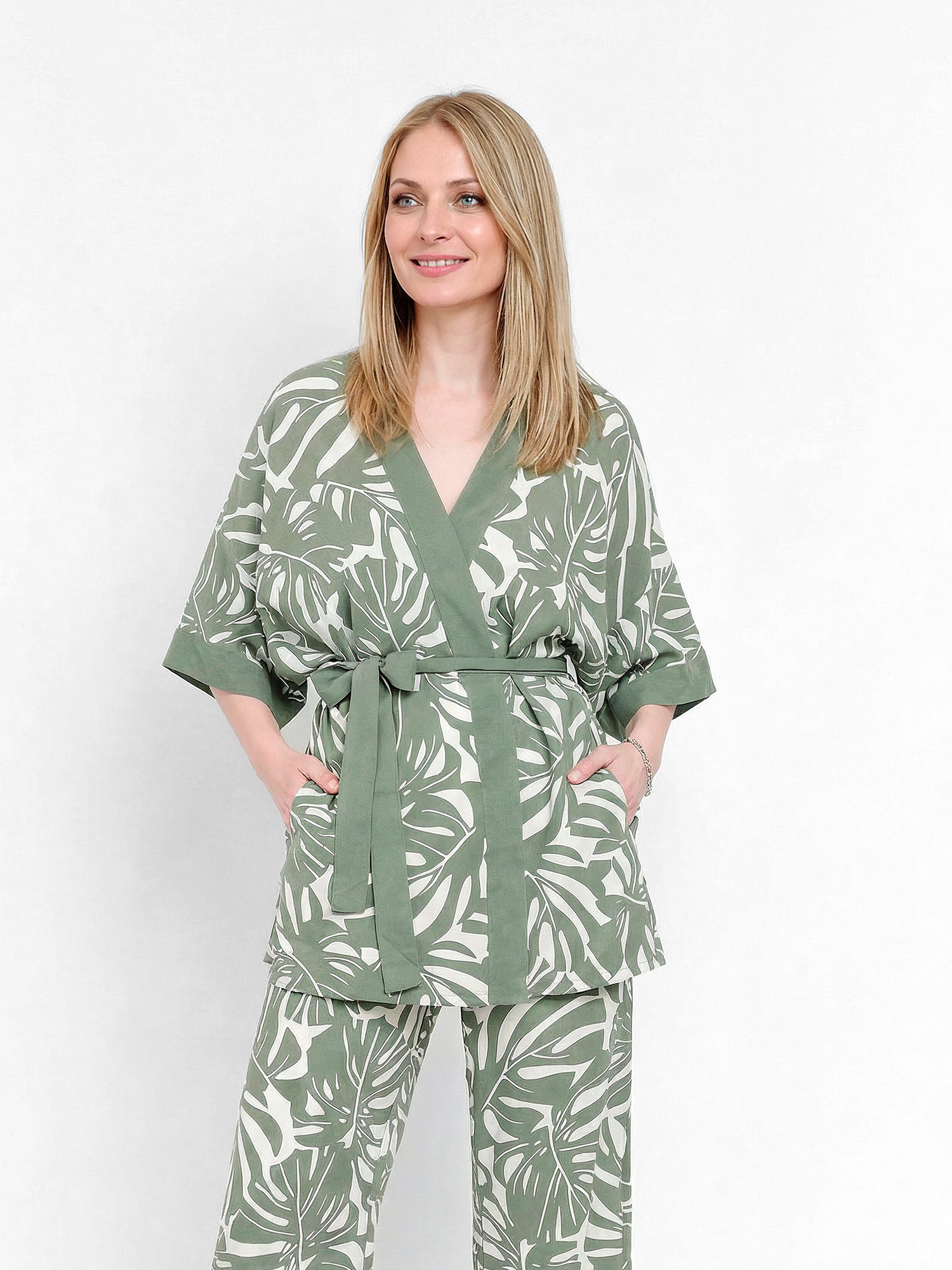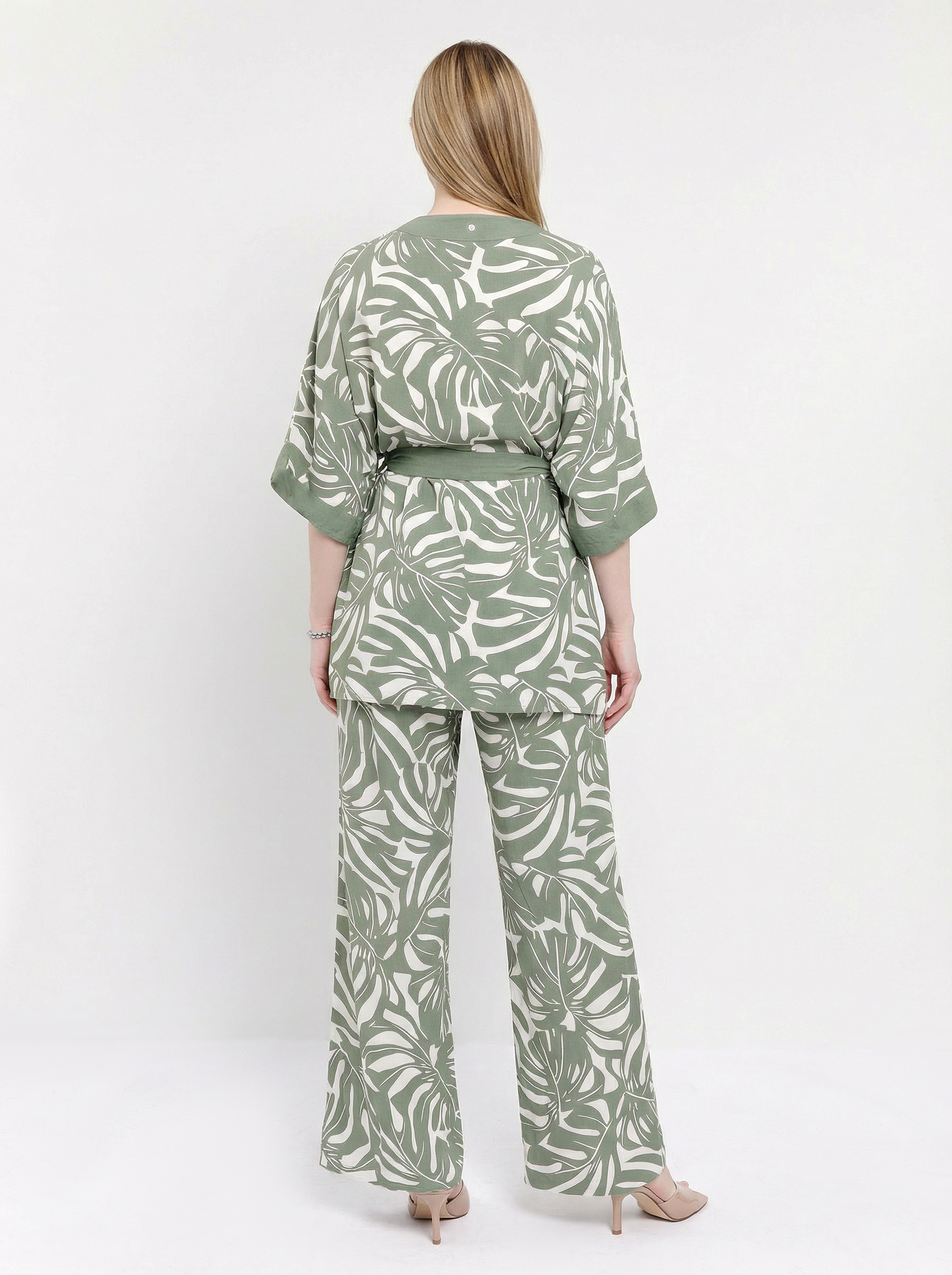 Великолепный летний женский костюм итальянского бренда FABRETTI создает расслабленный, непринужденный образ для самого жаркого сезона. Костюм состоит из брюк и широкой туники, выполненных из легкой дышащей вискозы и украшенных узором в виде листьев тропической монстеры.Крой брюк прямой и свободный, в притачном однотонном поясе резинка и кулиска. По бокам втачные карманы.У туники широкий свободный крой, вдохновленный японской блузой «хаори», короткие рукава «летучая мышь», однотонная отделка рукавов, лицевой стороны и съемный пояс. По бокам сделаны высокие разрезы.