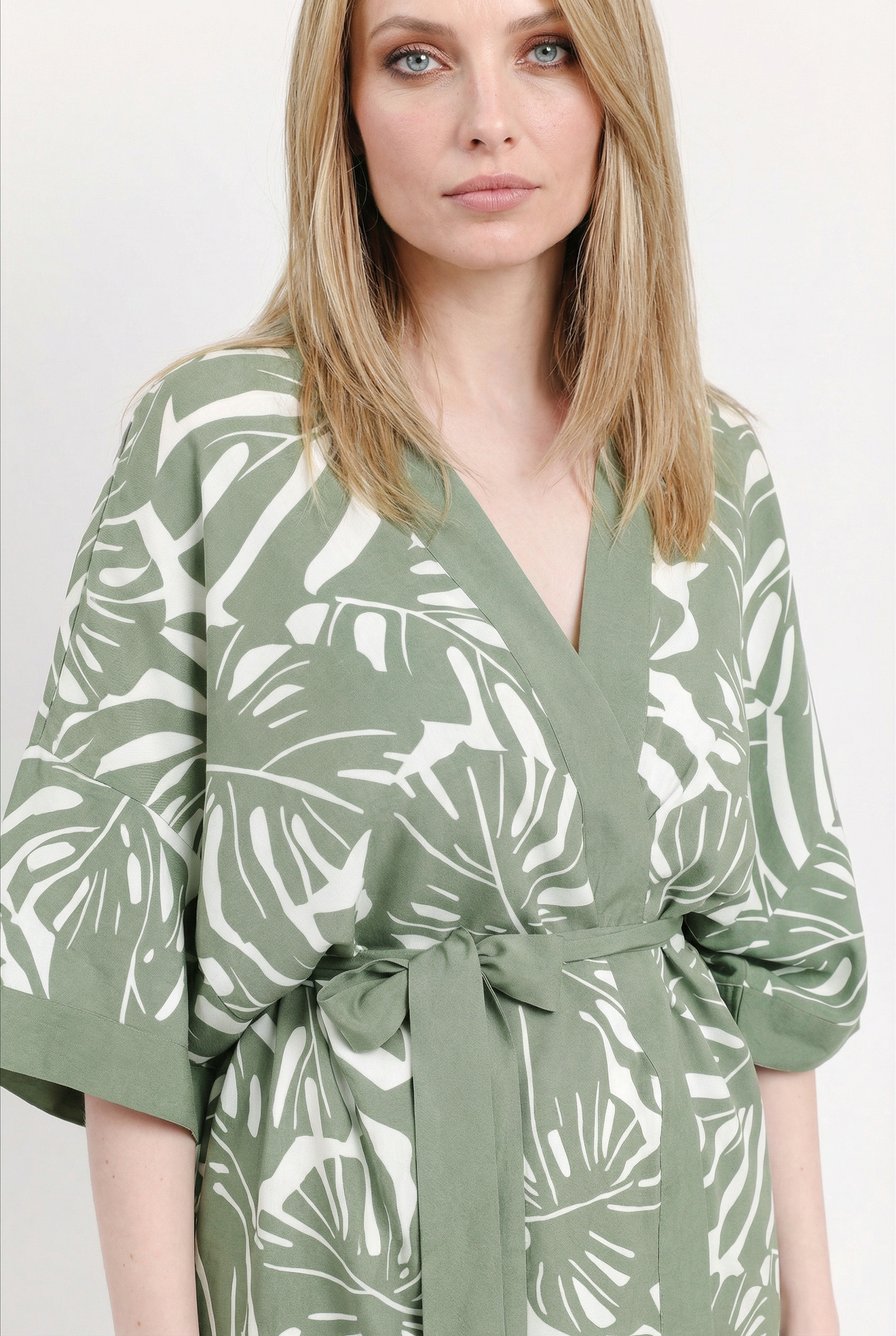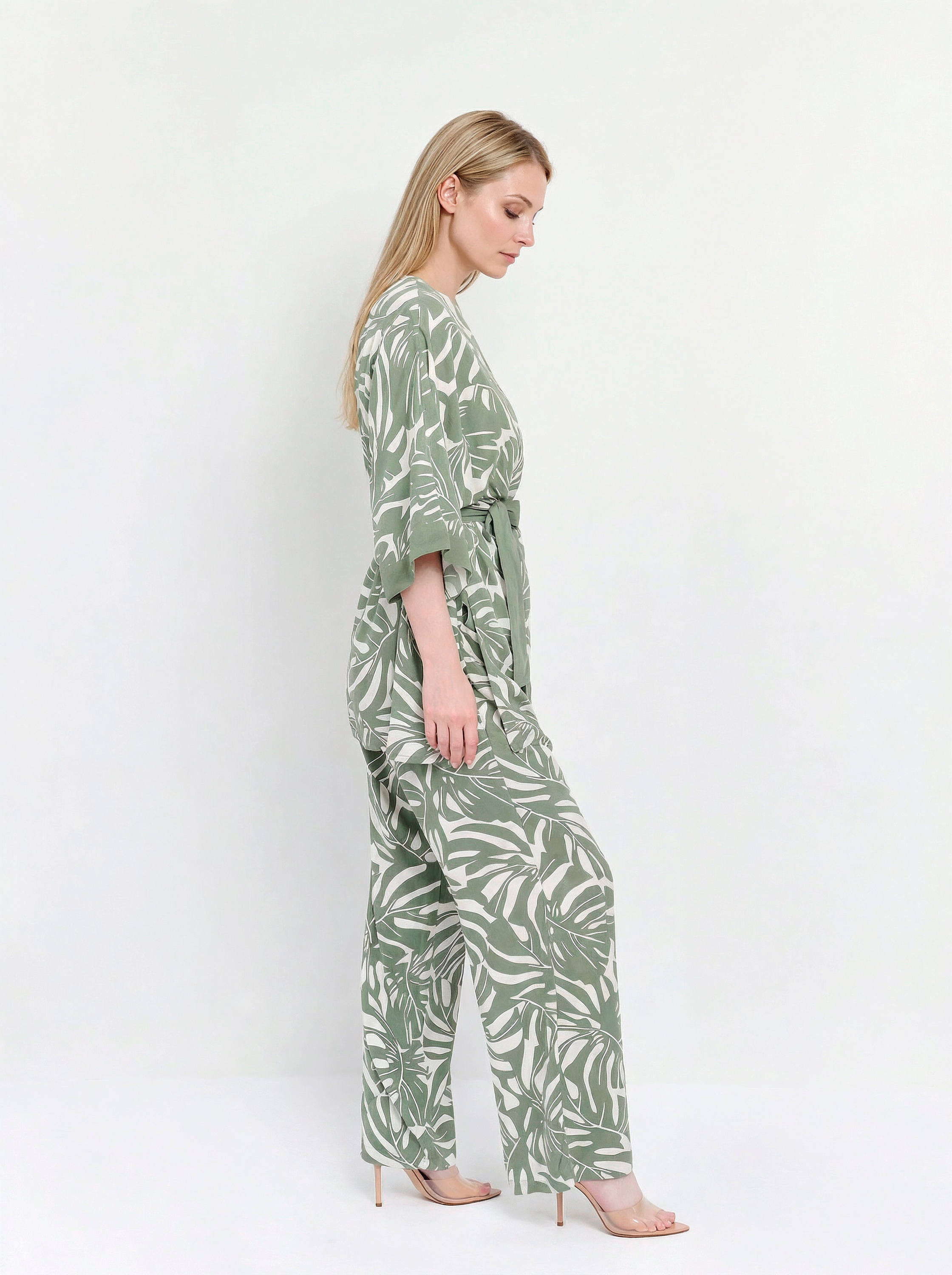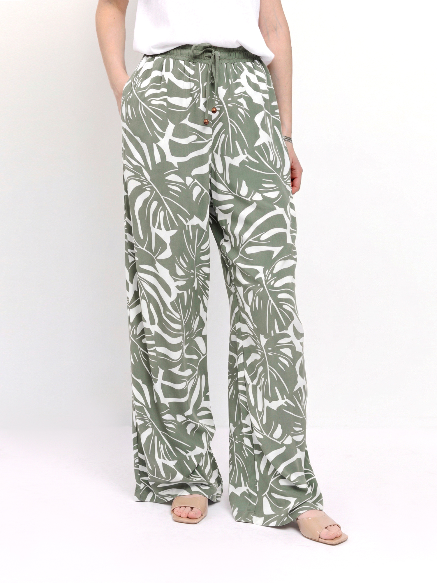 Великолепный летний женский костюм итальянского бренда FABRETTI создает расслабленный, непринужденный образ для самого жаркого сезона. Костюм состоит из брюк и широкой туники, выполненных из легкой дышащей вискозы и украшенных узором в виде листьев тропической монстеры.Крой брюк прямой и свободный, в притачном однотонном поясе резинка и кулиска. По бокам втачные карманы.У туники широкий свободный крой, вдохновленный японской блузой «хаори», короткие рукава «летучая мышь», однотонная отделка рукавов, лицевой стороны и съемный пояс. По бокам сделаны высокие разрезы.
