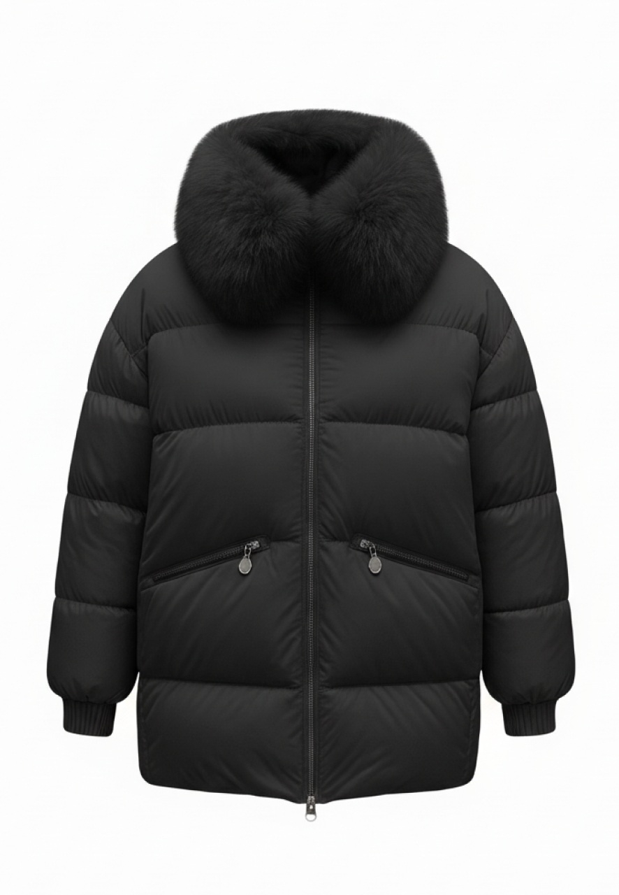 Куртка пуховая зимняя. Длина по спинке 75 см в 46 размере. На капюшоне отделка в виде опушки из натурального меха песца, окрашенного в тон основной ткани. Встречная молния, фурнитура брендированная.