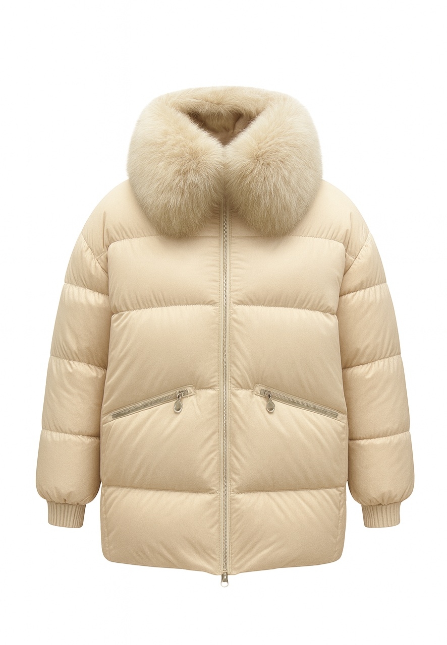 Куртка пуховая зимняя. Длина по спинке 75 см в 46 размере. На капюшоне отделка в виде опушки из натурального меха песца, окрашенного в тон основной ткани. Встречная молния, фурнитура брендированная.Карманы на молнии. Интересная стежка.