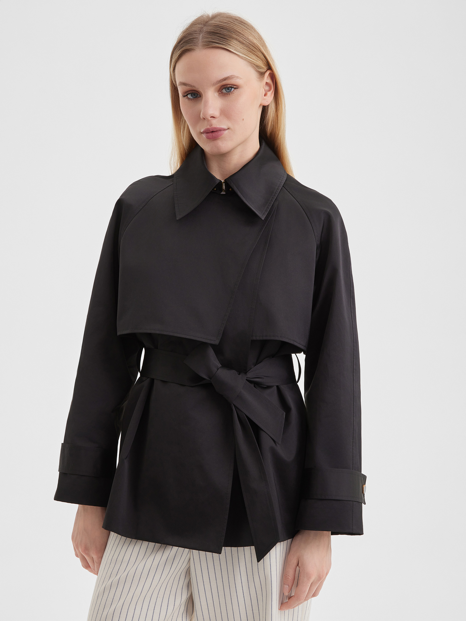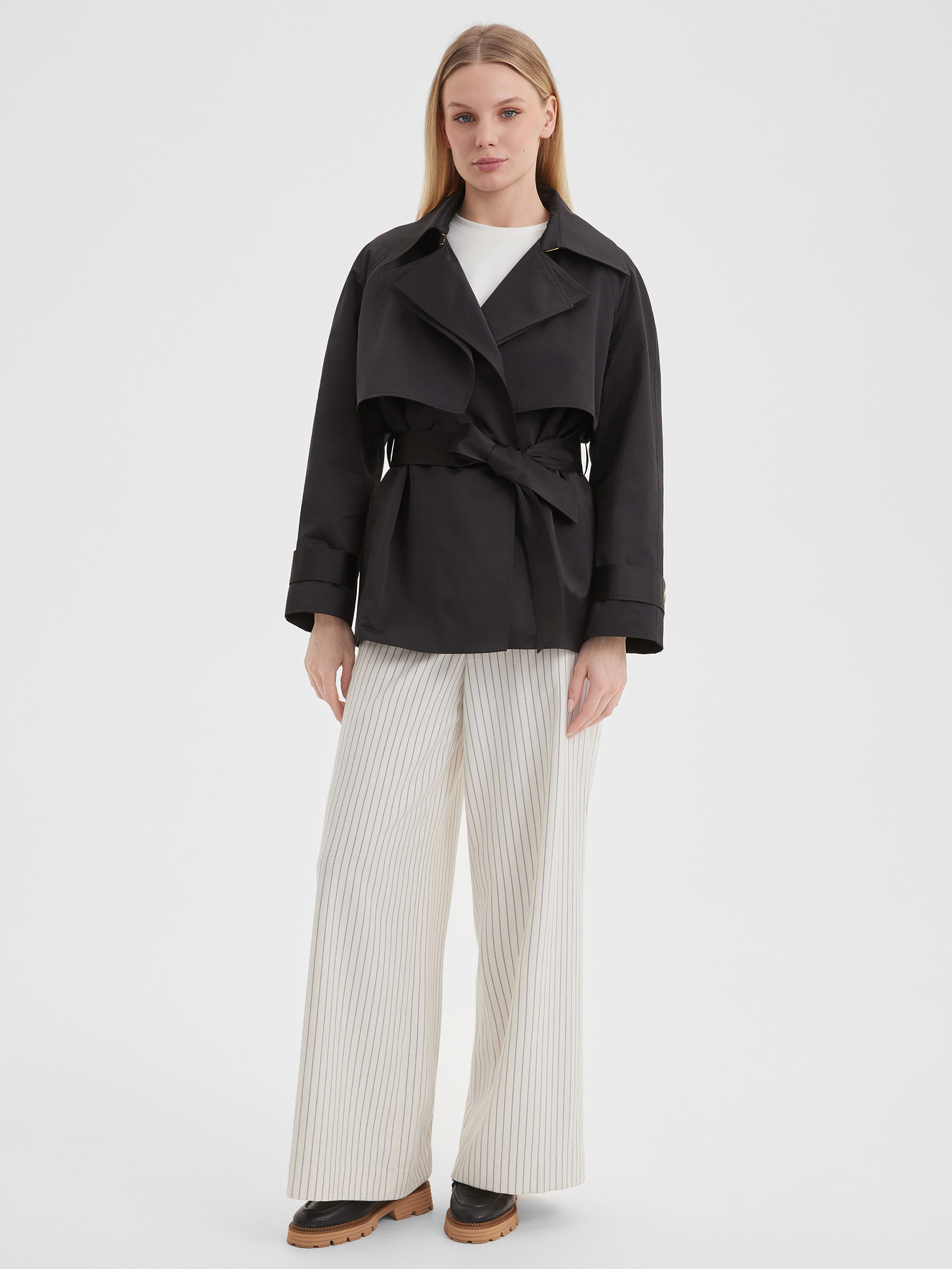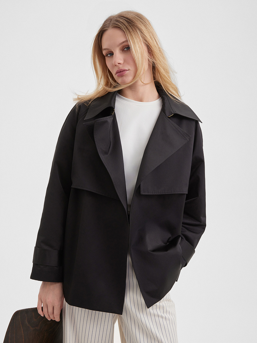 Элегантный укороченный плащ черного цвета станет идеальным дополнением к вашему гардеробу. Его свободный крой и трансформируемый воротник обеспечат комфорт в любых условиях. Элегантный пояс на талии подчеркивает фигуру, делая акцент на женственности силуэта. Укороченный плащ будет отлично смотреться как с брюками, так и с юбками, создавая стильные и универсальные образы.