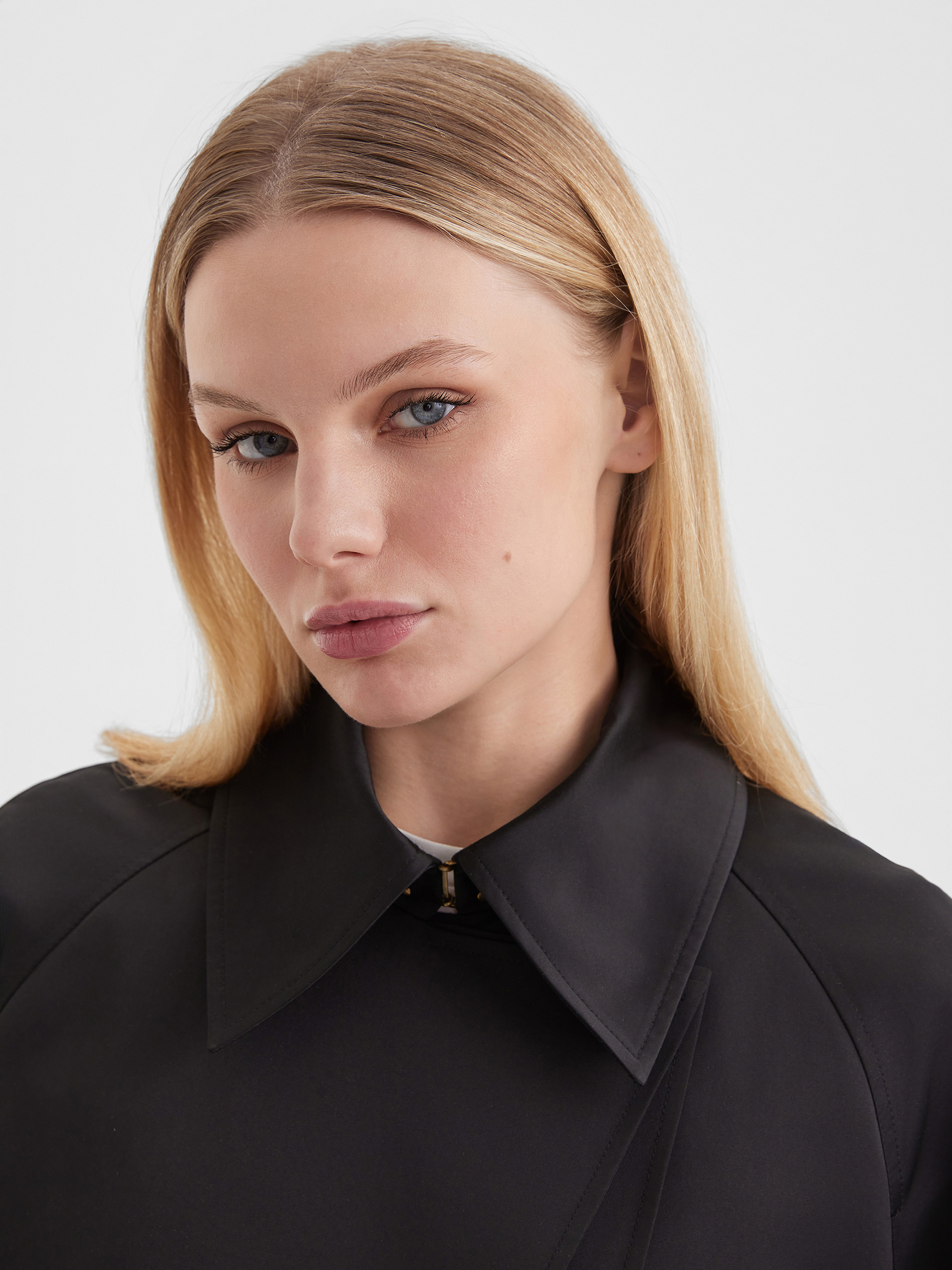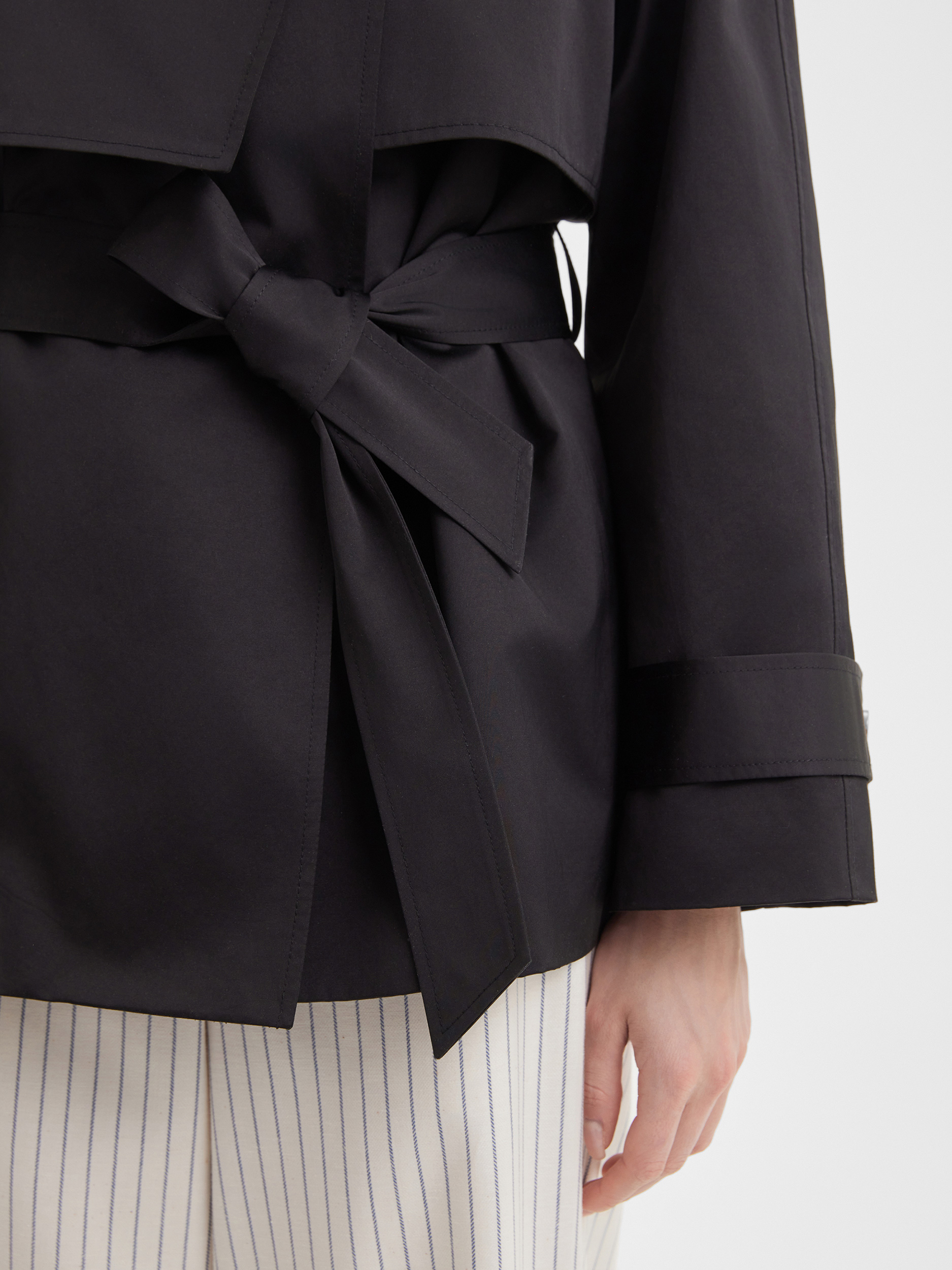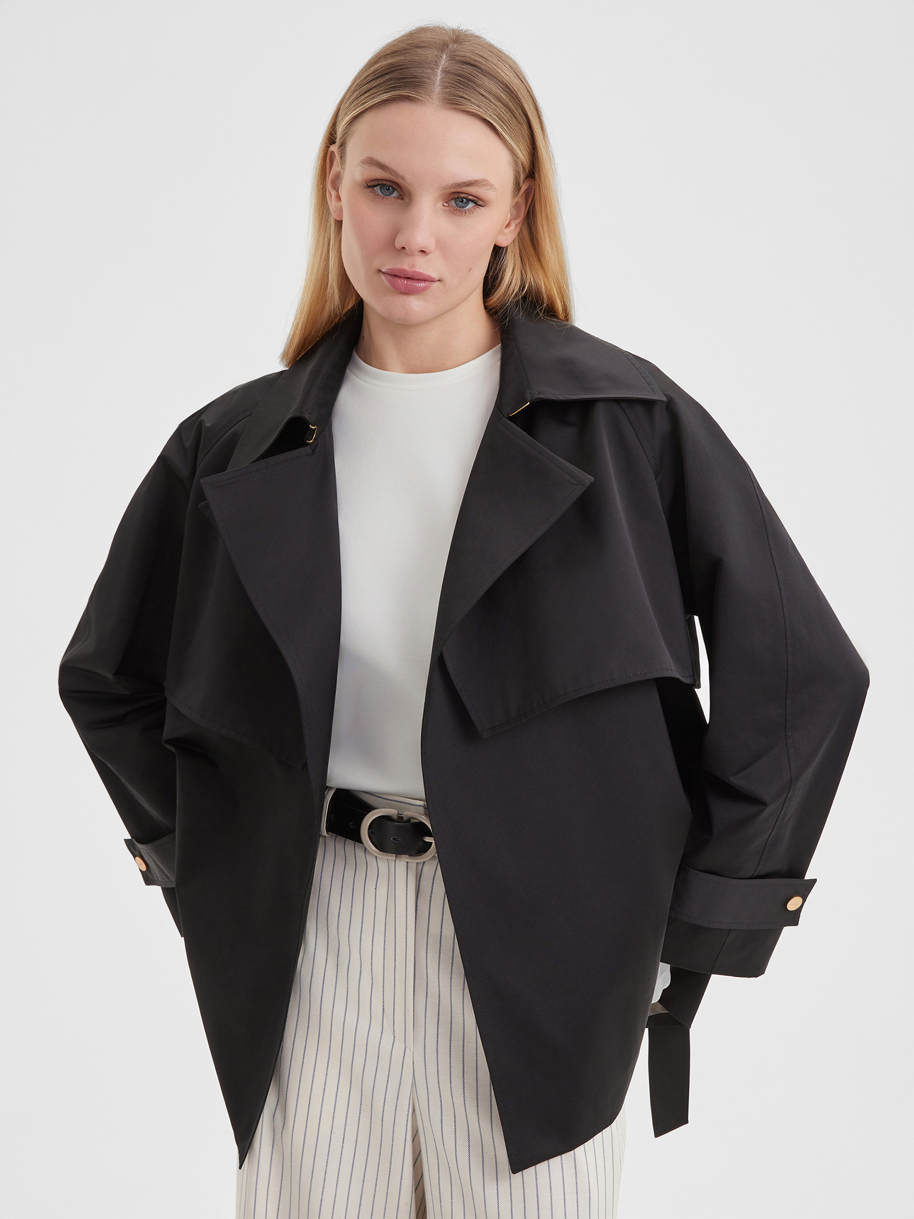 Элегантный укороченный плащ черного цвета станет идеальным дополнением к вашему гардеробу. Его свободный крой и трансформируемый воротник обеспечат комфорт в любых условиях. Элегантный пояс на талии подчеркивает фигуру, делая акцент на женственности силуэта. Укороченный плащ будет отлично смотреться как с брюками, так и с юбками, создавая стильные и универсальные образы.