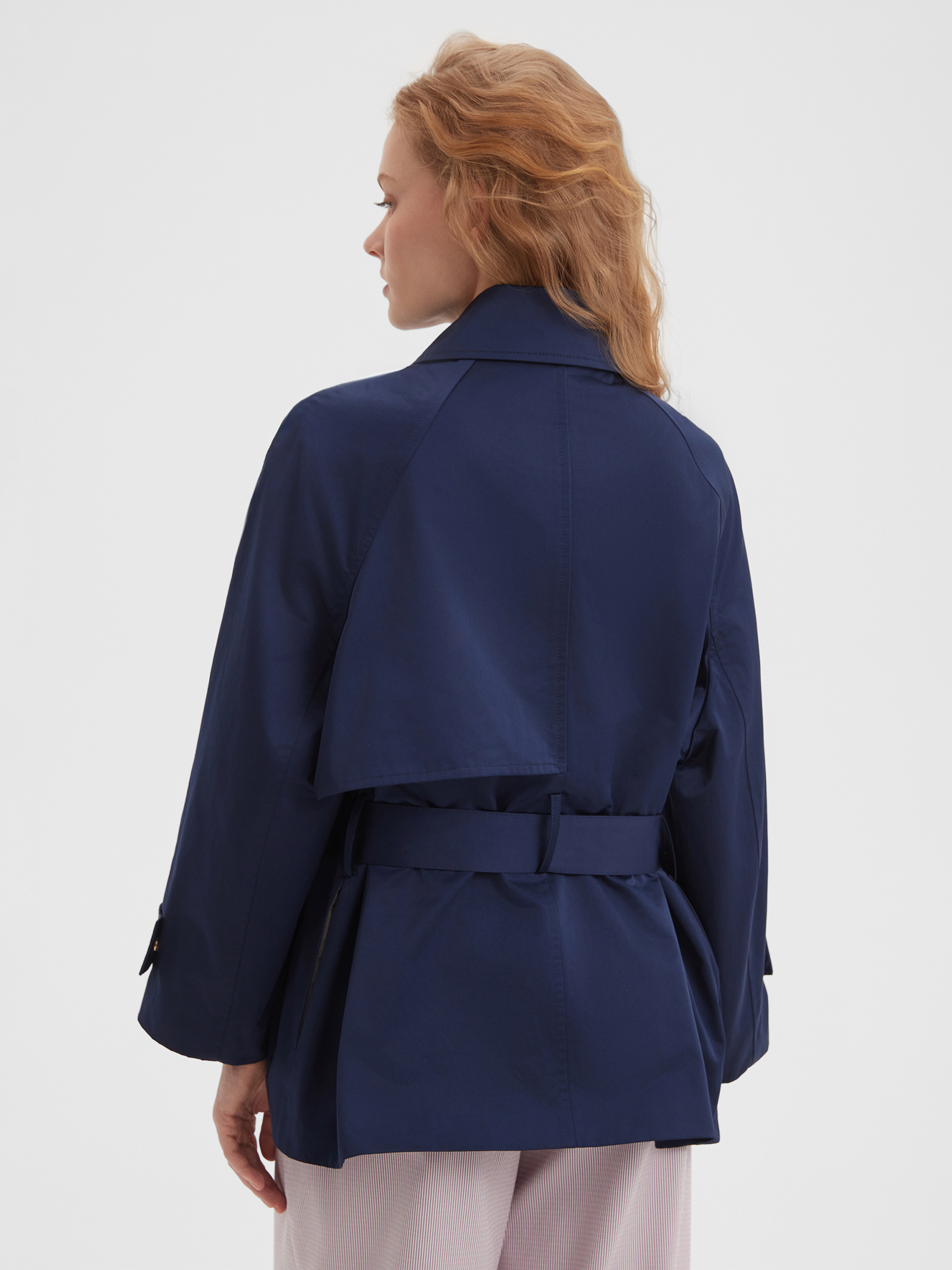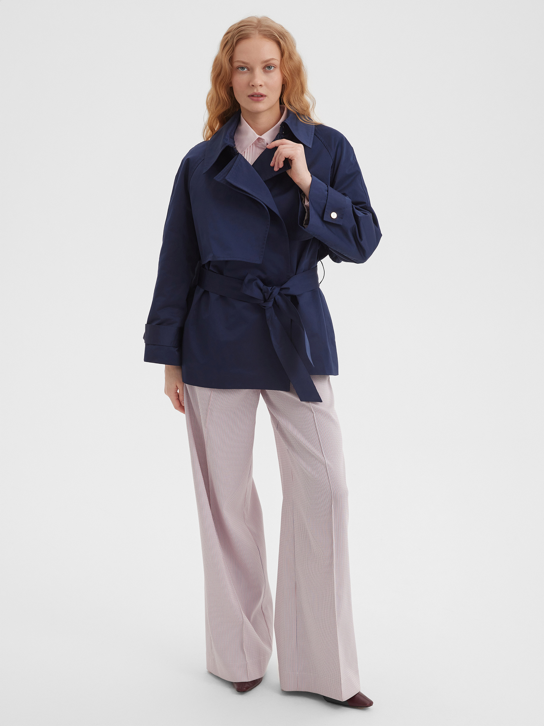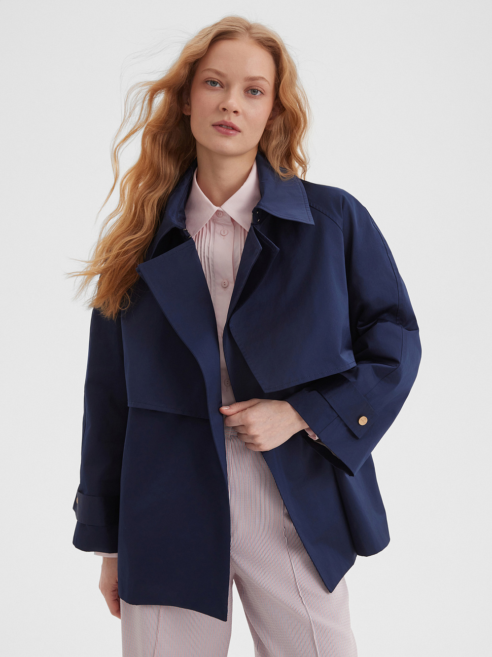 Элегантный укороченный плащ темно-синего цвета станет идеальным дополнением к вашему гардеробу. Его свободный крой и трансформируемый воротник обеспечат комфорт в любых условиях. Элегантный пояс на талии подчеркивает фигуру, делая акцент на женственности силуэта. Укороченный плащ будет отлично смотреться как с брюками, так и с юбками, создавая стильные и универсальные образы.