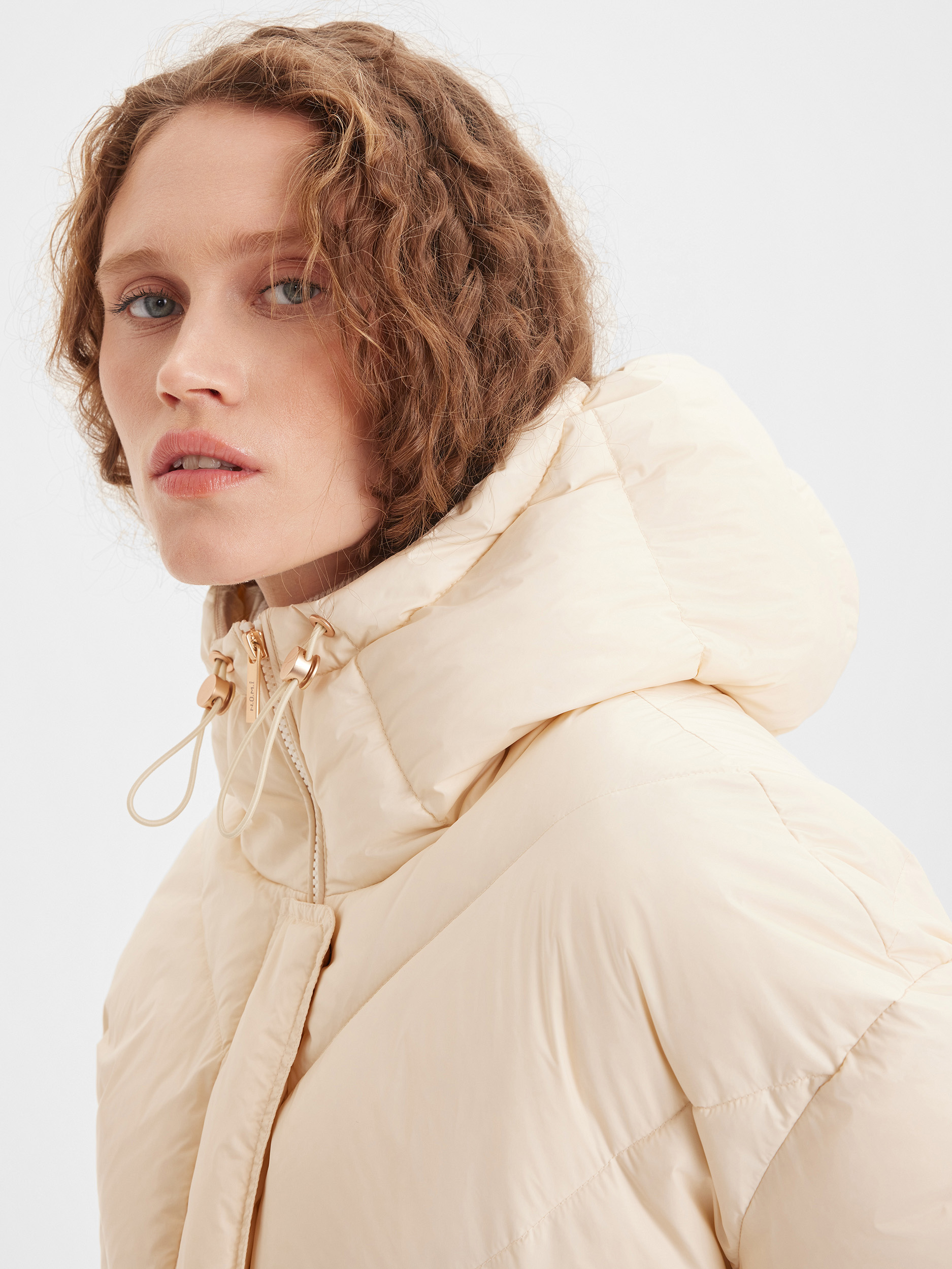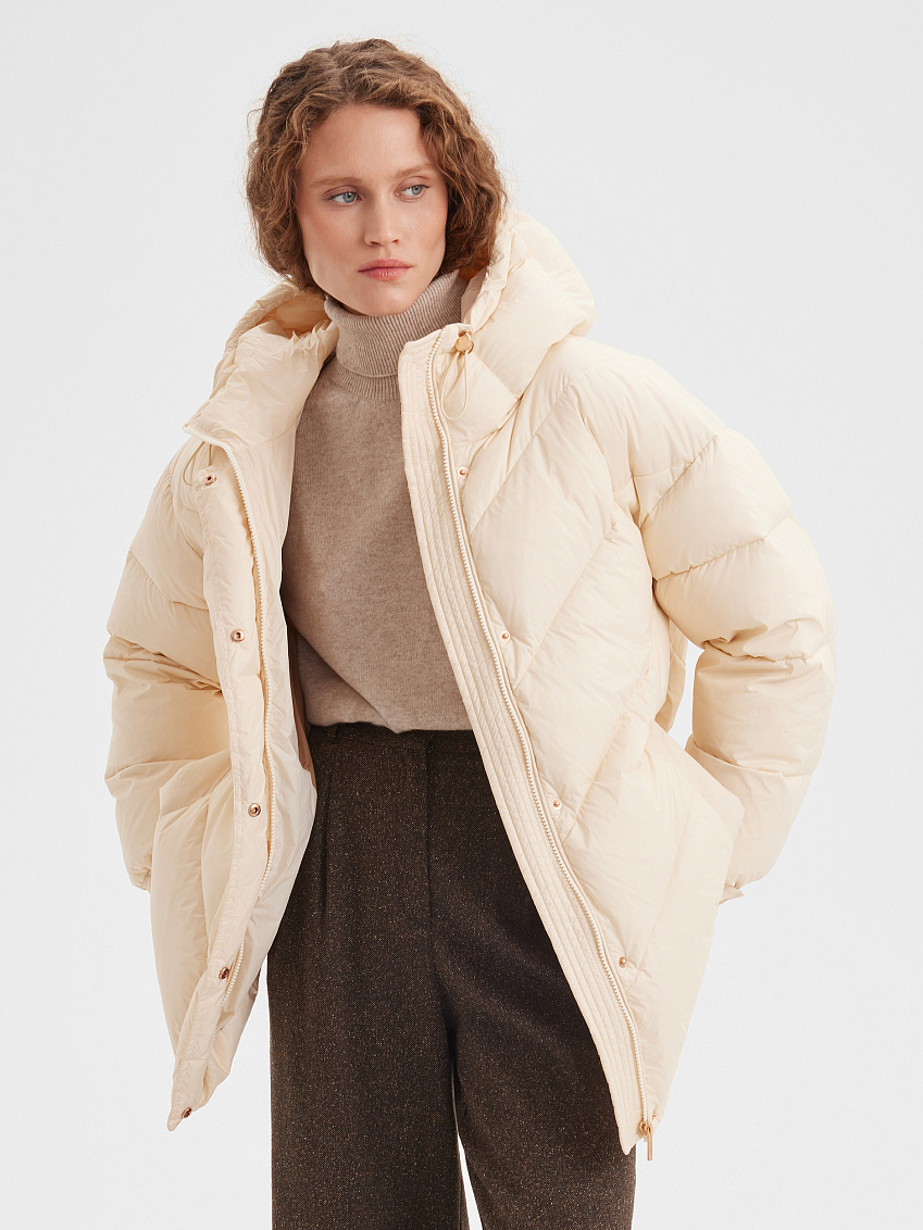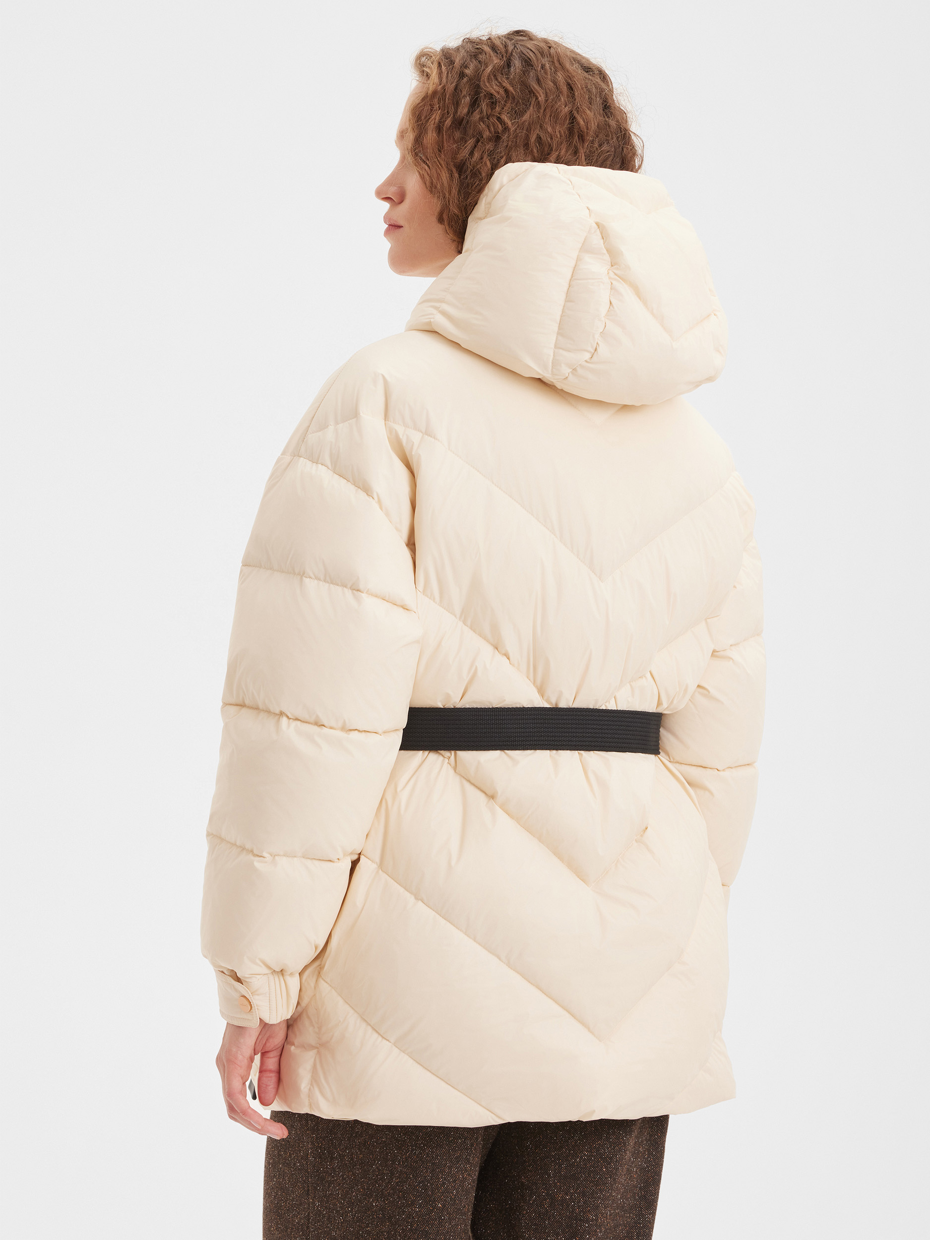 Объемный базовый пуховик с капюшоном выполнен из полуматовой ткани. Плотная набивка из премиального утиного пуха прекрасно согревает. Необычная стежка делает силуэт легким. Регулируемые сборка по низу изделия и манжеты обеспечивают ветрозащиту. Объемный капюшон с высокой стойкой защищает от холода и ветра. Куртка прекрасно впишется в любой гардероб. Пояс в комплекте.