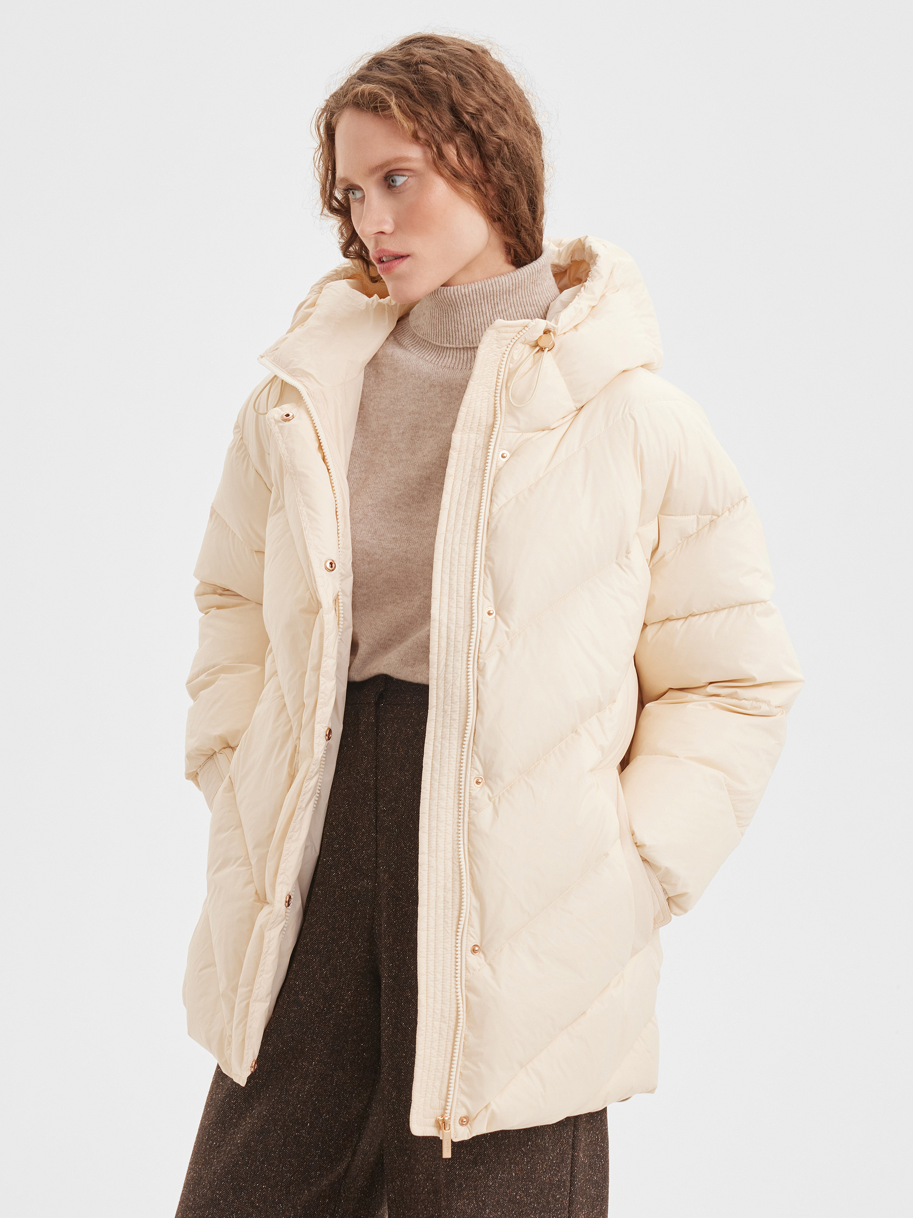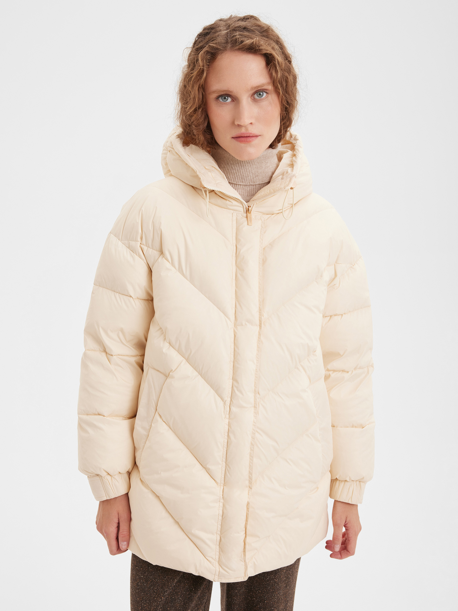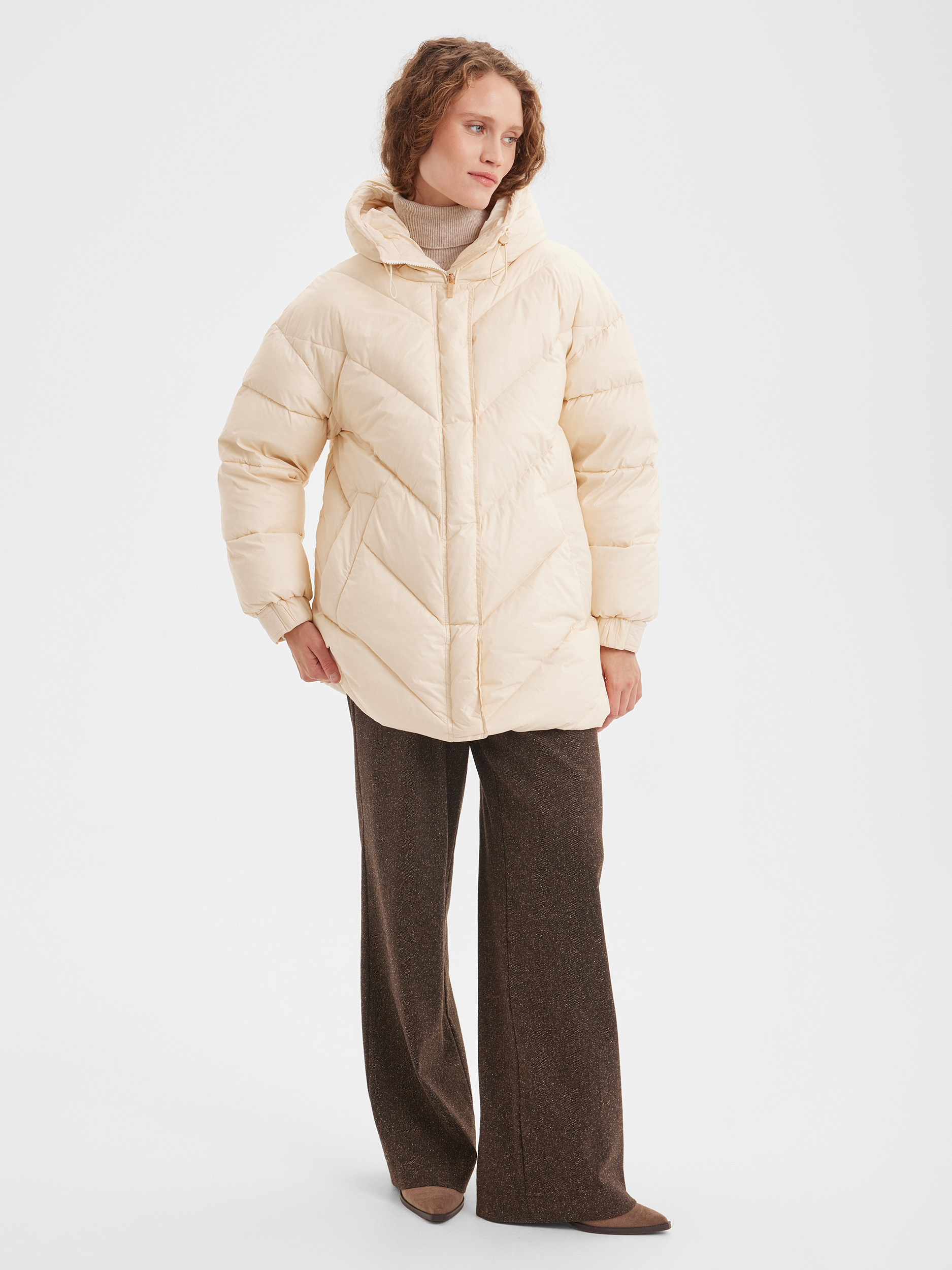 Объемный базовый пуховик с капюшоном выполнен из полуматовой ткани. Плотная набивка из премиального утиного пуха прекрасно согревает. Необычная стежка делает силуэт легким. Регулируемые сборка по низу изделия и манжеты обеспечивают ветрозащиту. Объемный капюшон с высокой стойкой защищает от холода и ветра. Куртка прекрасно впишется в любой гардероб. Пояс в комплекте.