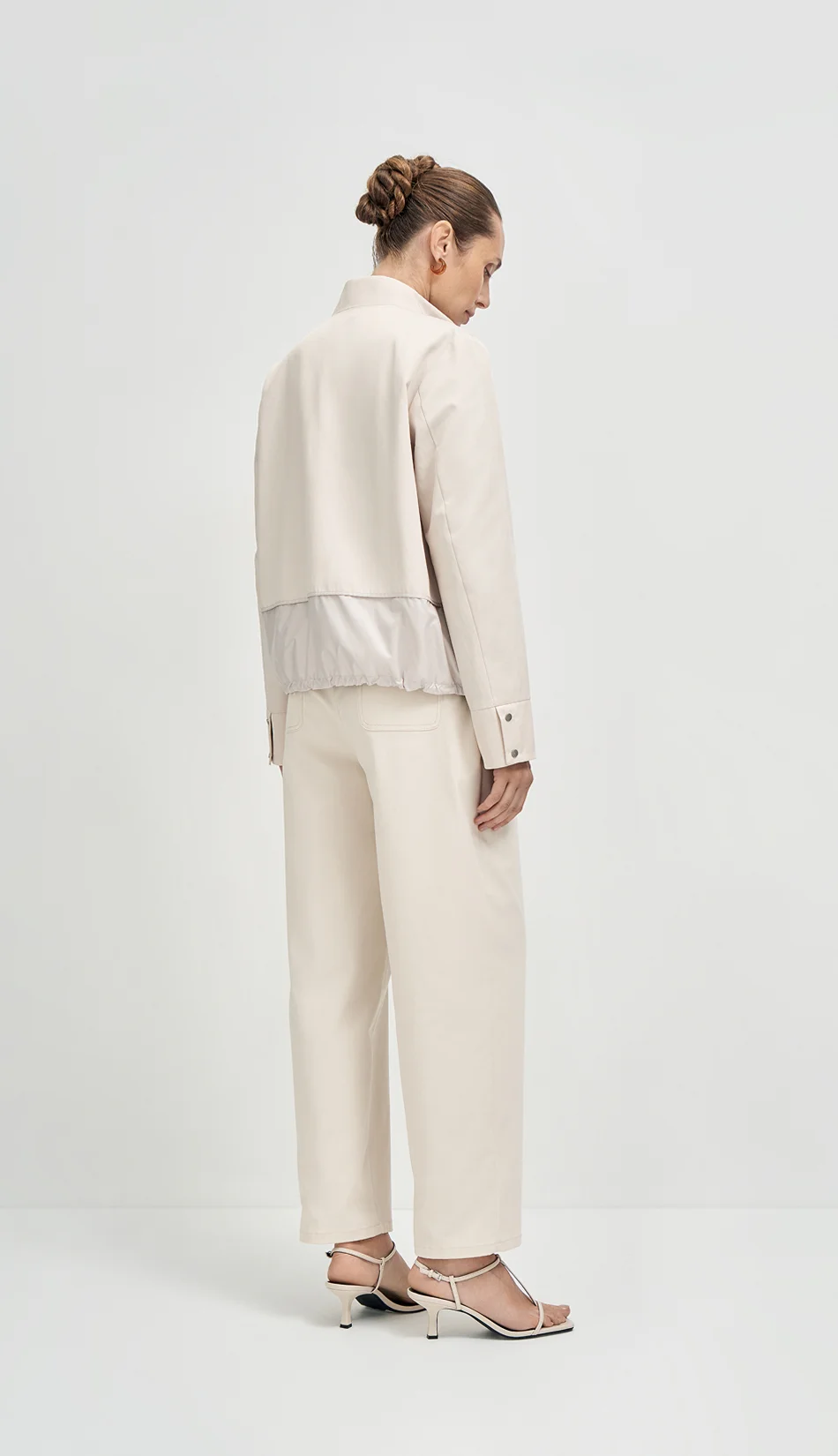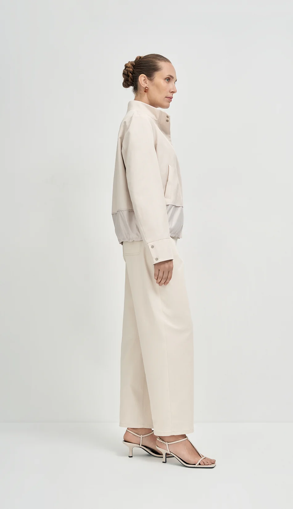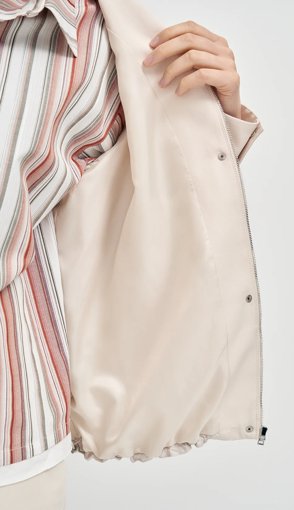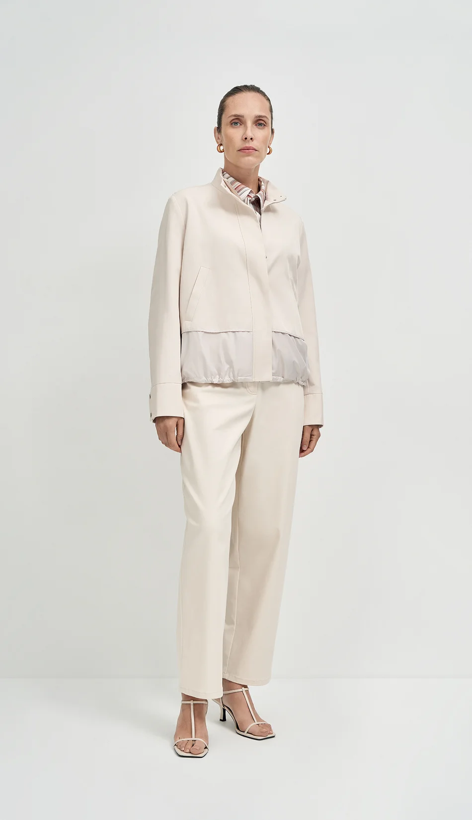 Ветровка прямого силуэта с воротником-стойкой из тканей-компаньонов с разной фактурой: ткань верхней части куртки с высоким содержанием хлопка, ткань нижней части – невесомая водонепроницаемая плащевая ткань. Куртка на поливискозной подкладке.