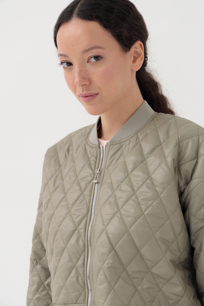 Куртка выполнена из ромбовидной стежки и имеет свободный силуэт. Застежка на молнию, спущенная линия плеча, воротник-стойка из подвяза, карманы на потайной молнии, по низу изделия регулируемый эластичный шнур. Куртка на подкладке. Легкий наполнитель на синтепоне согреет в раннюю весну.