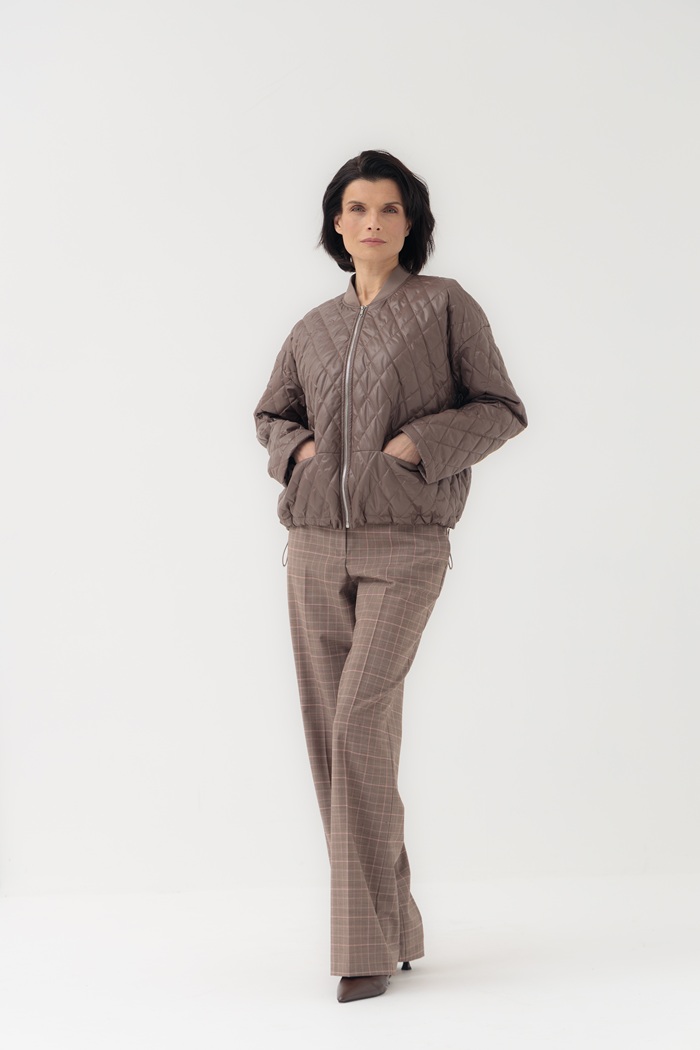 Куртка выполнена из ромбовидной стежки и имеет свободный силуэт. Застежка на молнию, спущенная линия плеча, воротник-стойка из подвяза, карманы на потайной молнии, по низу изделия регулируемый эластичный шнур. Куртка на подкладке. Легкий наполнитель на синтепоне согреет в раннюю весну.