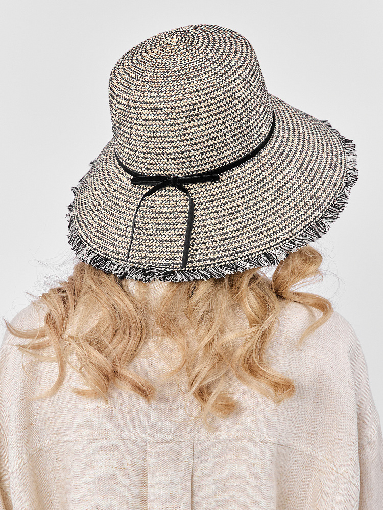 Элегантная летняя женская шляпа итальянского бренда FABRETTI.Шляпа-абажур - классическая летняя модель с опущенными длинными полями прекрасно защищает от солнца и придает образу романтичную загадочность. Шляпка выполнена в монохромном дизайне из плетеной соломки и украшена узкой бархатной лентой на тулье и бахромой по краю полей. Внутри размер регулируется лентой.Панама изготовлена из целлюлозы с добавлением искусственных волокон для прочности.Этот легкий «дышащий» материал хорошо сохраняет форму и цвет. Прекрасно сочетается с любым летним гардеробом.