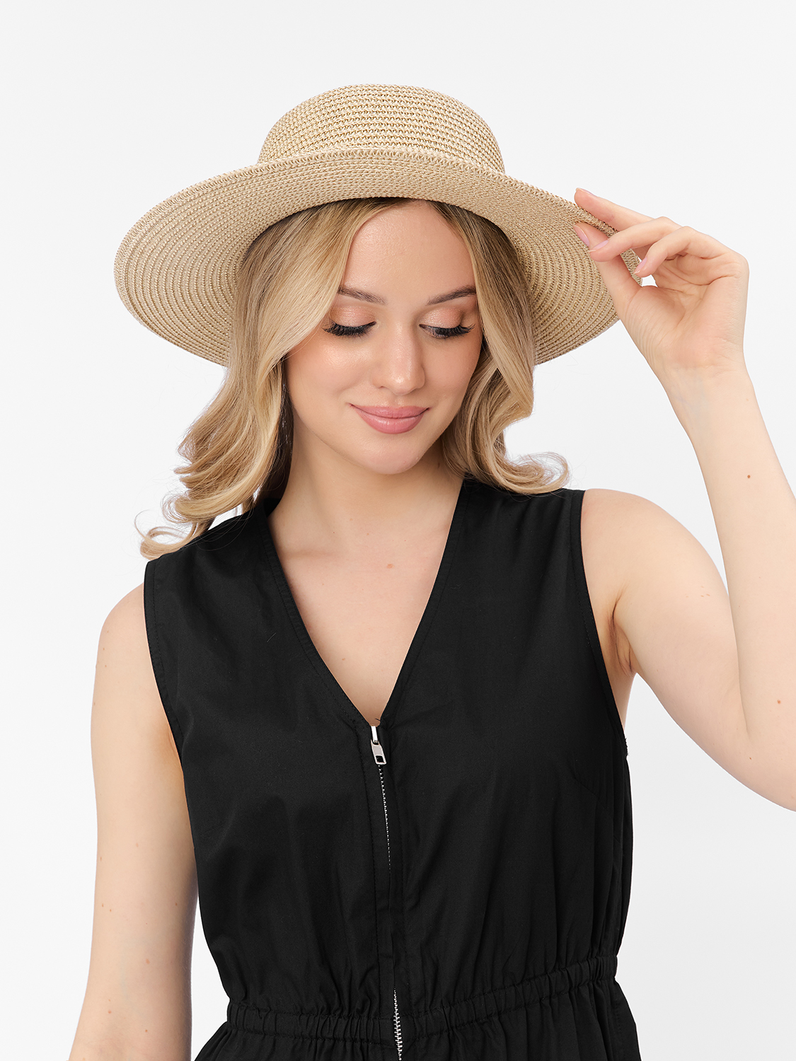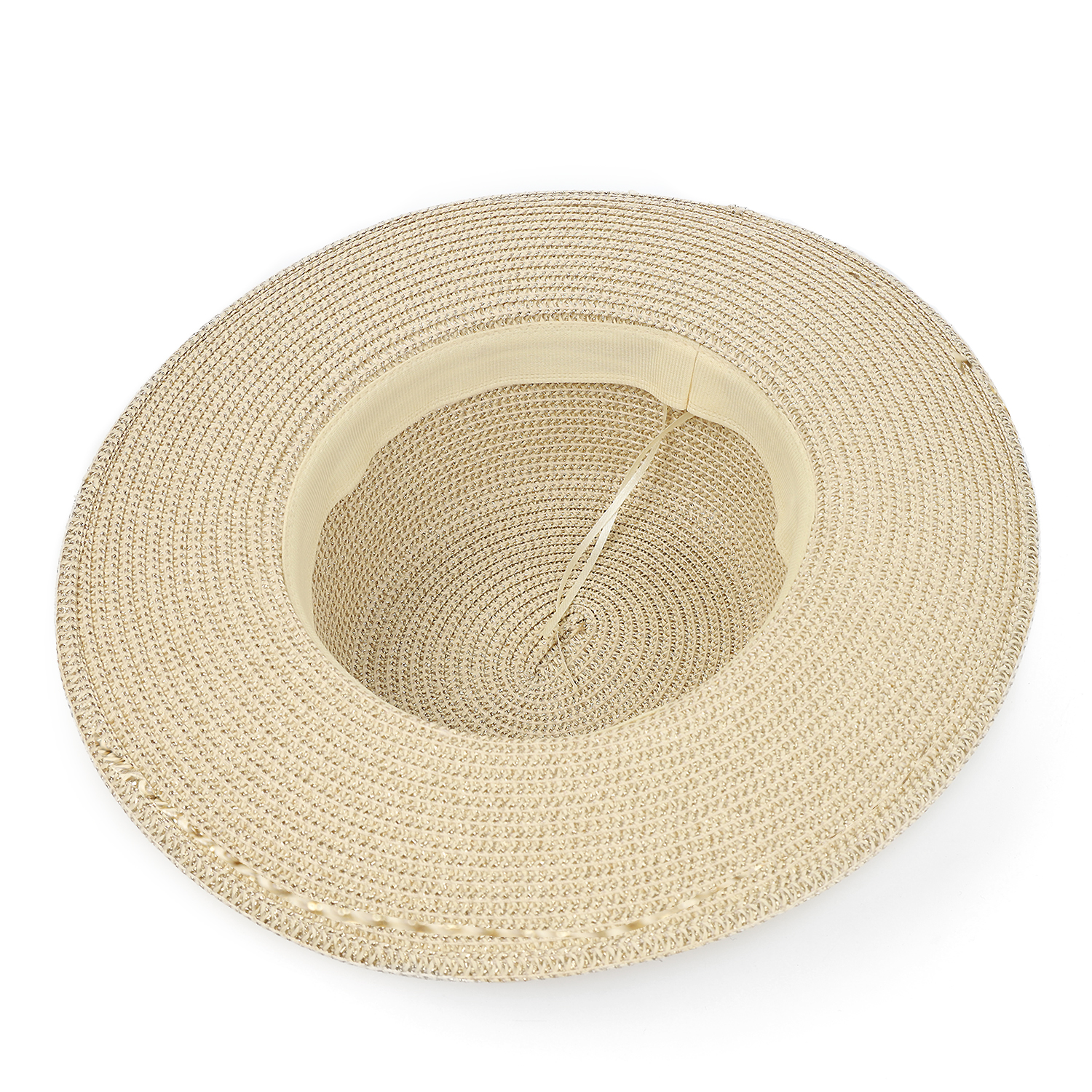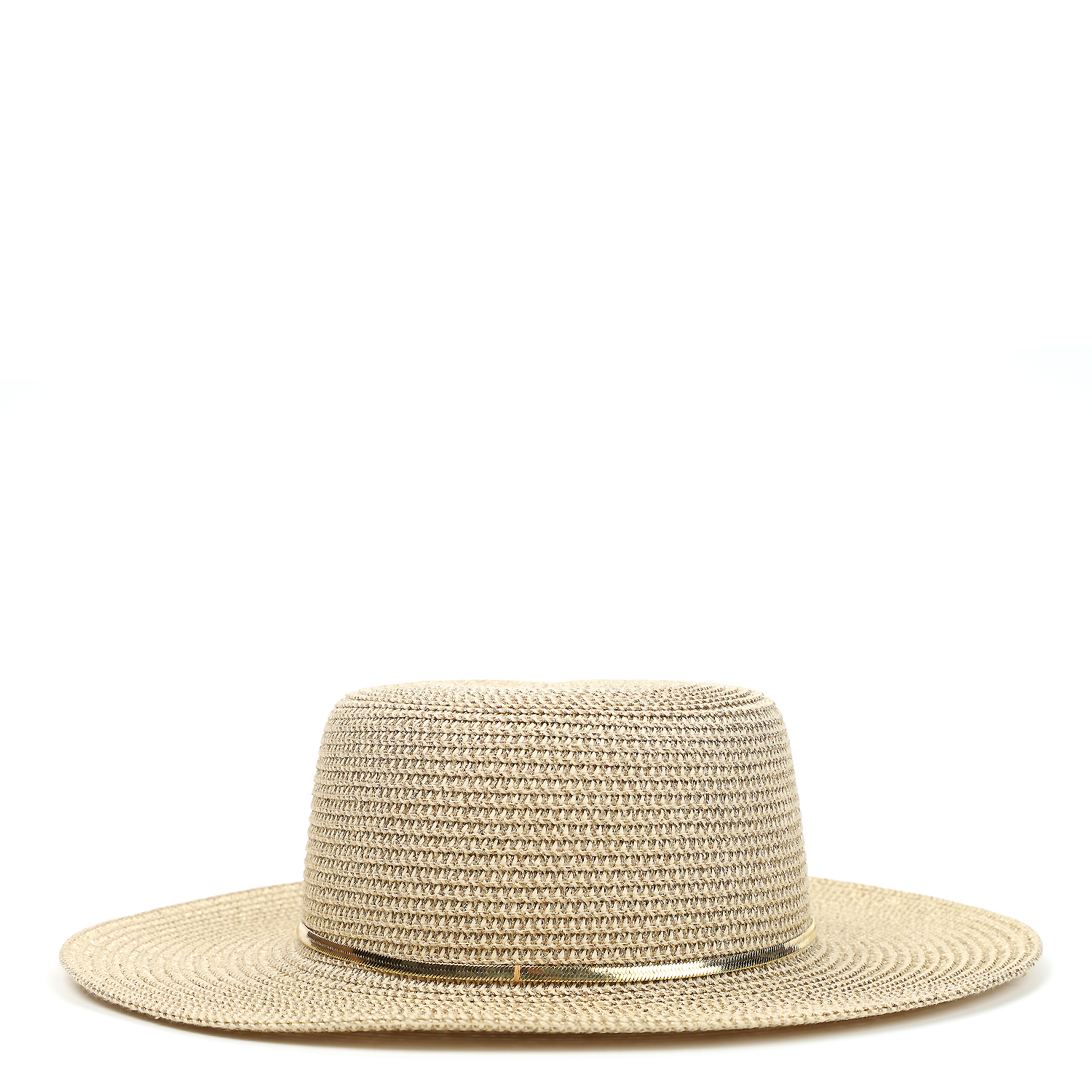 Необычная женская шляпа итальянского бренда FABRETTI в бежевом цвете. Эта шляпа-флоппи буквально сияет на солнце благодаря добавлению к соломке из целлюлозы блестящих люрексовых нитей. У шляпы поля средней длины, тулья украшена плоской съемной металлической цепочкой. Внутри размер шляпы регулируется лентой.